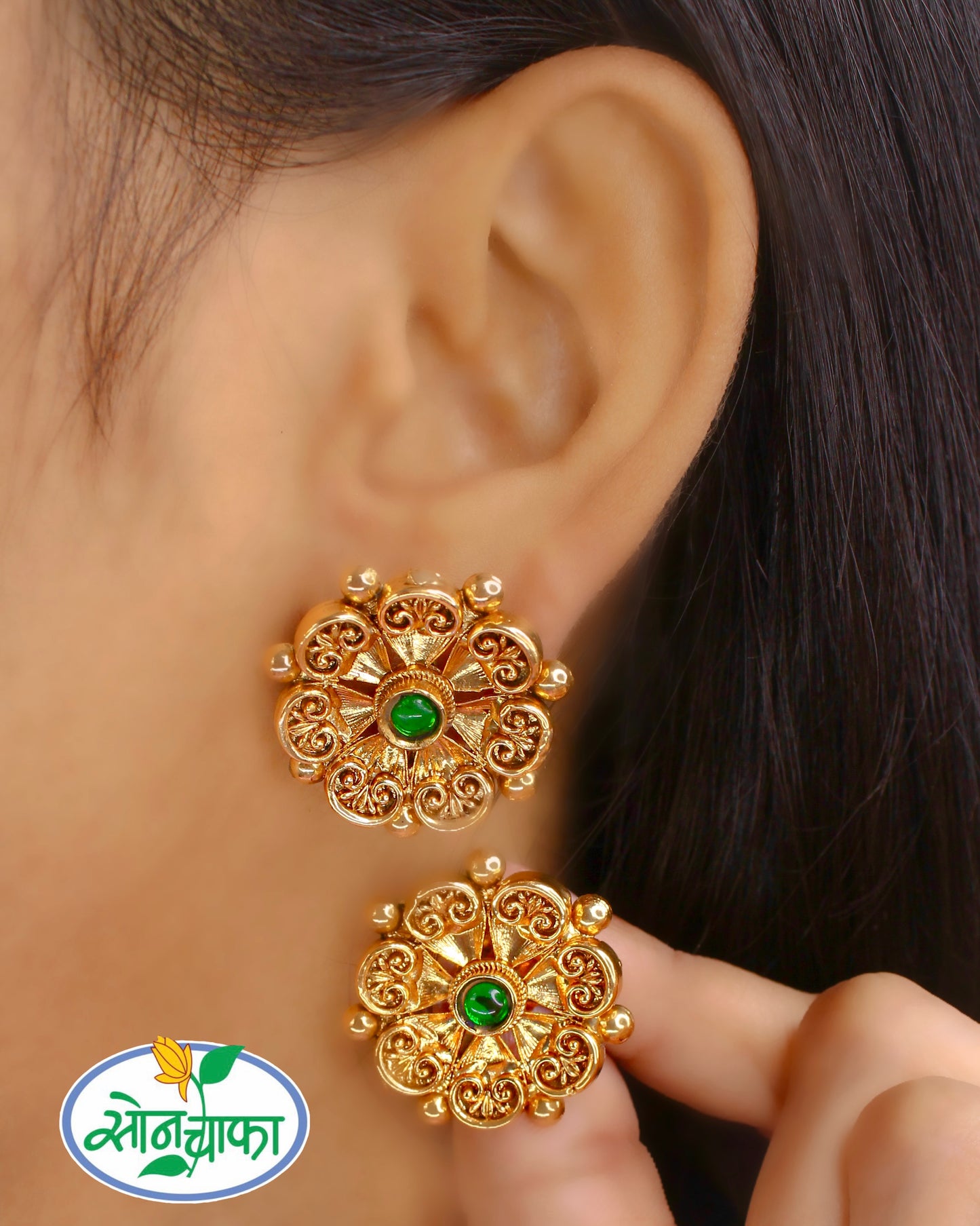 Must have in your jewellery drawer this appealing pair of beautiful earrings from sonchafa Jeweallery. They are studded with peach stone along with multi colour stone and made from golden finished metal. These dazzling earrings are good in quality and skin-friendly as well.