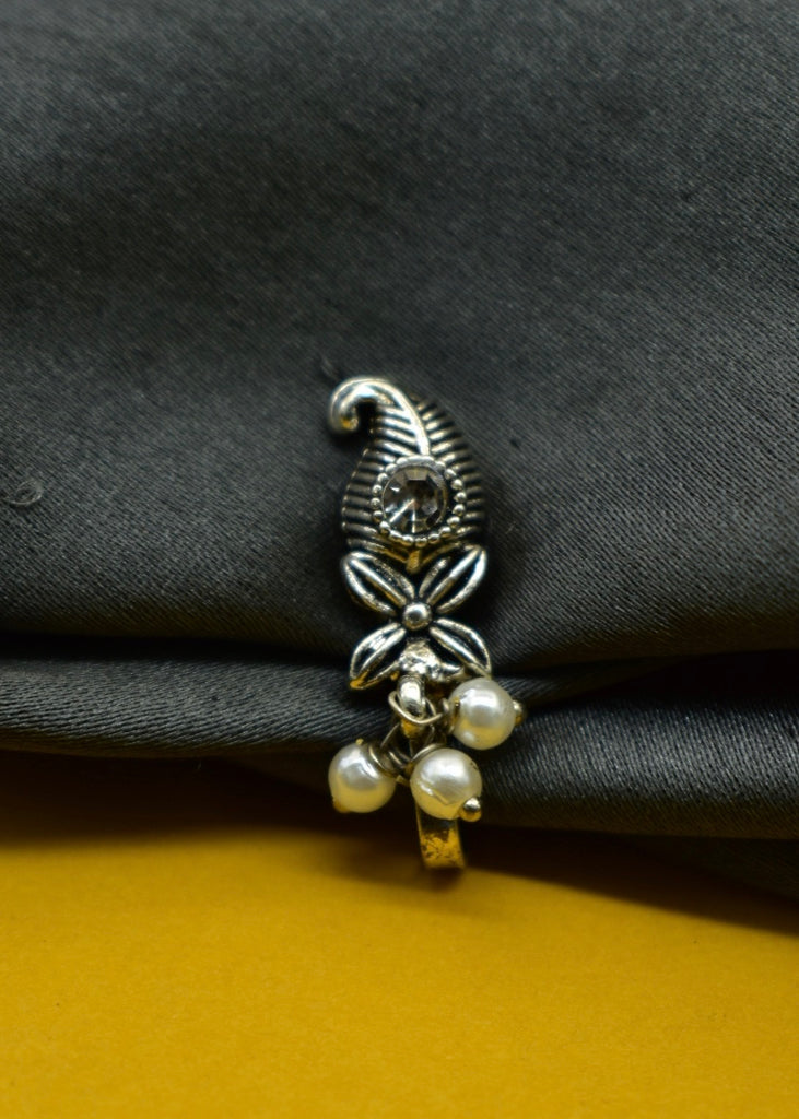 Stylish kuyri designer nose pin from Sonchafa jewellery it is perfect suitable for saree or traditional outfits. It is styled with studded pink and white colour stone and made from oxidised finish metal. This nath is woven with good quality pearls beads & easy to wear nath.