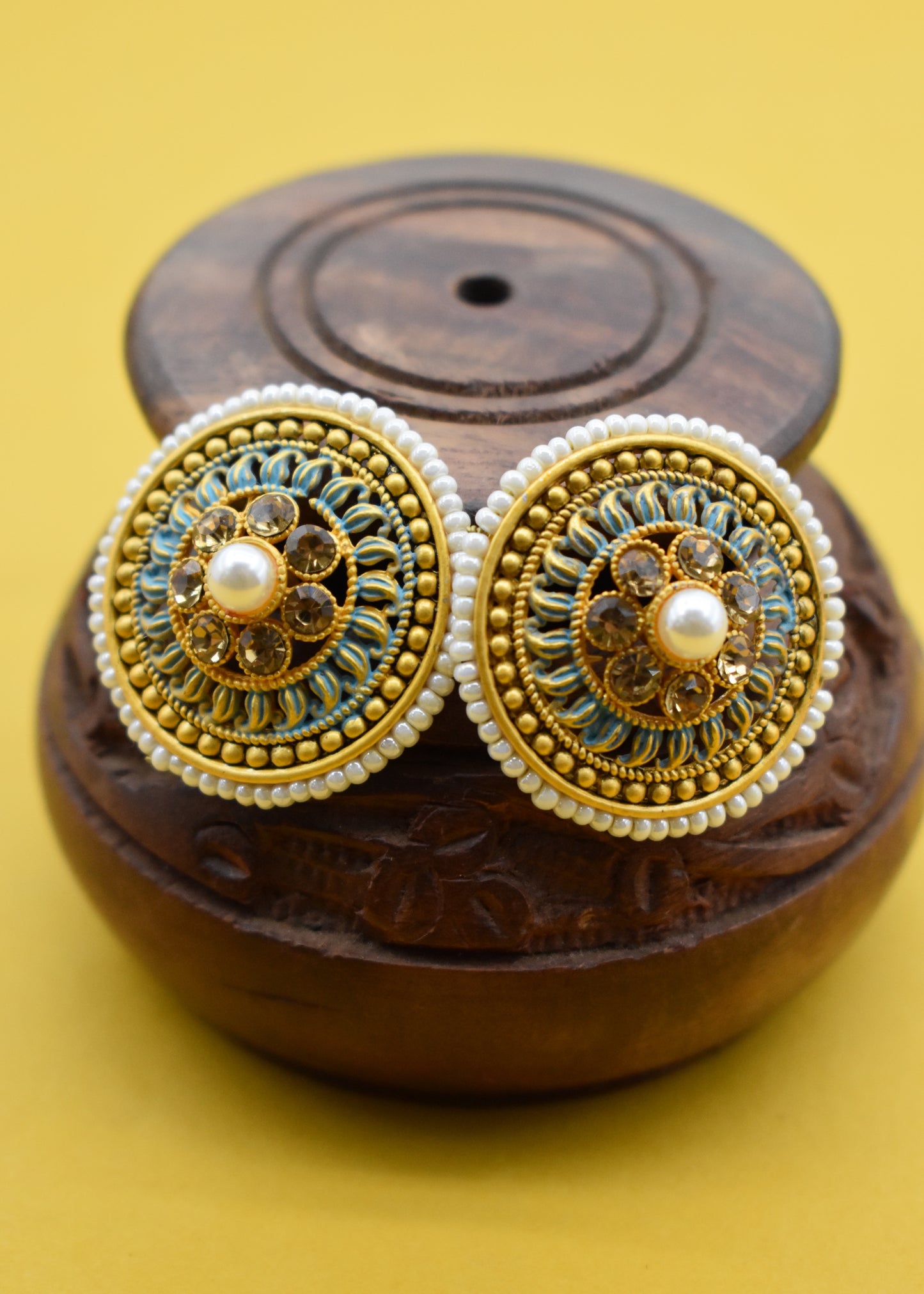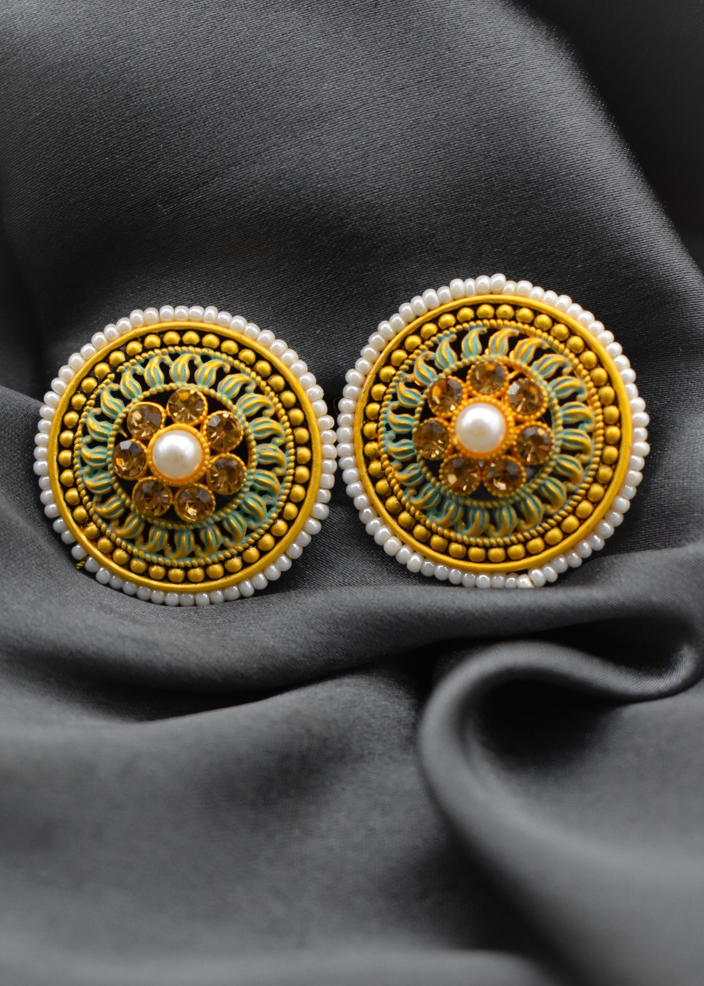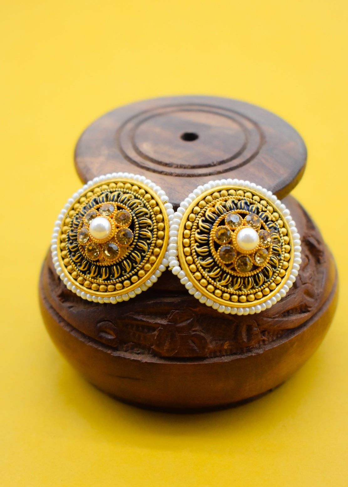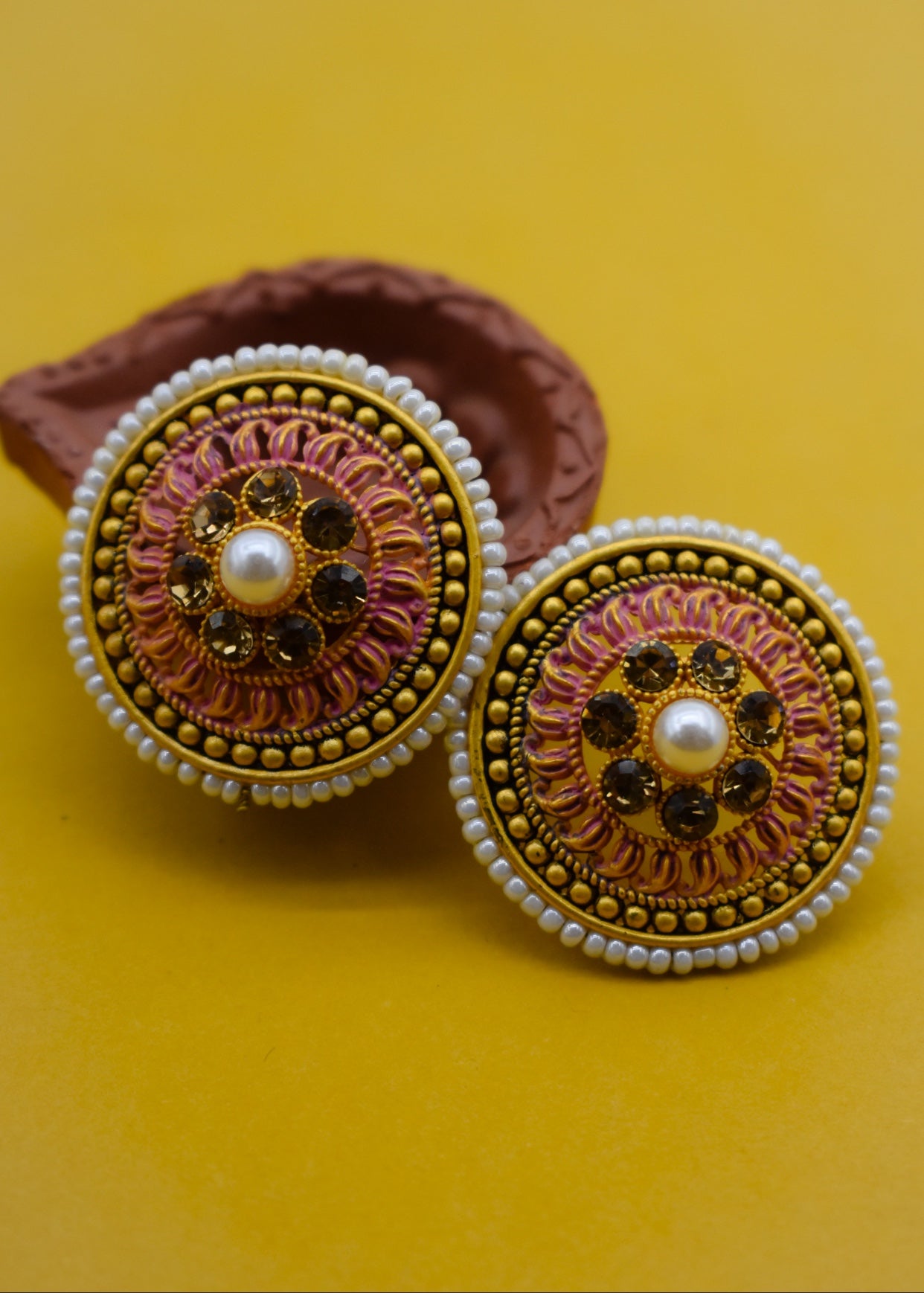If you searching these droplet design wonderful traditional earrings from Sonchafa Jewellery for stylish girl like you. It is styled with studded shimmering peach stone along with pearls beads and made from antique finish metal.