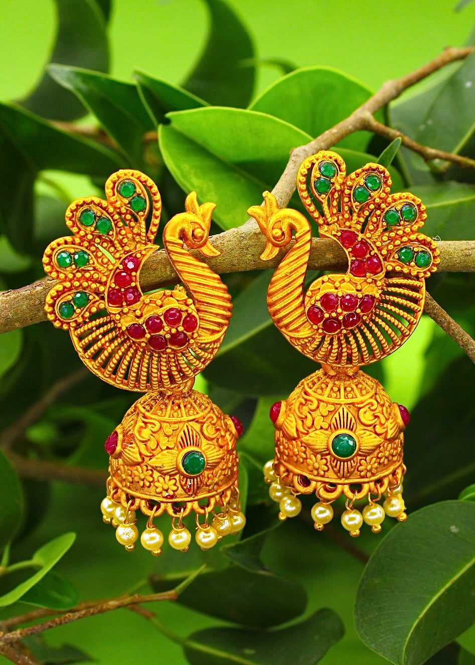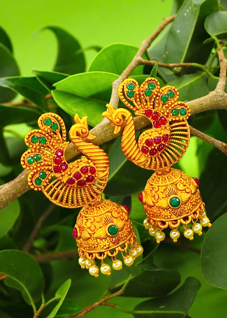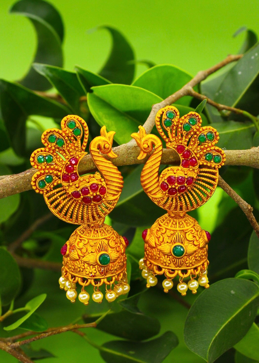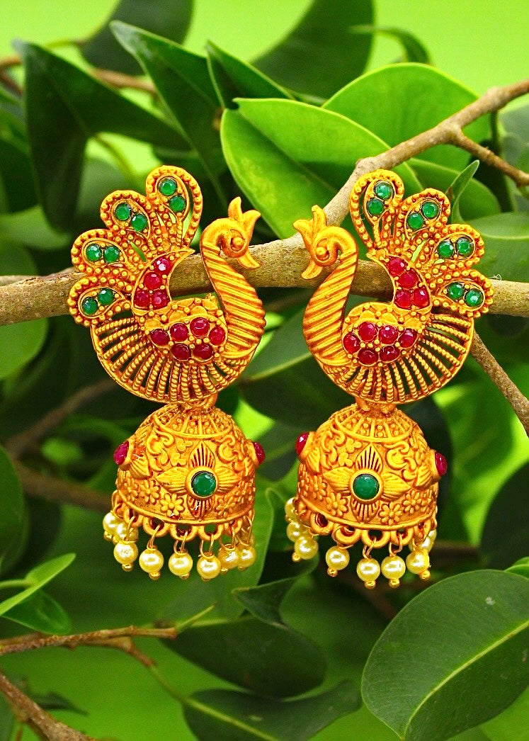 Have a look at this amazing matte gold finish earring from Sonchafa Jewellery. These peacock designer earring are made from matte finish metal and it is studded with pink and green stone.
