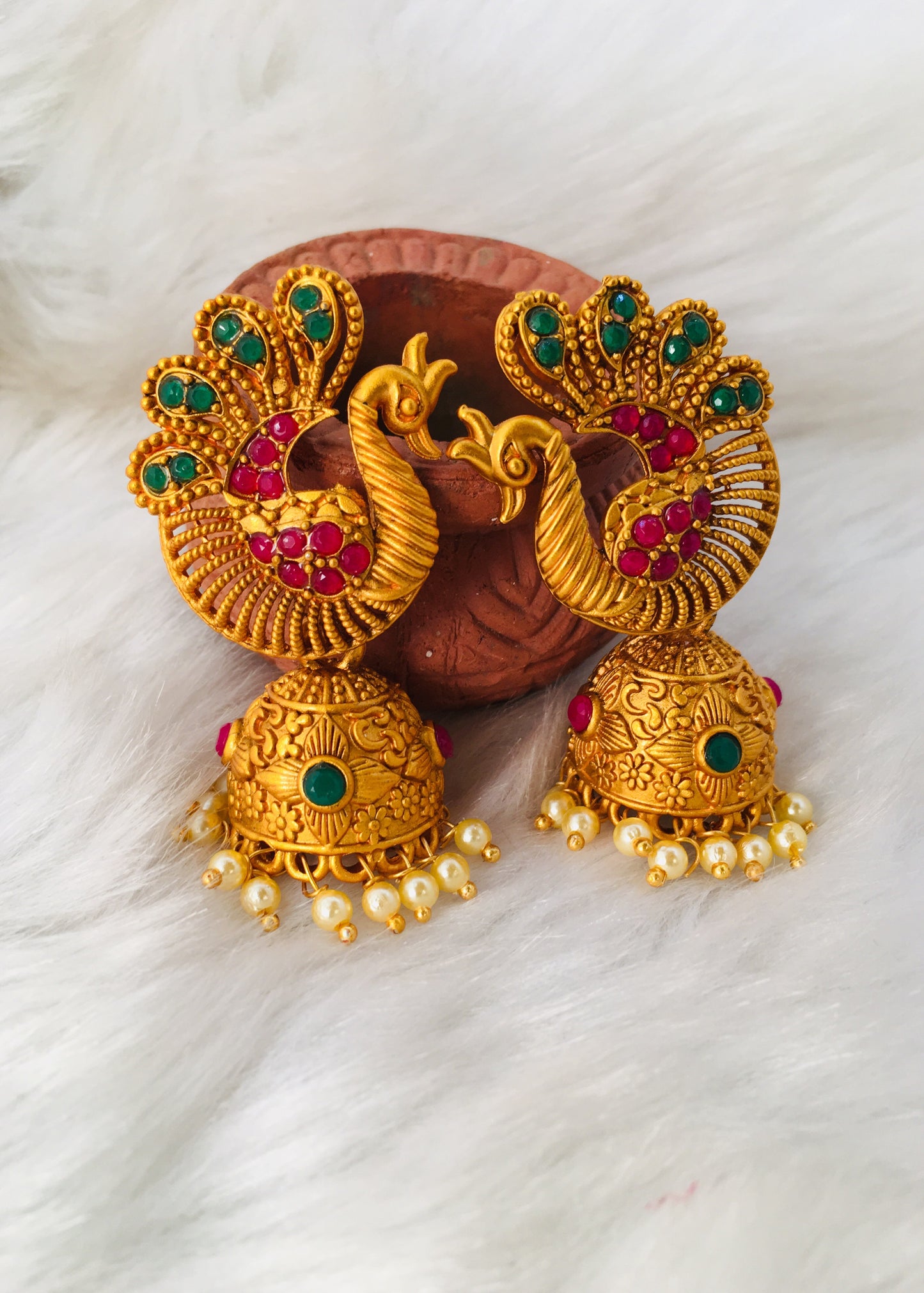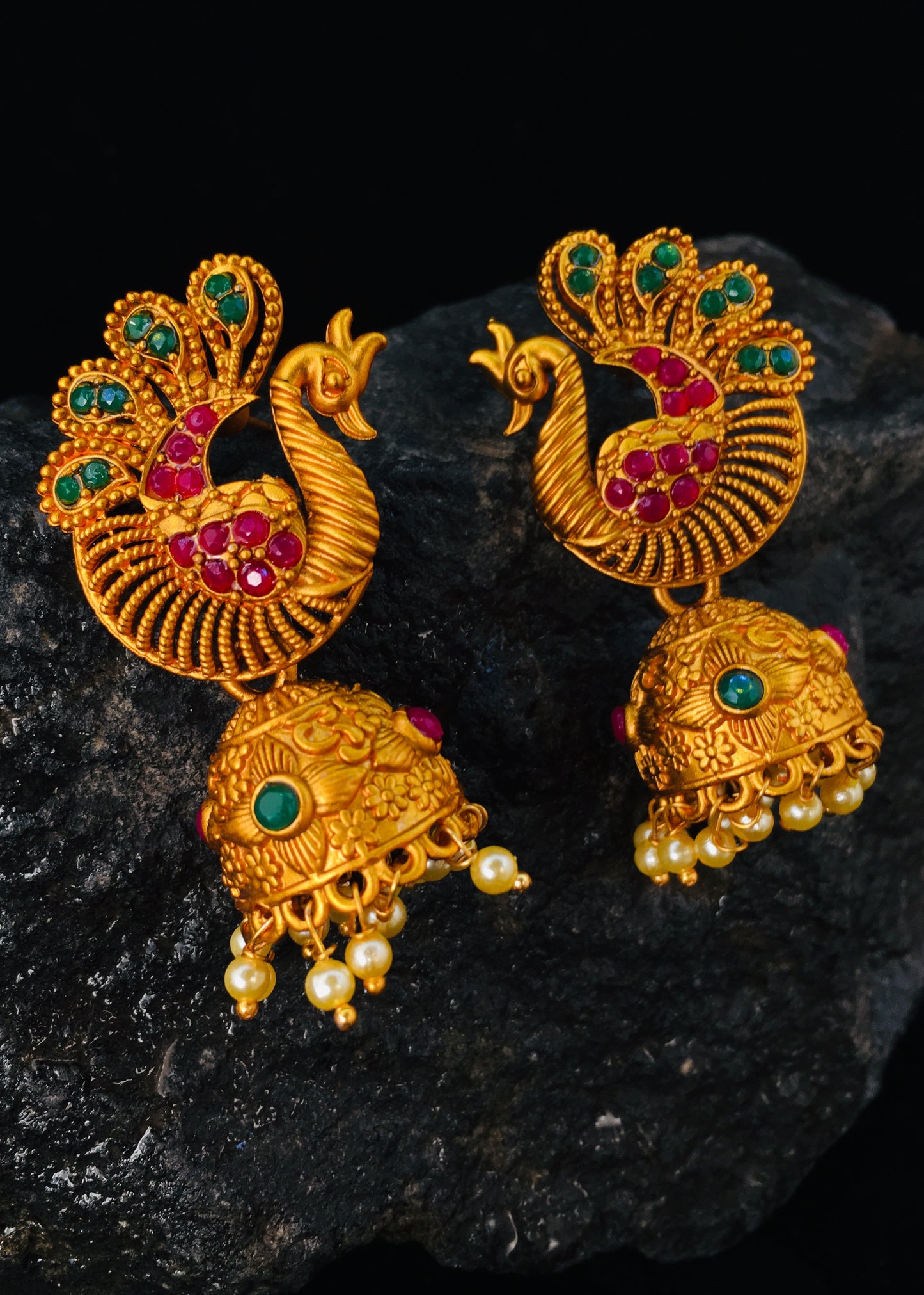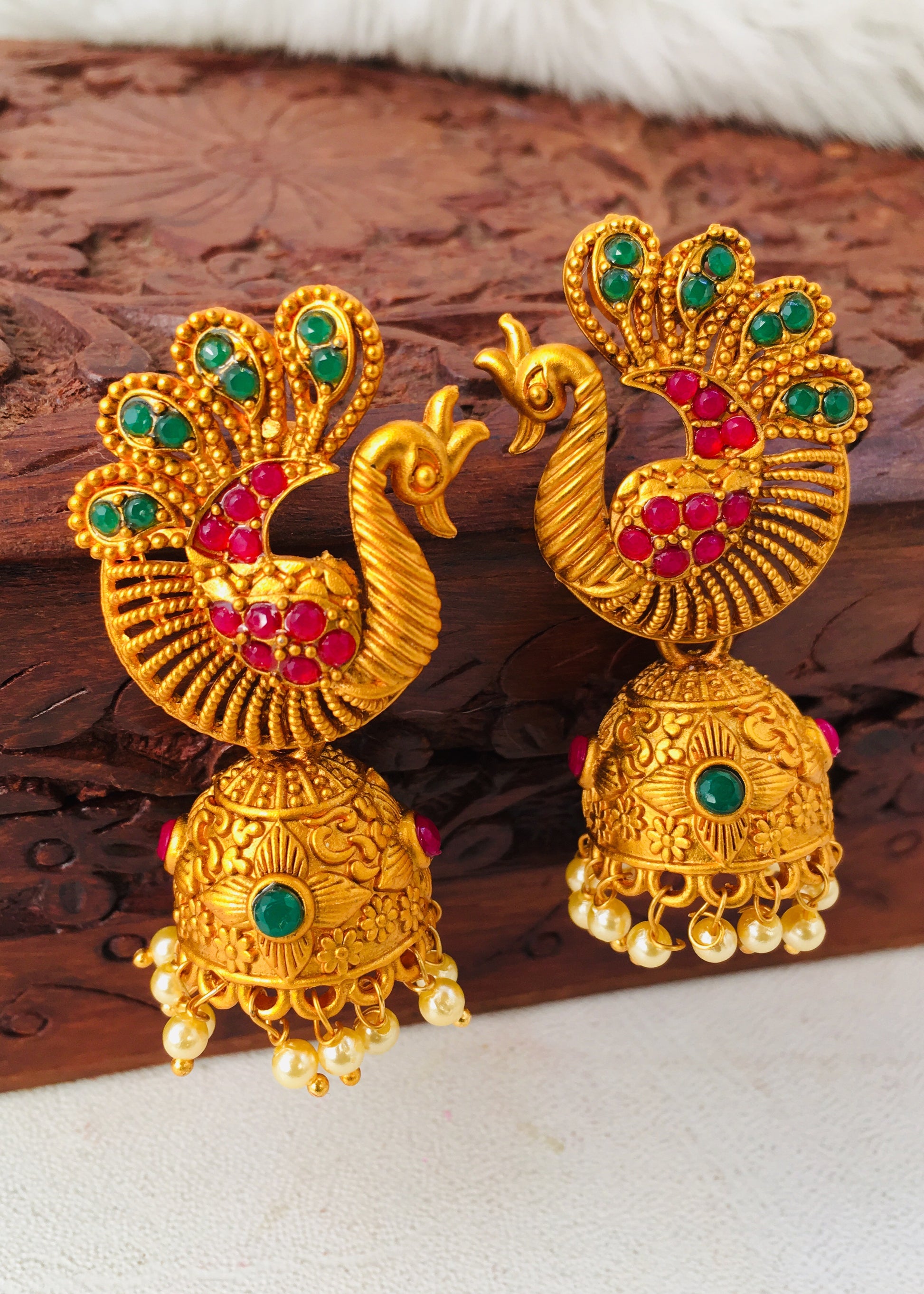 Have a look at this amazing matte gold finish earring from Sonchafa Jewellery. These peacock designer earring are made from matte finish metal and it is studded with pink and green stone.