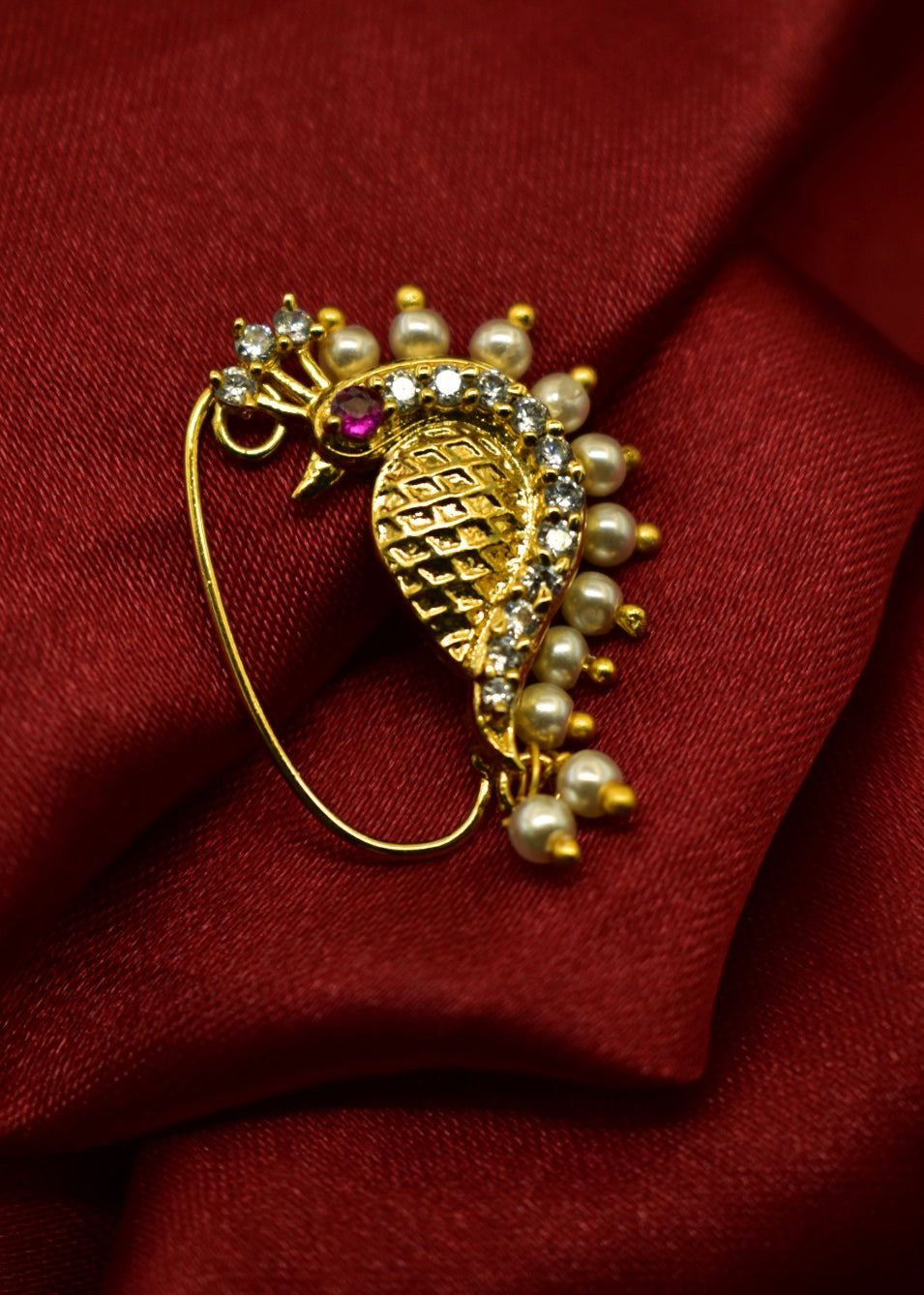 Look your best on festive occasion by wearing this pretty Peacock nath with your traditional costumes and get that perfect look. It is embedded with sparkling pink -green stone and woven with pearl beads. This metal crafted nath is easy to wear and press on