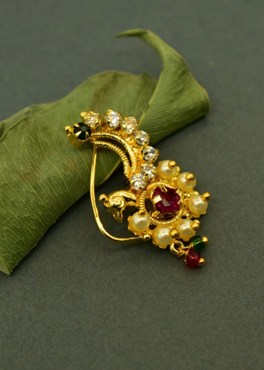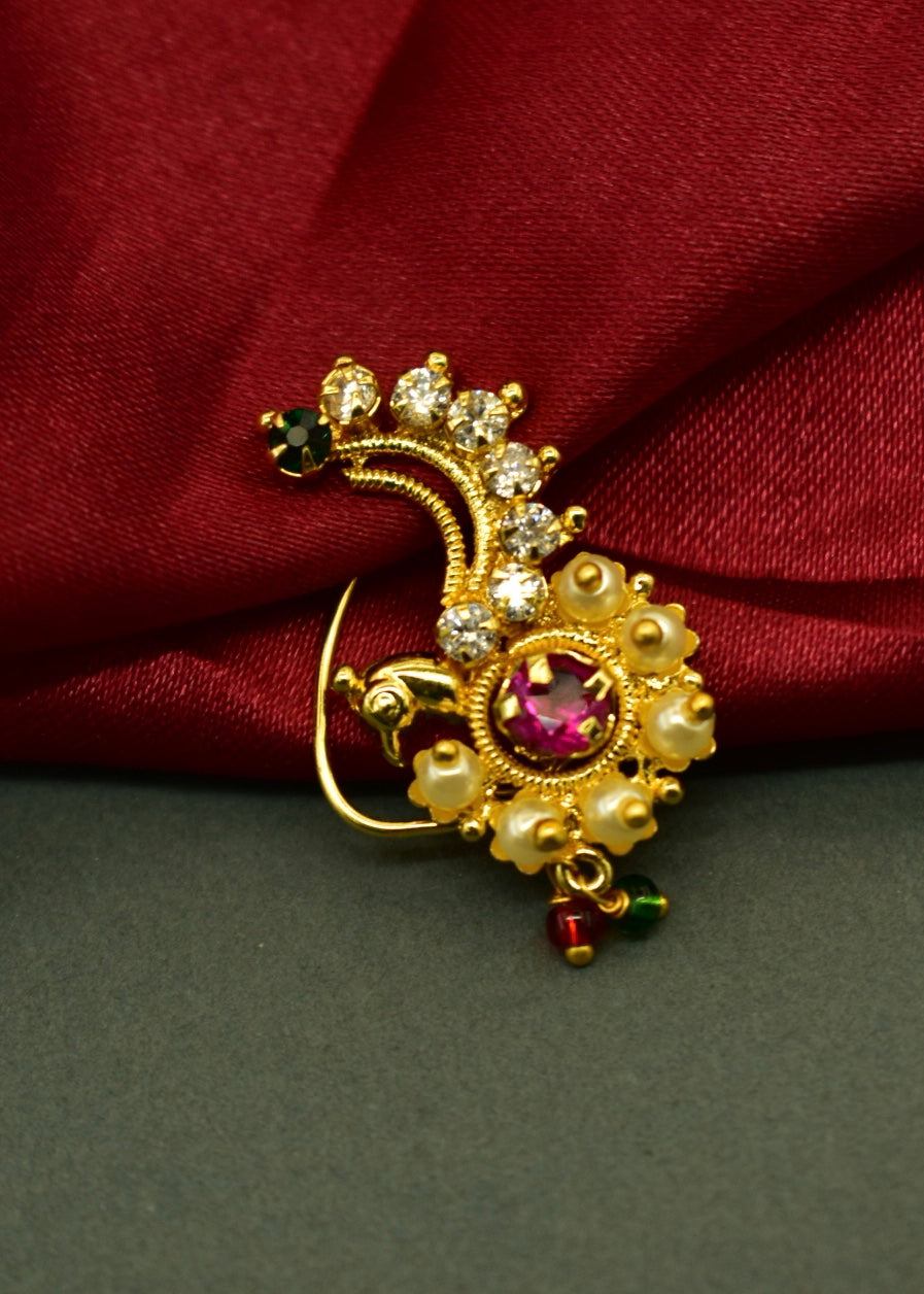Look stylish by adorning this gold finish pink colour beautiful nath in which feature wonderful intricate carving design. It is made from metal and ensures skin-friendliness. This beautiful nath is easy to wear as it is press on.