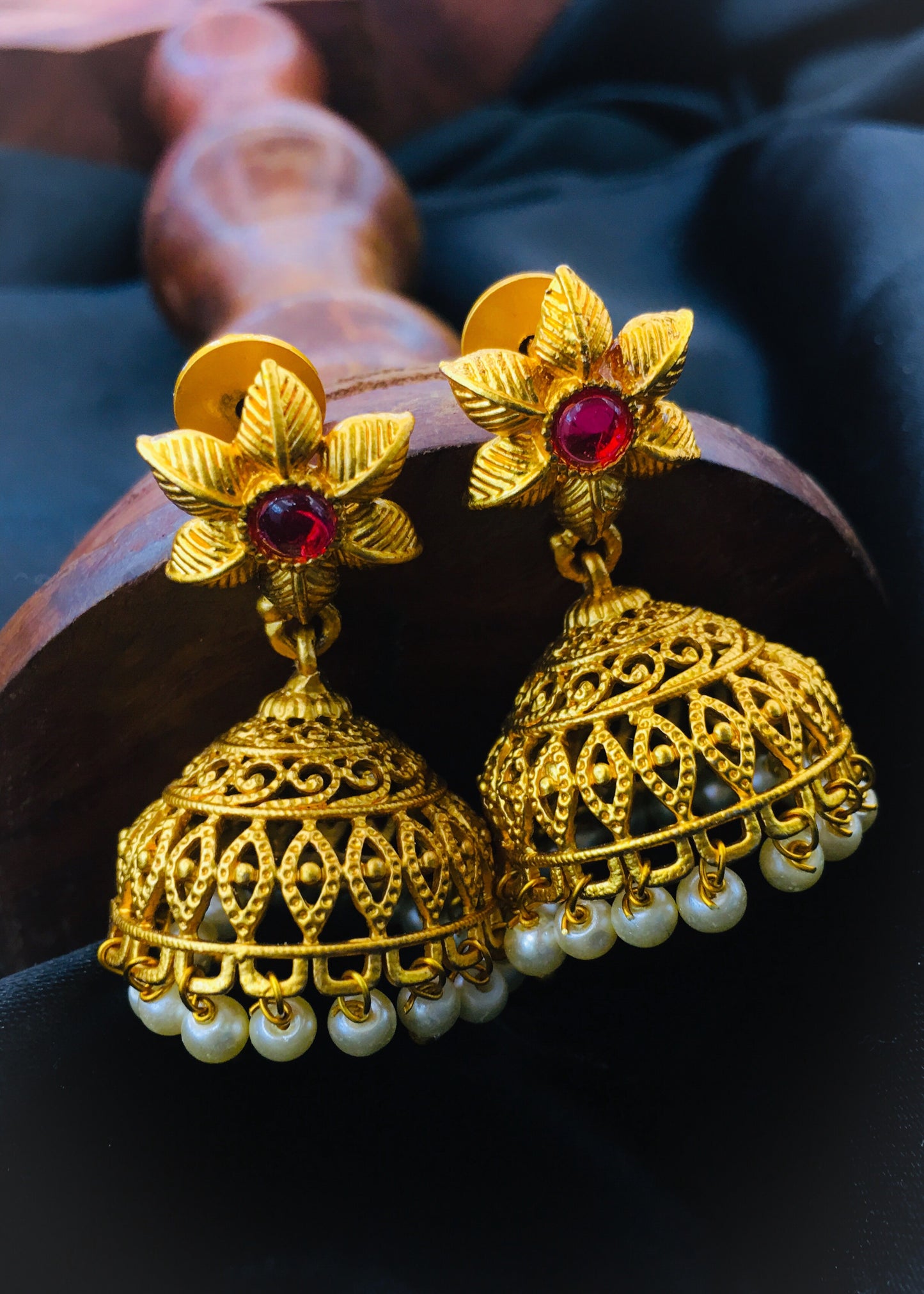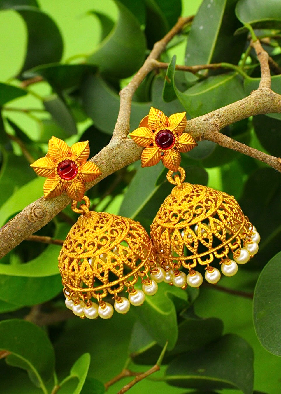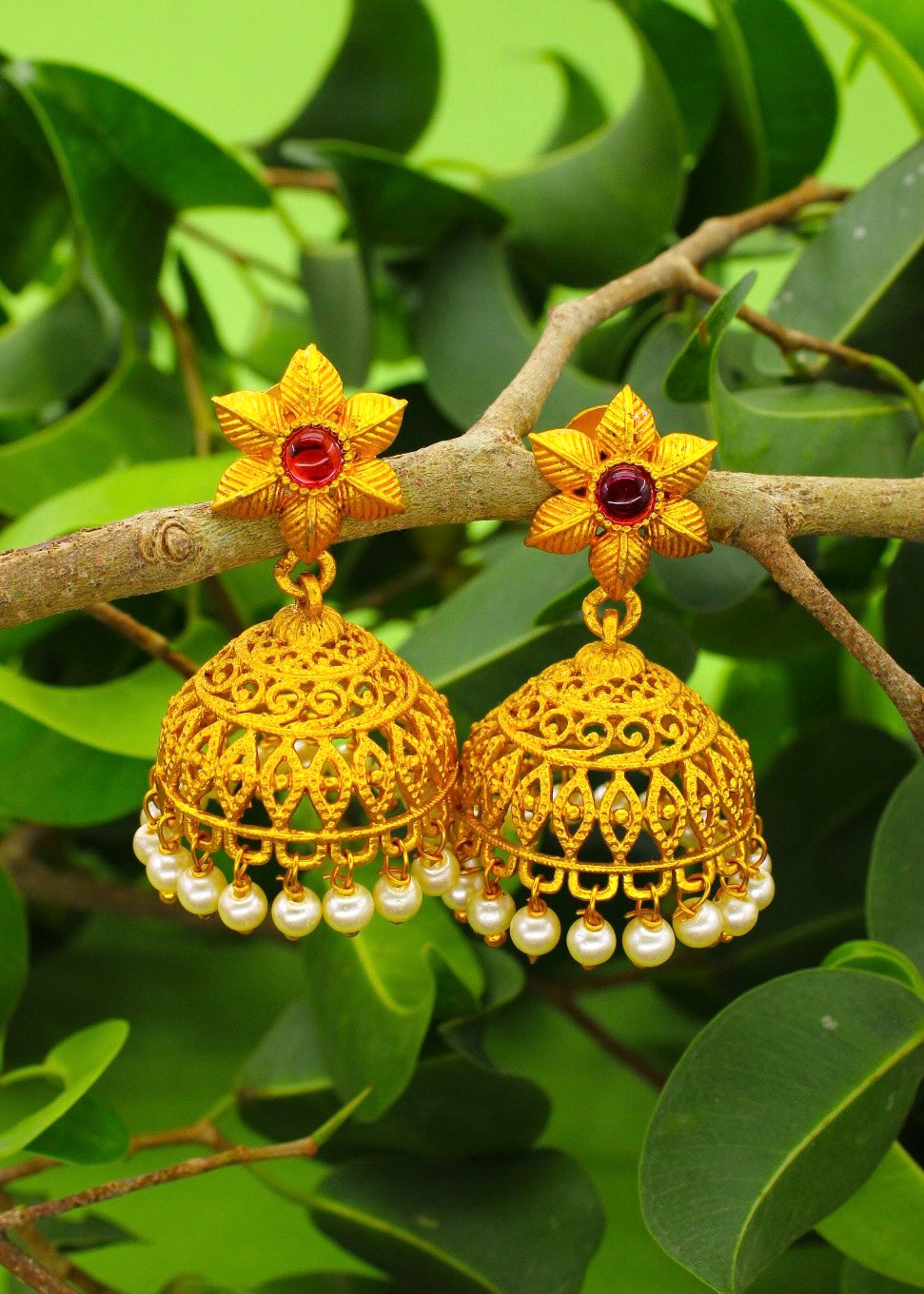 Must have in your jewellery collection this pair of Matte golden colour designer jhumki earrings from Sonchafa Jewellery. They are studded with sparkling pink stones along with pearl beads and fashioned from golden finish metal. These earrings are high in quality and ensure durability too.