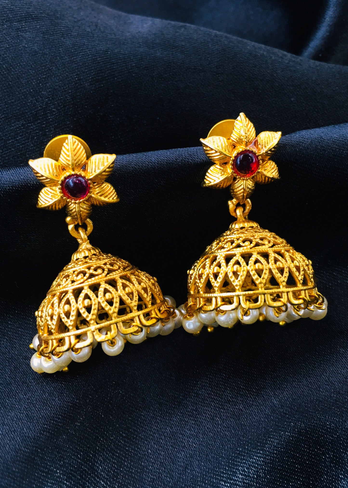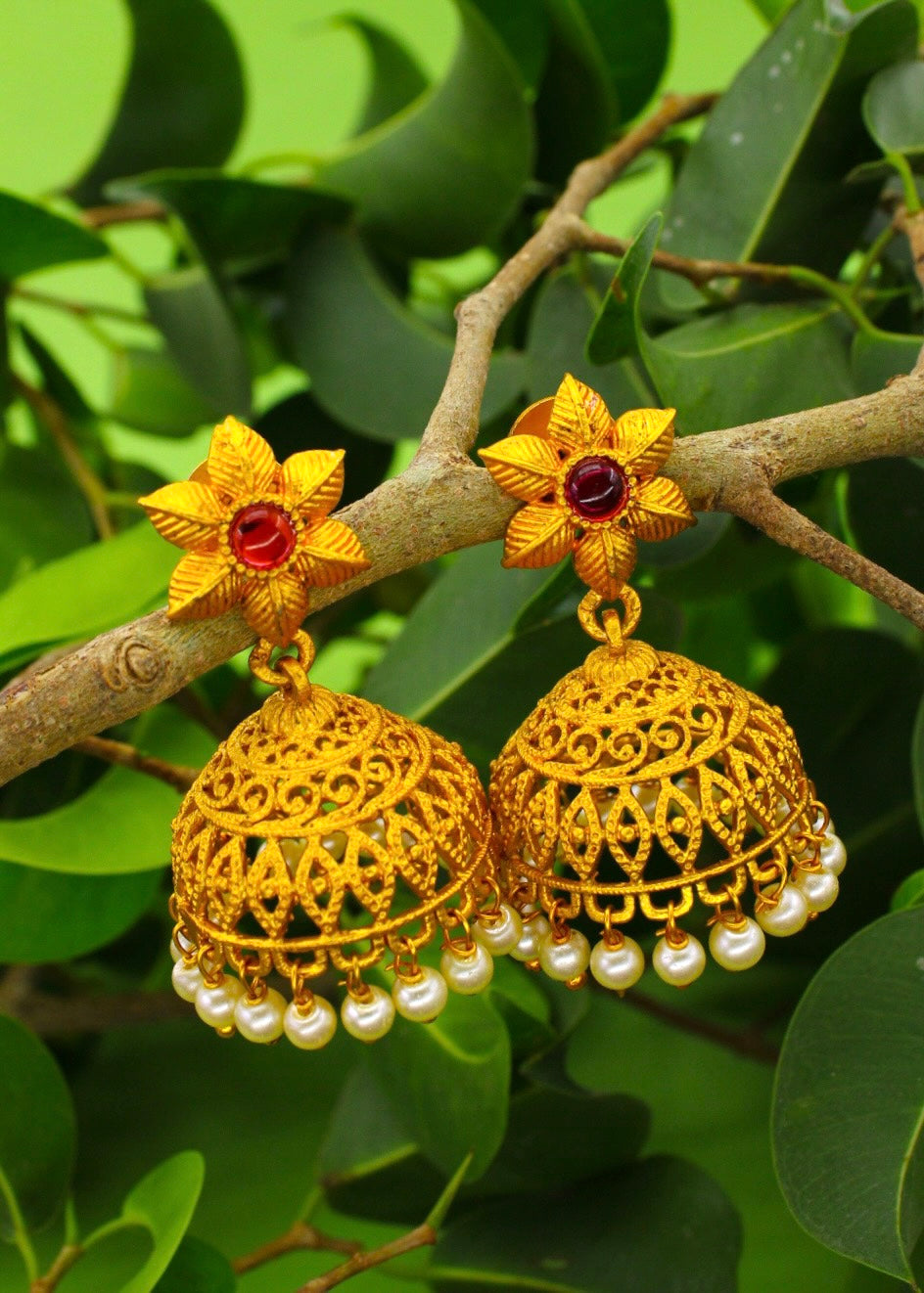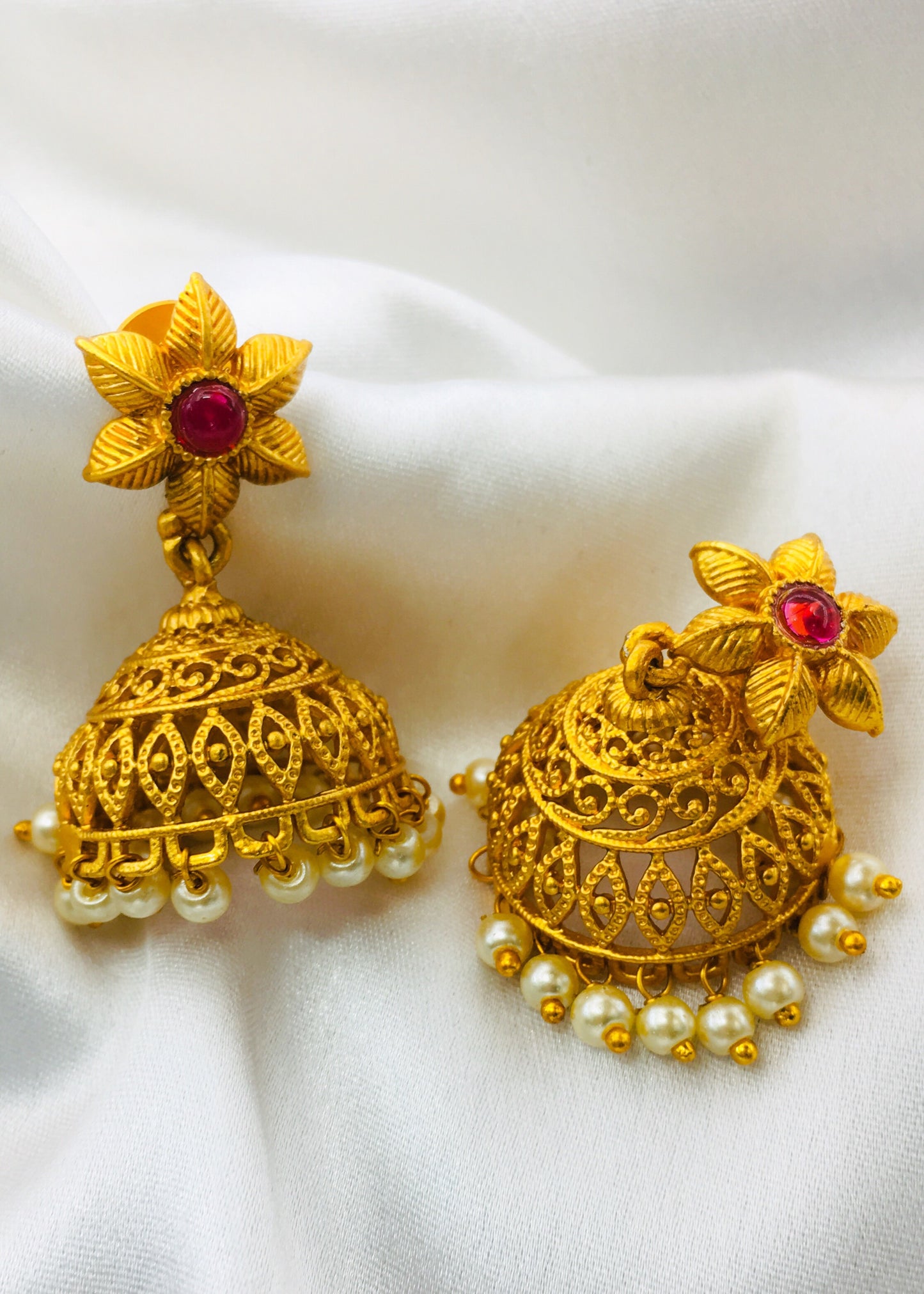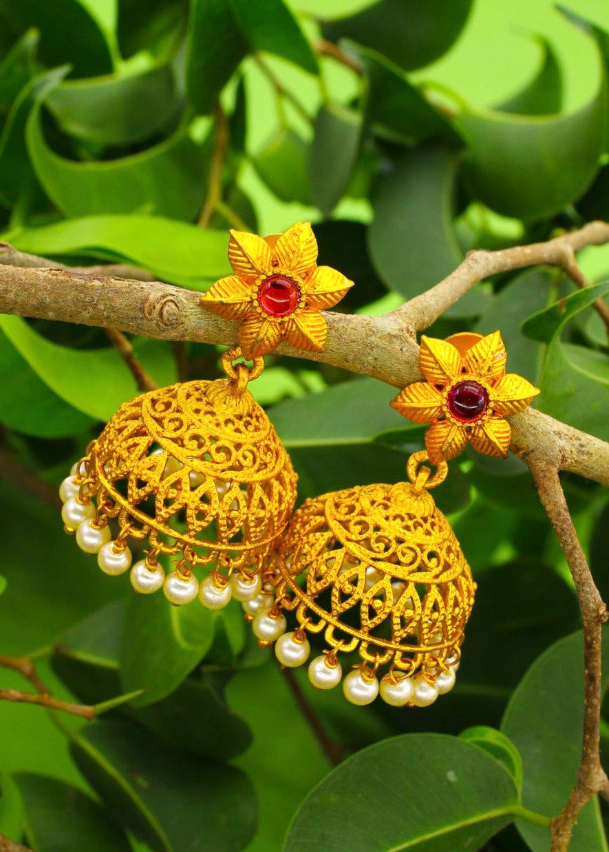 Must have in your jewellery collection this pair of Matte golden colour designer jhumki earrings from Sonchafa Jewellery. They are studded with sparkling pink stones along with pearl beads and fashioned from golden finish metal. These earrings are high in quality and ensure durability too.
