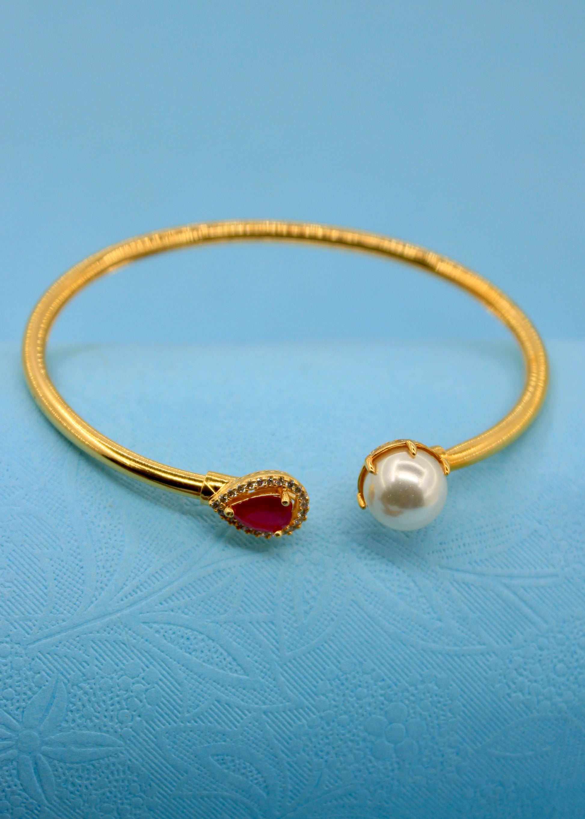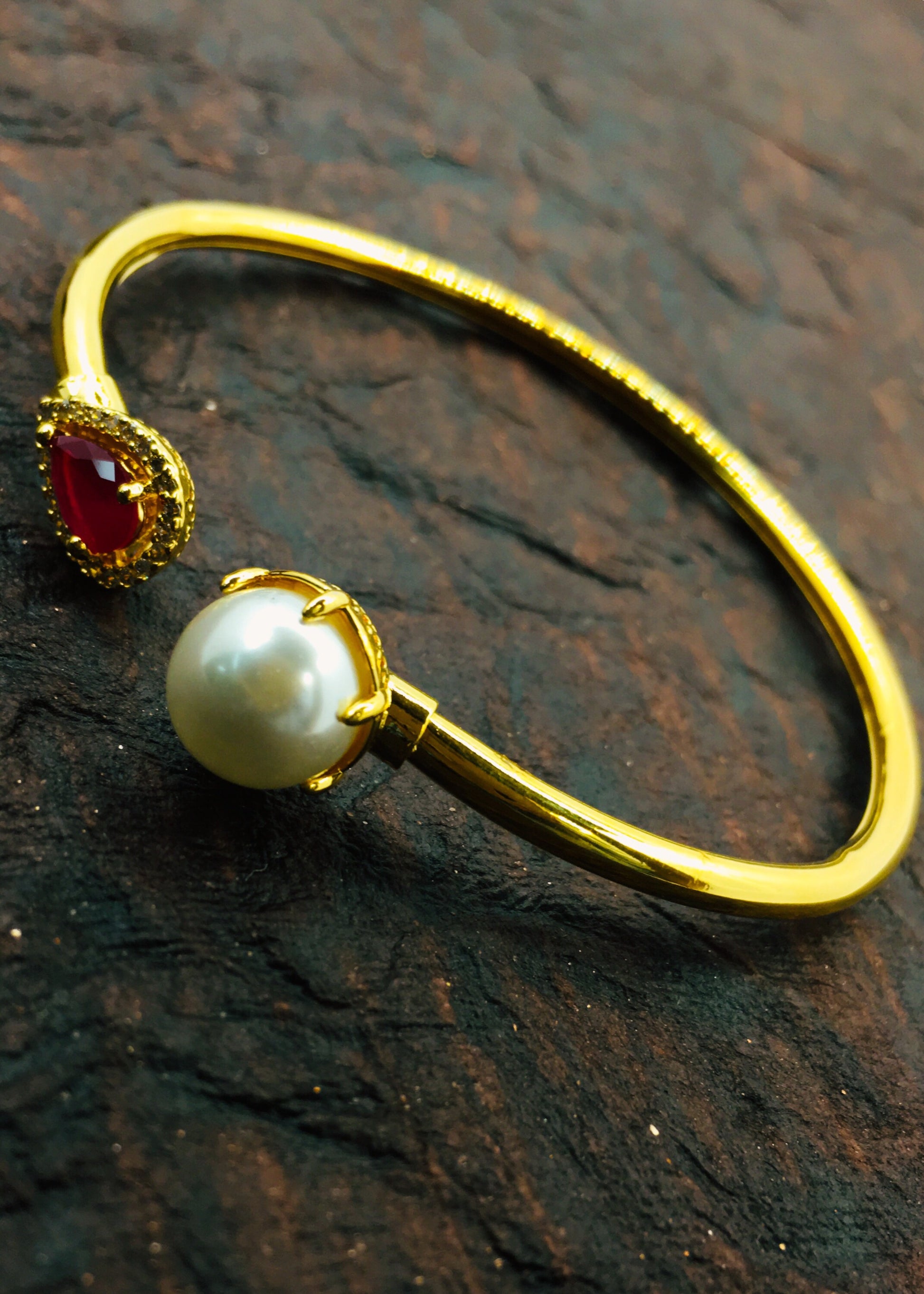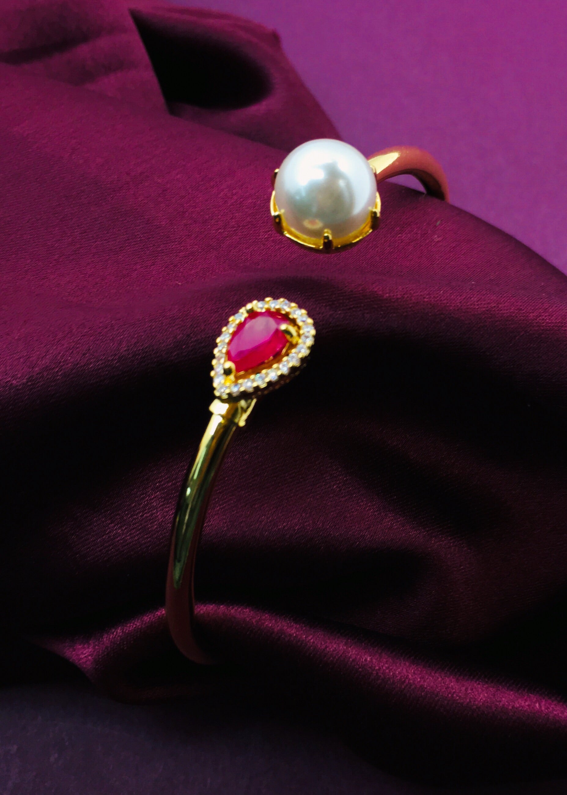 Look absolutely gorgeous by clubbing this Pink, White stone designer bracelet with your party costume. It is embedded with precious Dia diamonds stone along with pearl beads and made from golden polished metal.