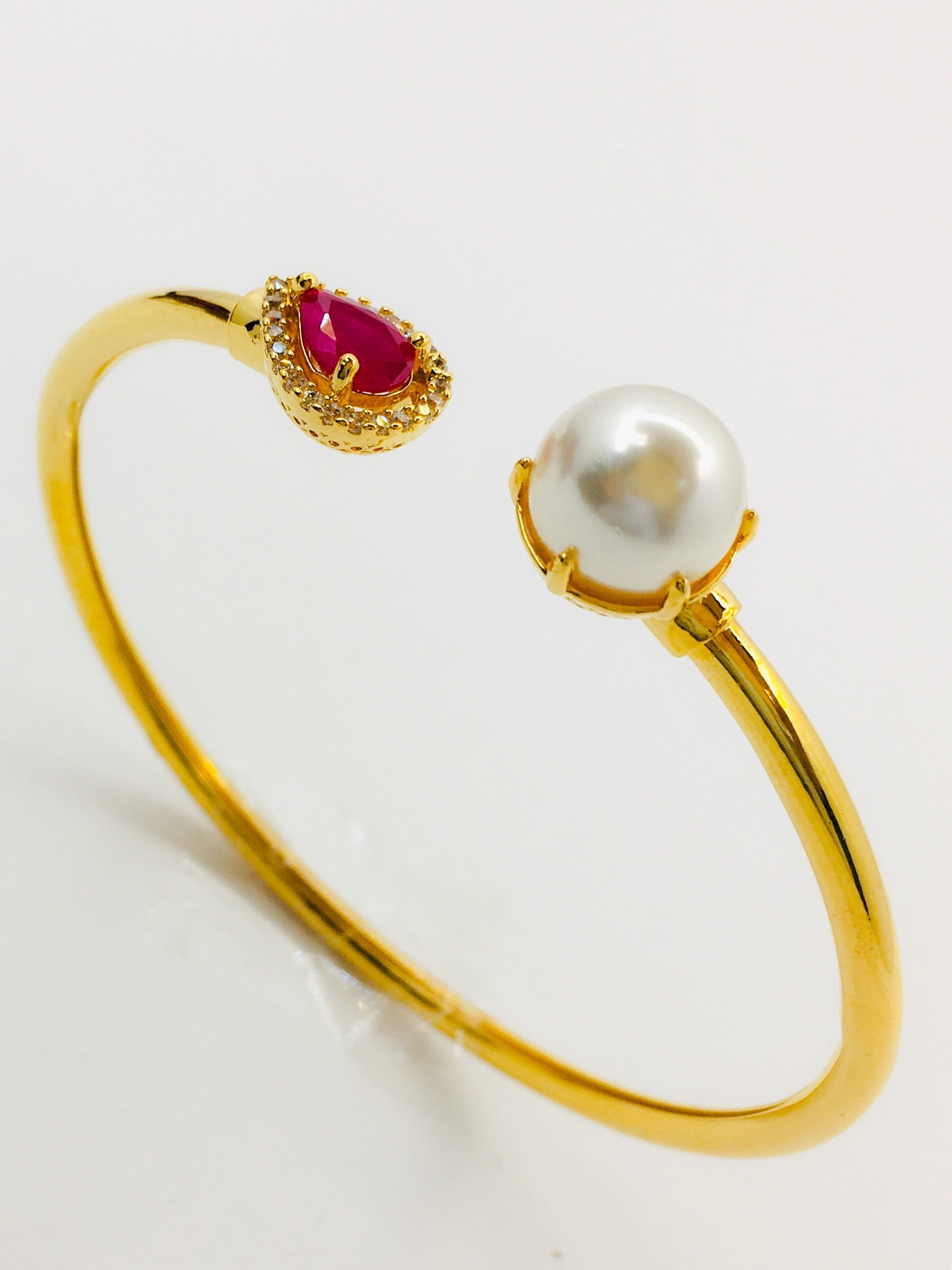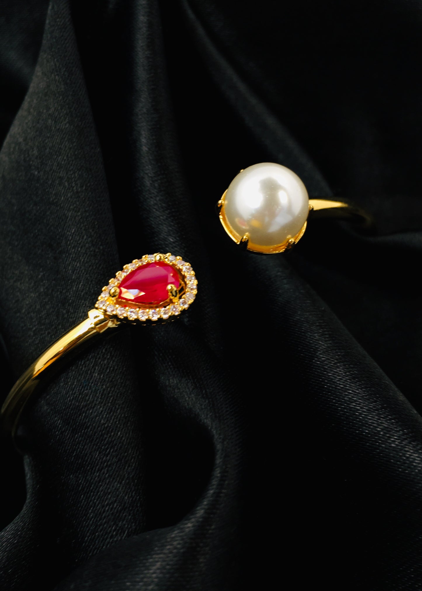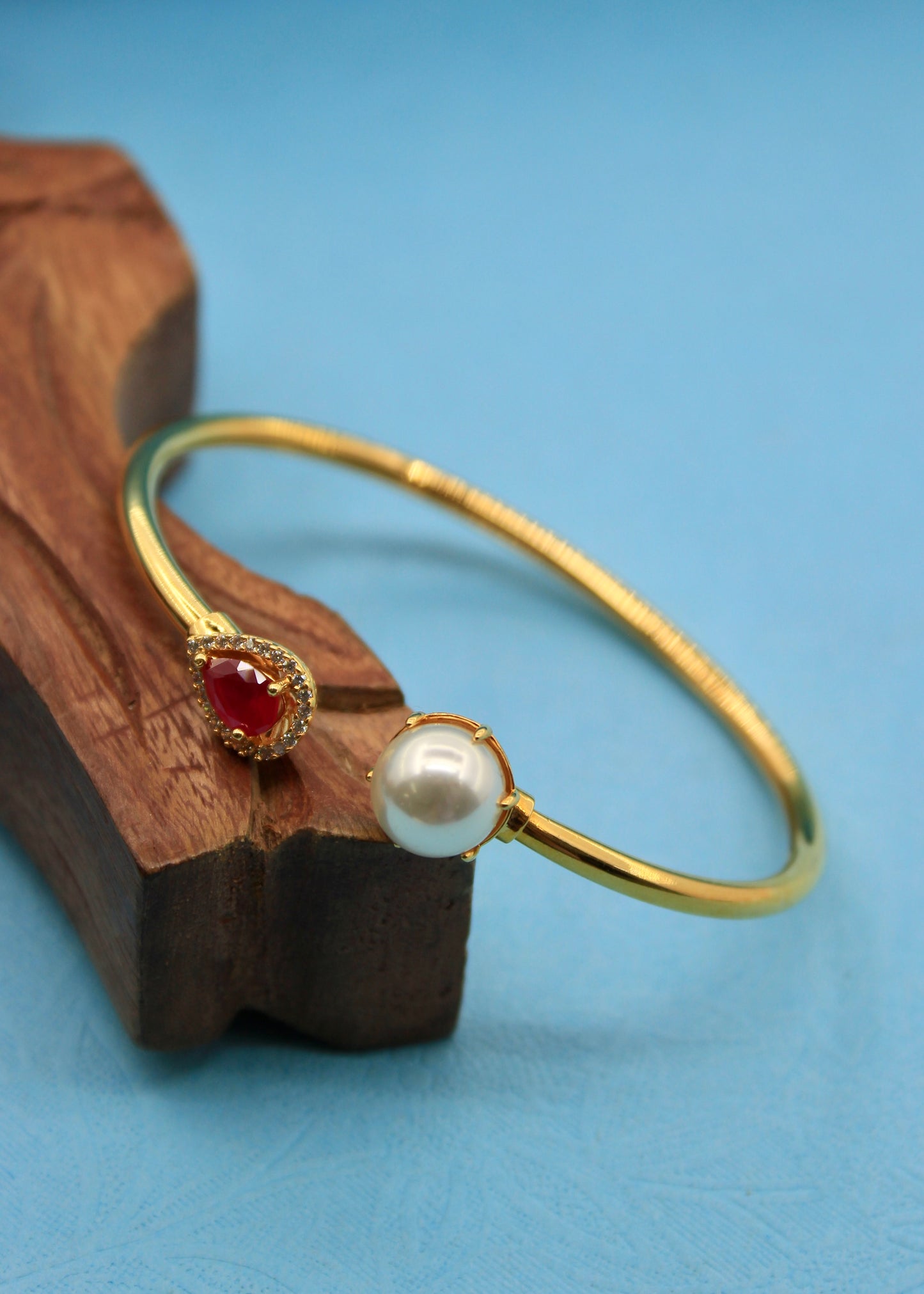 Look absolutely gorgeous by clubbing this Pink, White stone designer bracelet with your party costume. It is embedded with precious Dia diamonds stone along with pearl beads and made from golden polished metal.