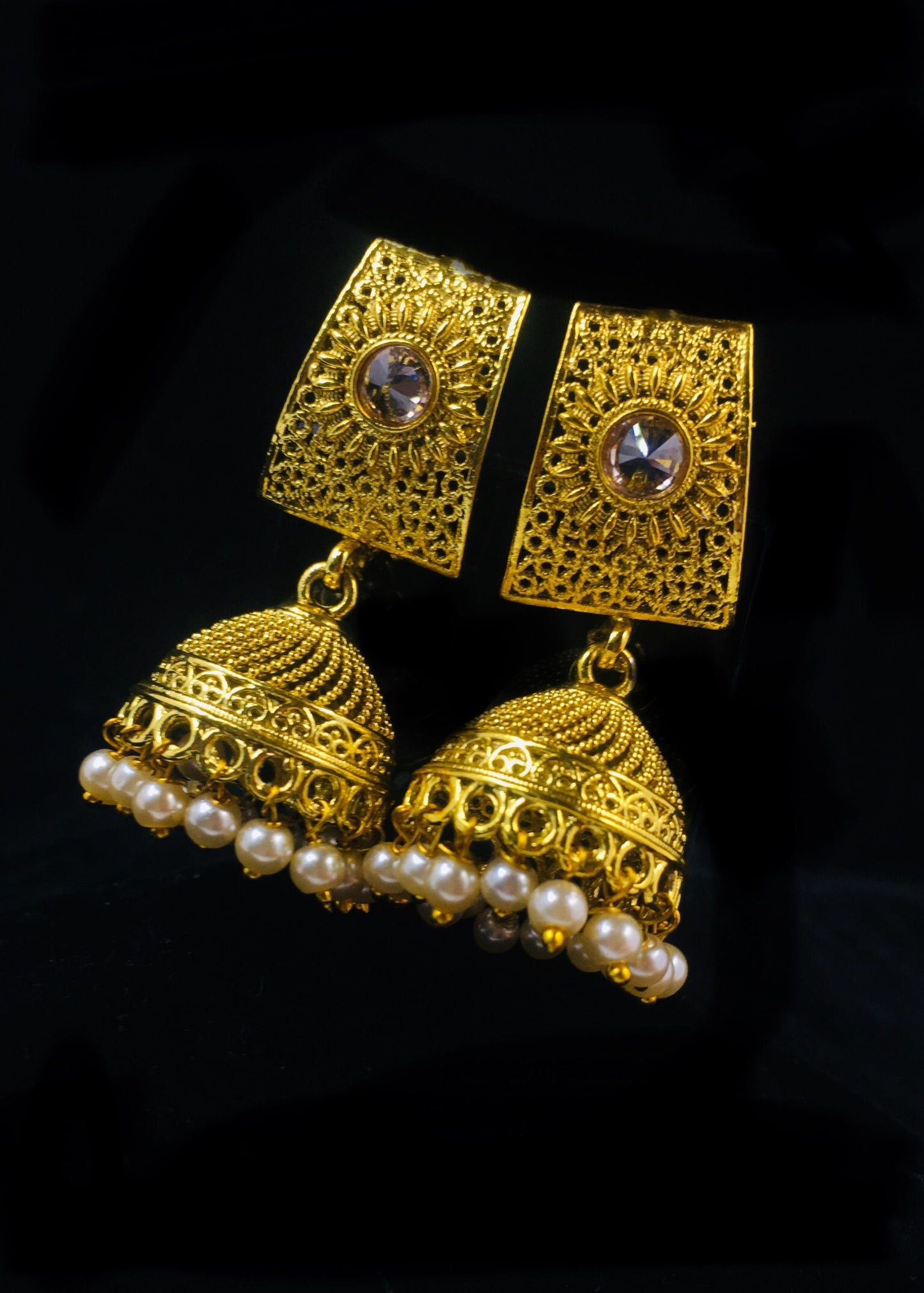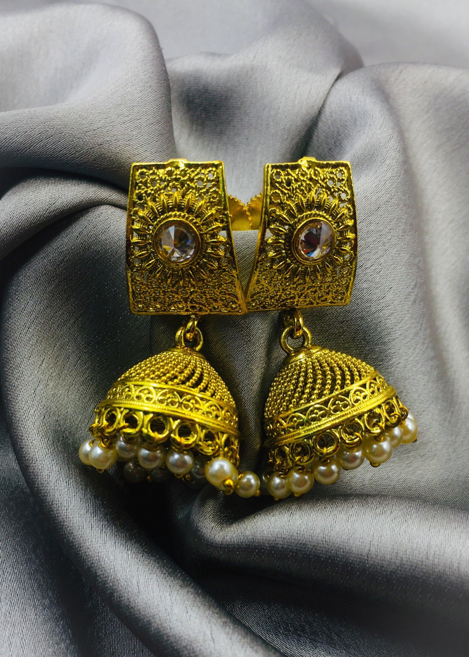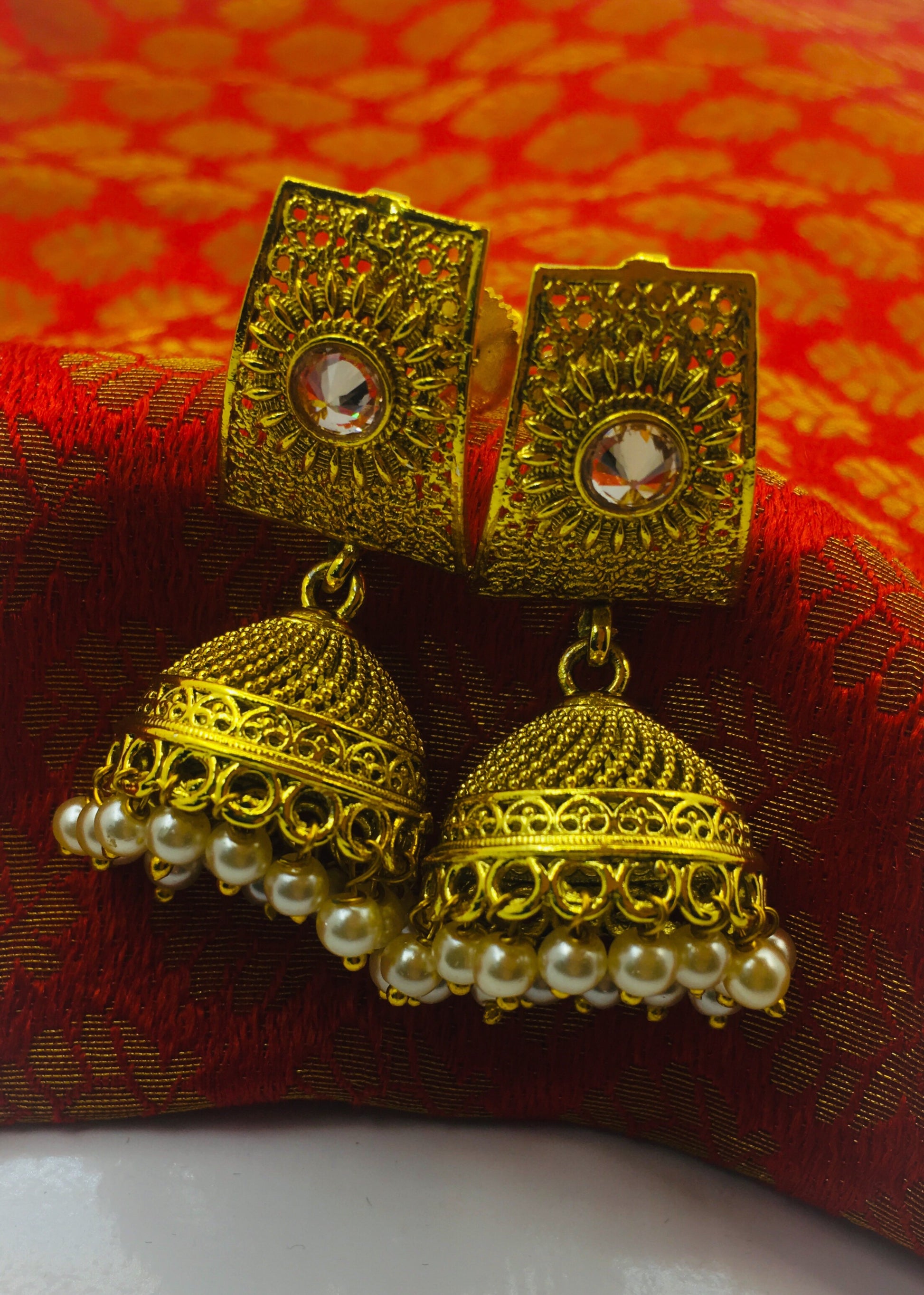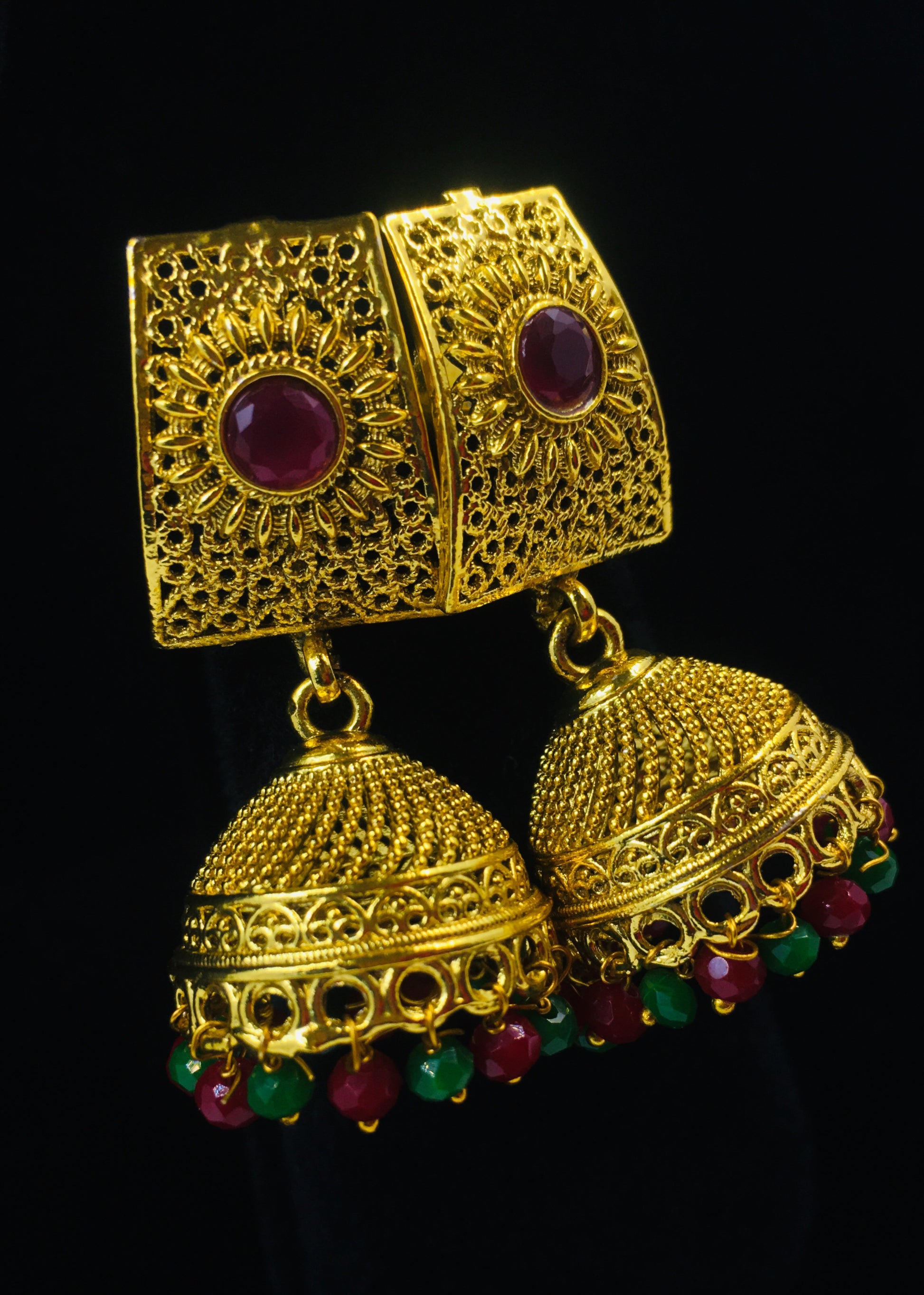 Antique adorable jhumki earrings from Sonchafa Jewellery for stylish designer jhumki for you. It is styled with wonderfully crafted with golden finish metal along with maroon & peach stone. These designer jhumki have maroon, green or pearl beads droplets for stylish look.