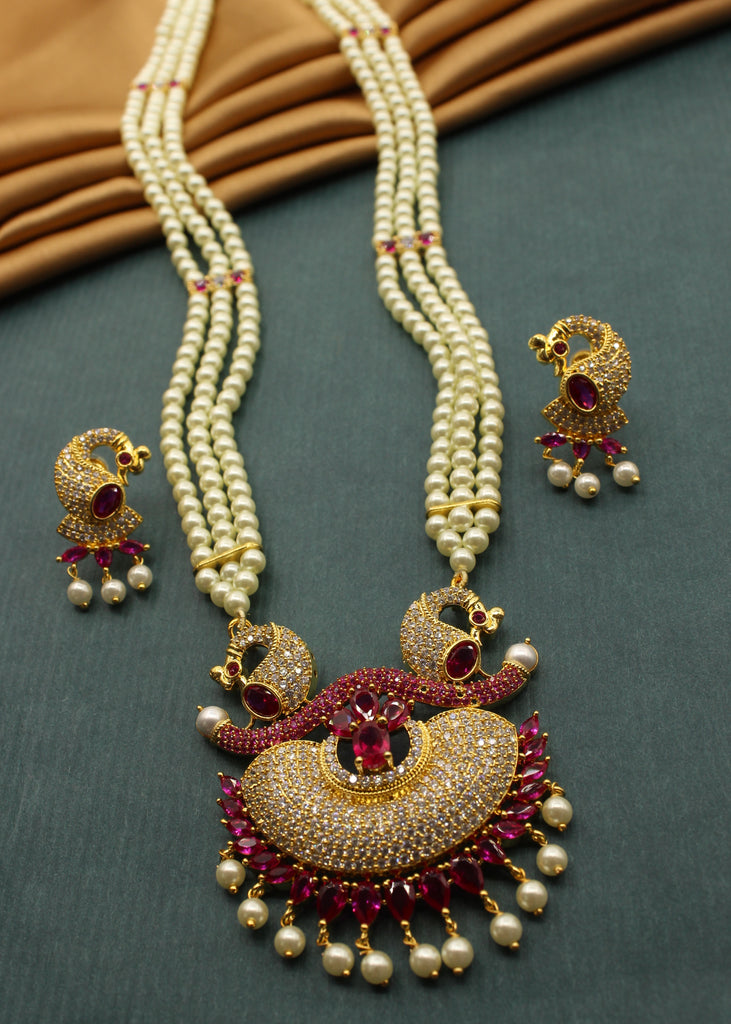 Make a beautiful addition to your jewellery collection by adding this pretty Puneri moti necklace set from Sonchafa. This set features is pink-white colour stones and white Pearl beads for your traditional outfits.