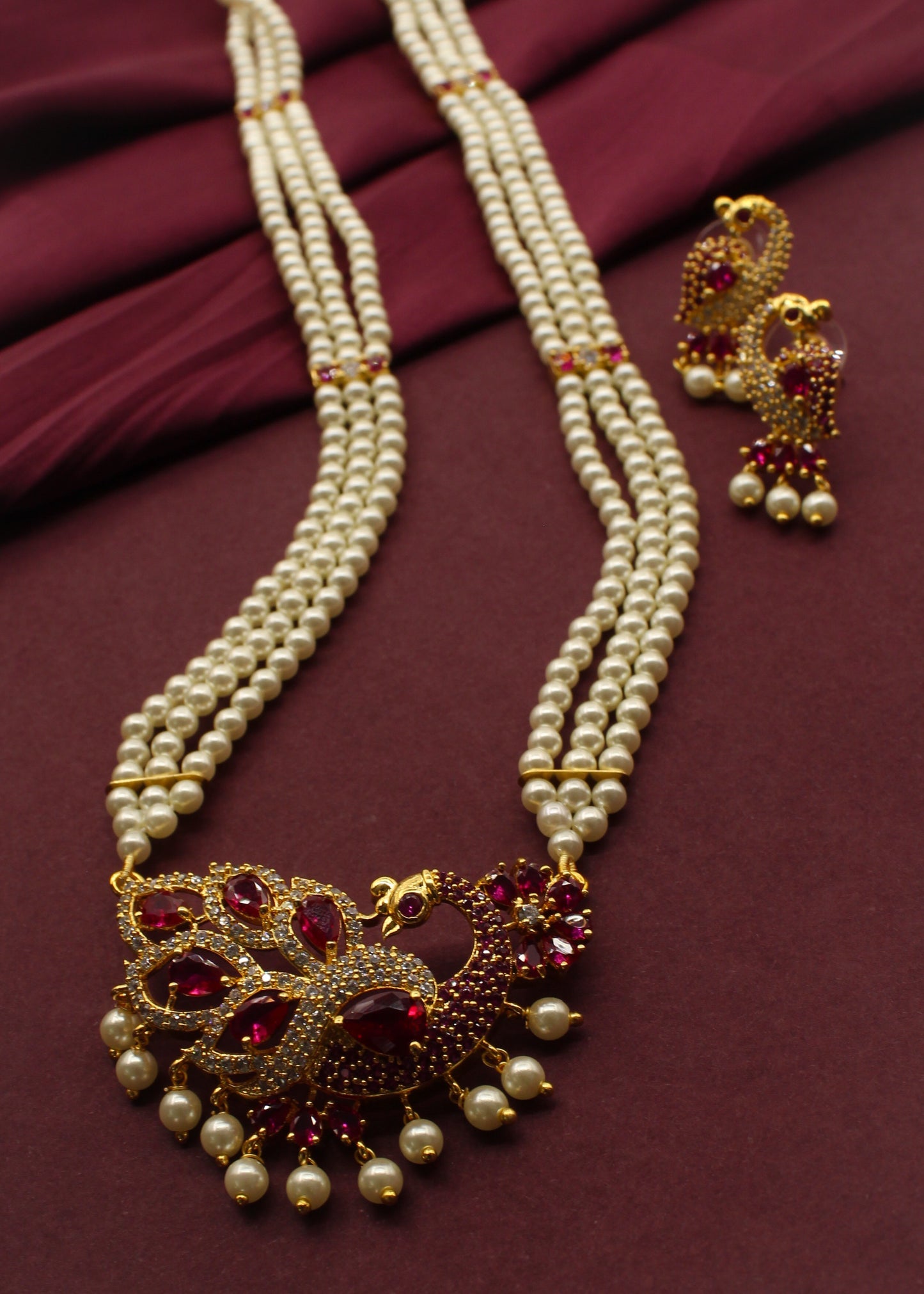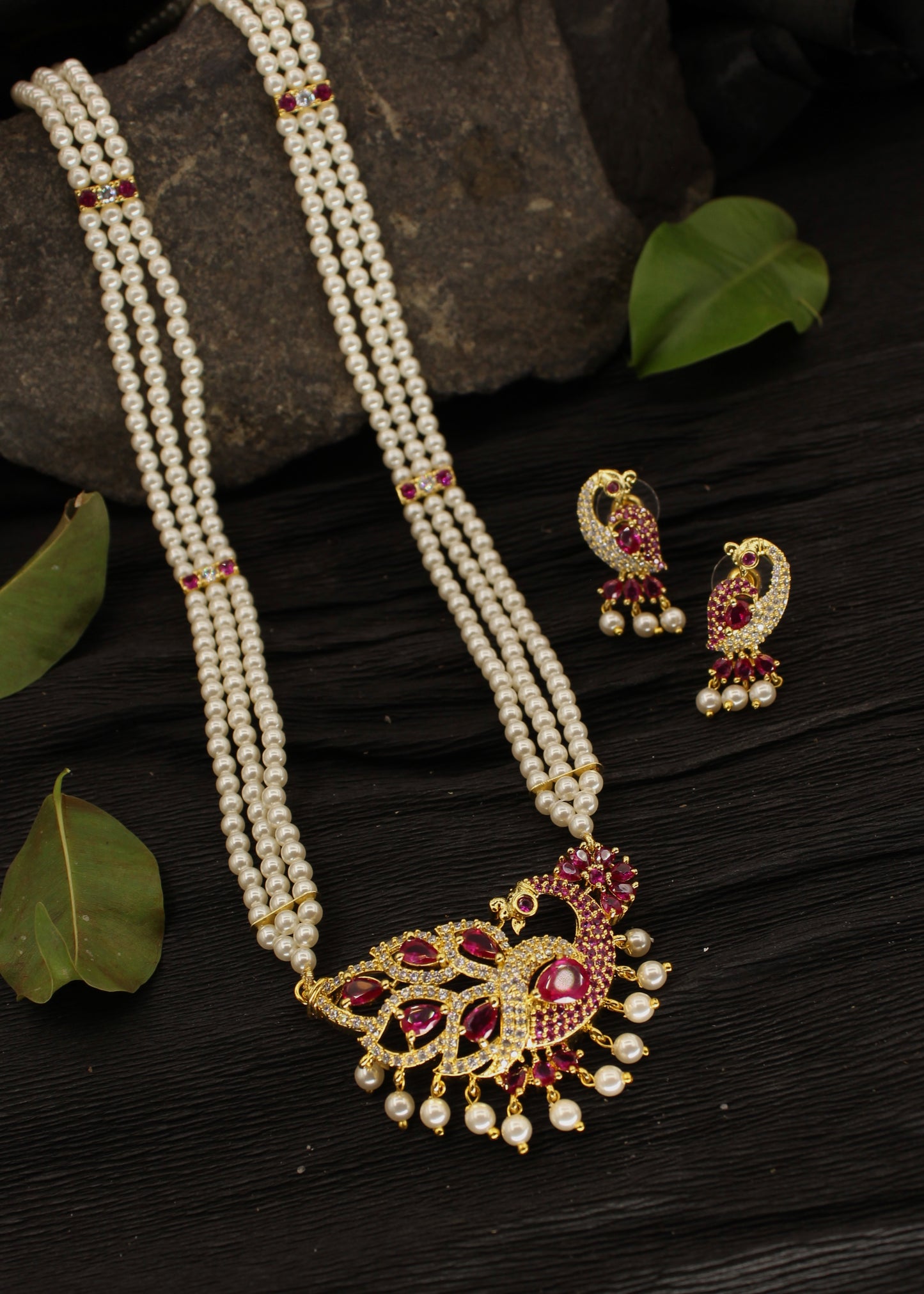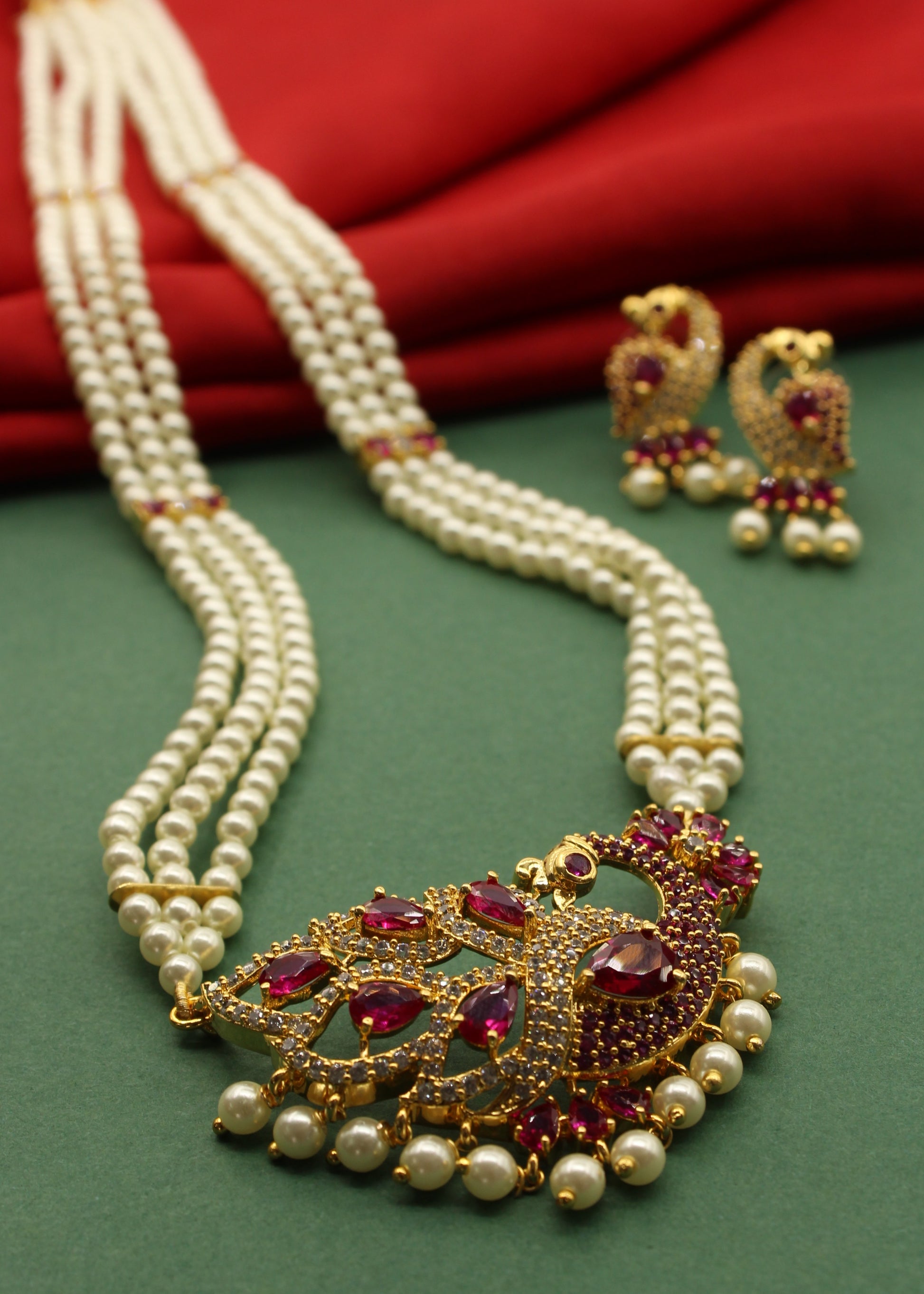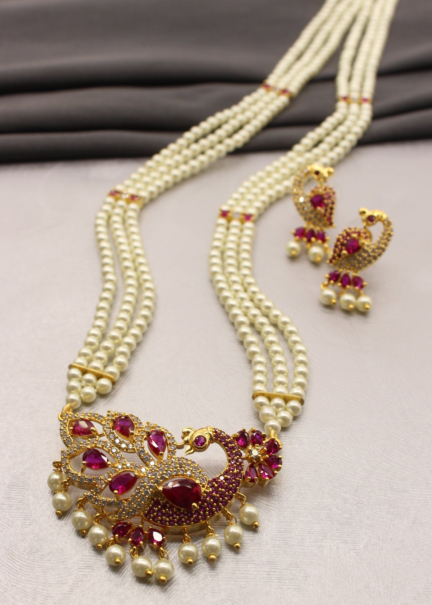 Graceful peacock designer necklace encrusted with pink, white stone along with pearl beads long necklace for girl or women online latest design from Sonchafa Jewellery. It is made up of golden finish metal.