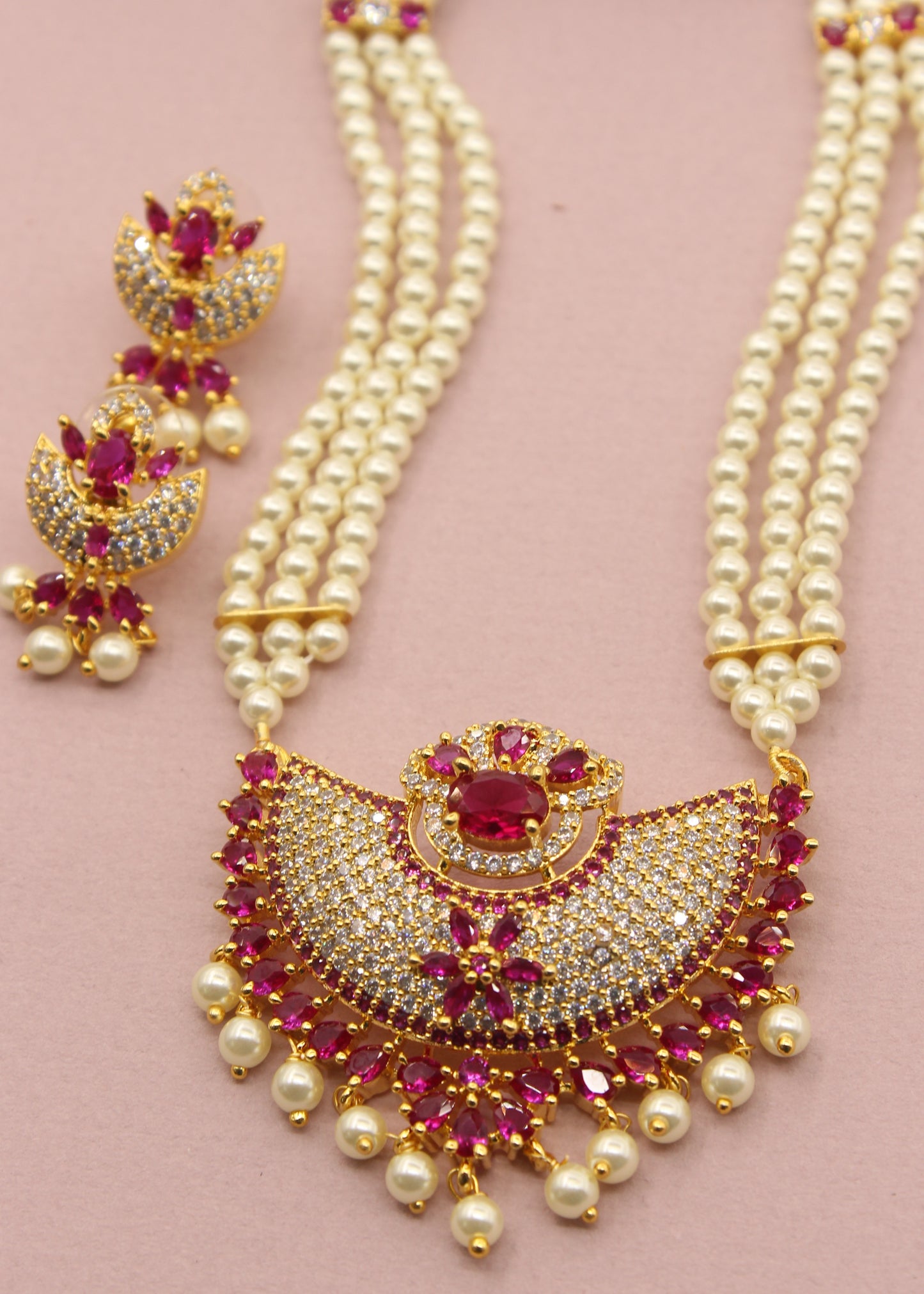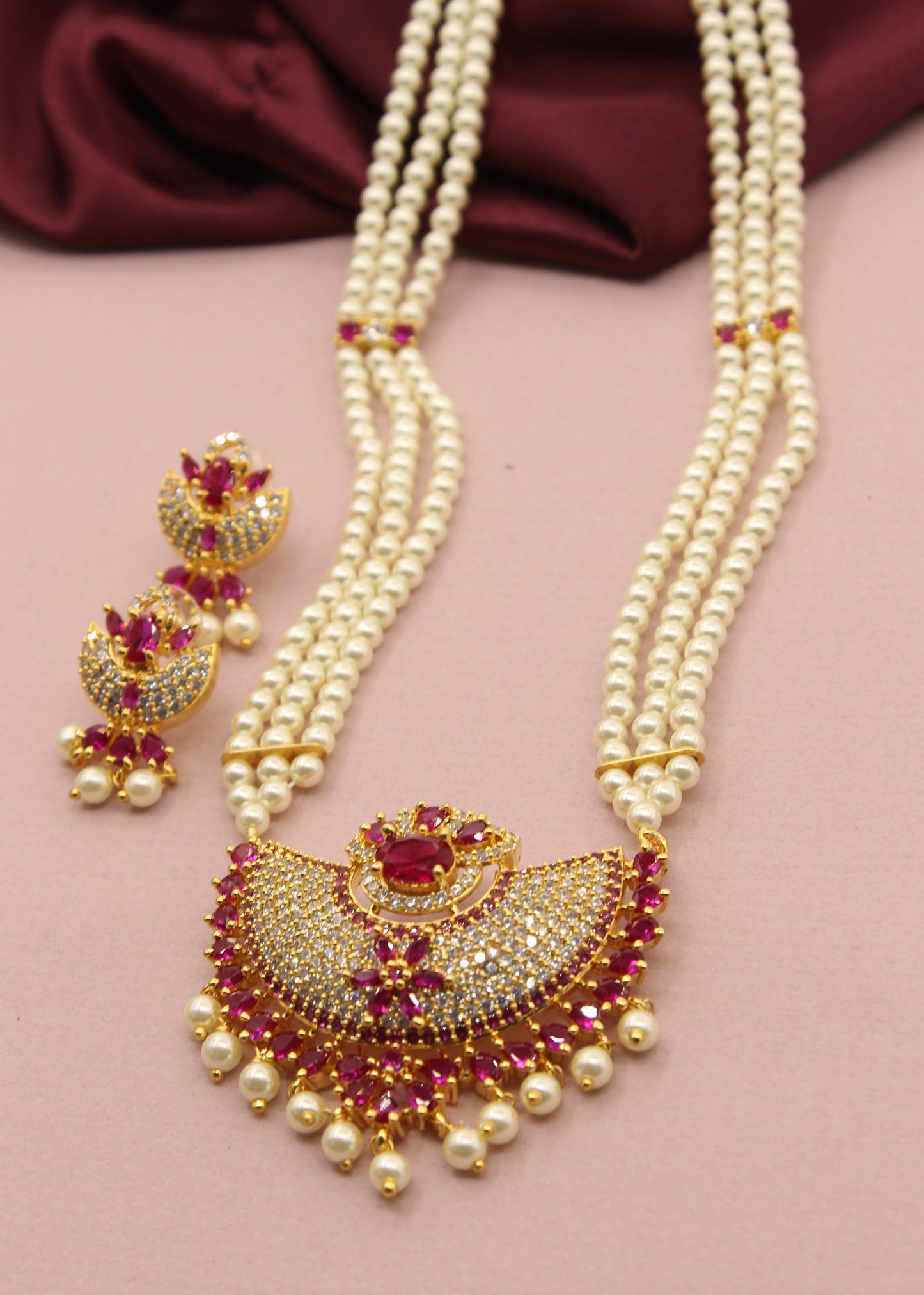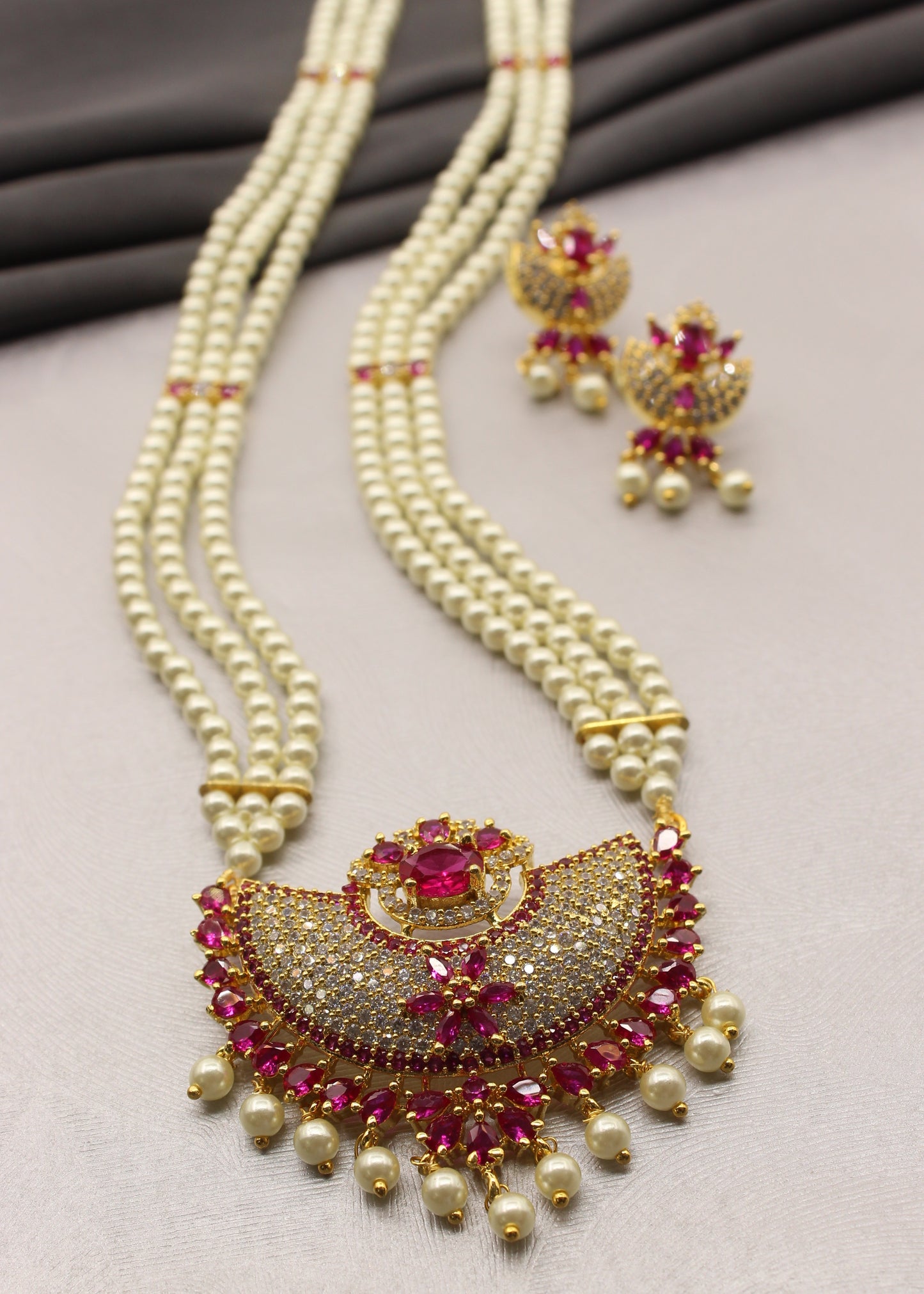 Presenting this beautiful Puneri Moti necklace for women who love to wear traditional jewellery. The pendant is studded with sparkling pink-white colour stones and has white pearl droplets for added attraction. It is fashioned from golden finish metal and ensures high durability. This set is made from golden finish metal & will go well with traditional saree.