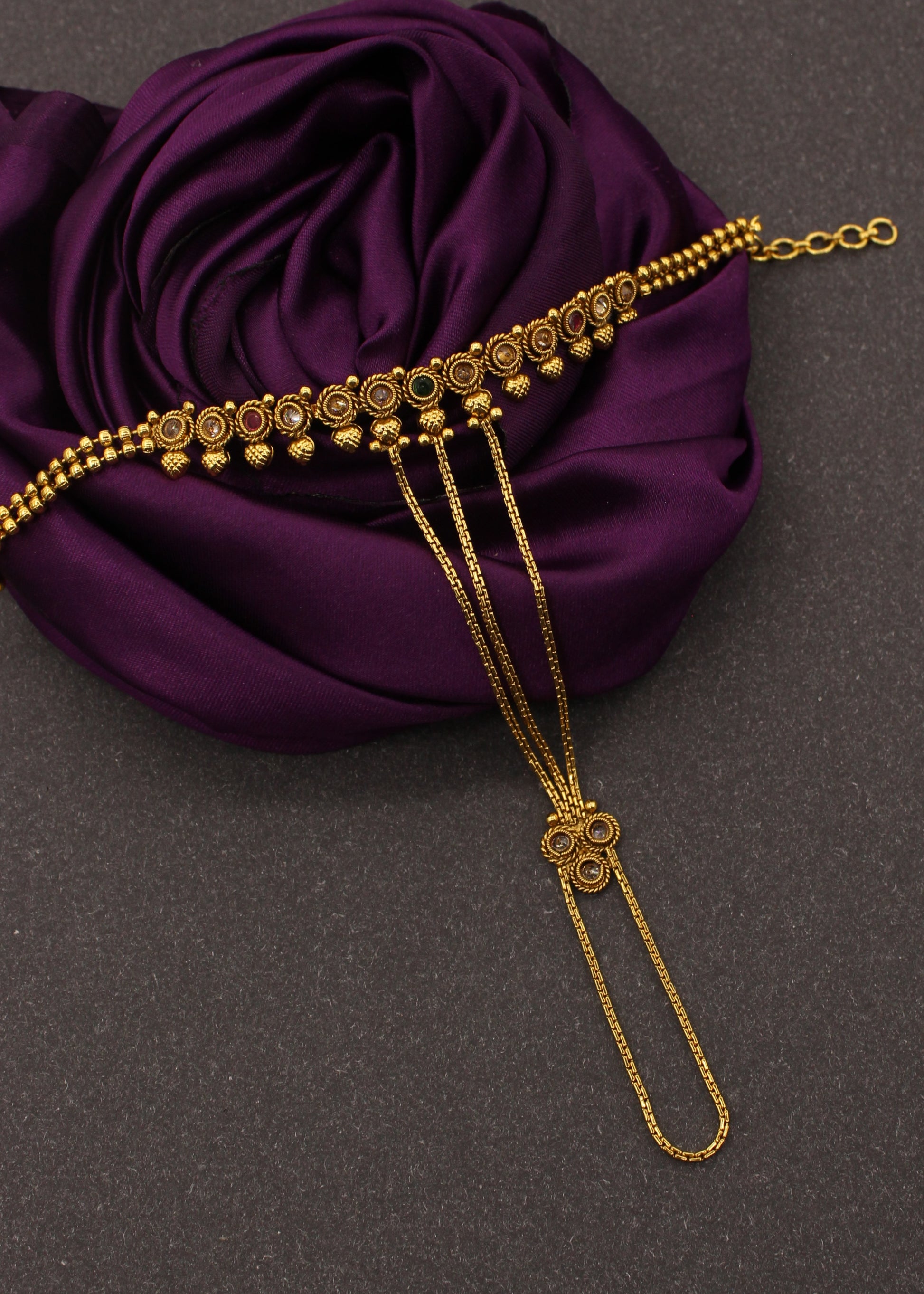 Take a look at this heart shape inspiring golden finish haatpan from Sonchafa Jewellery. This haatpan has a pink-green stone along with golden beads. This haatpan will surely catch your attention at the first look itself.