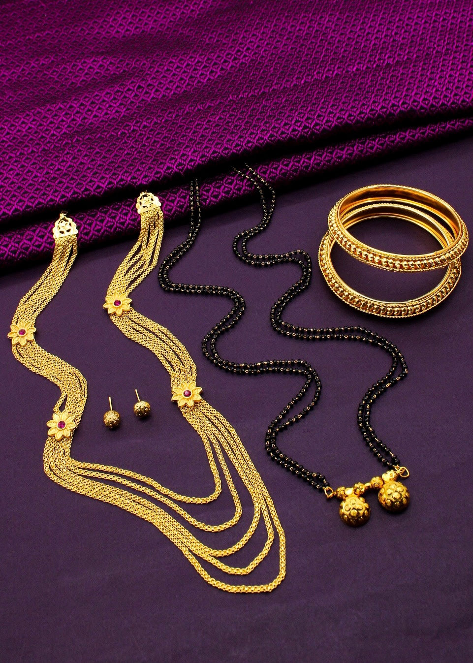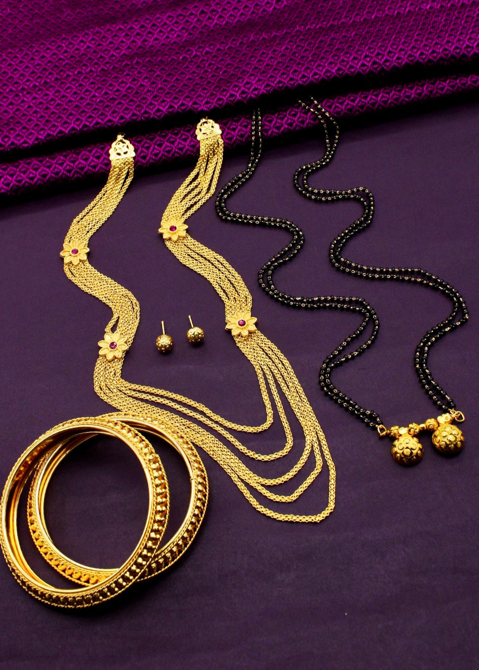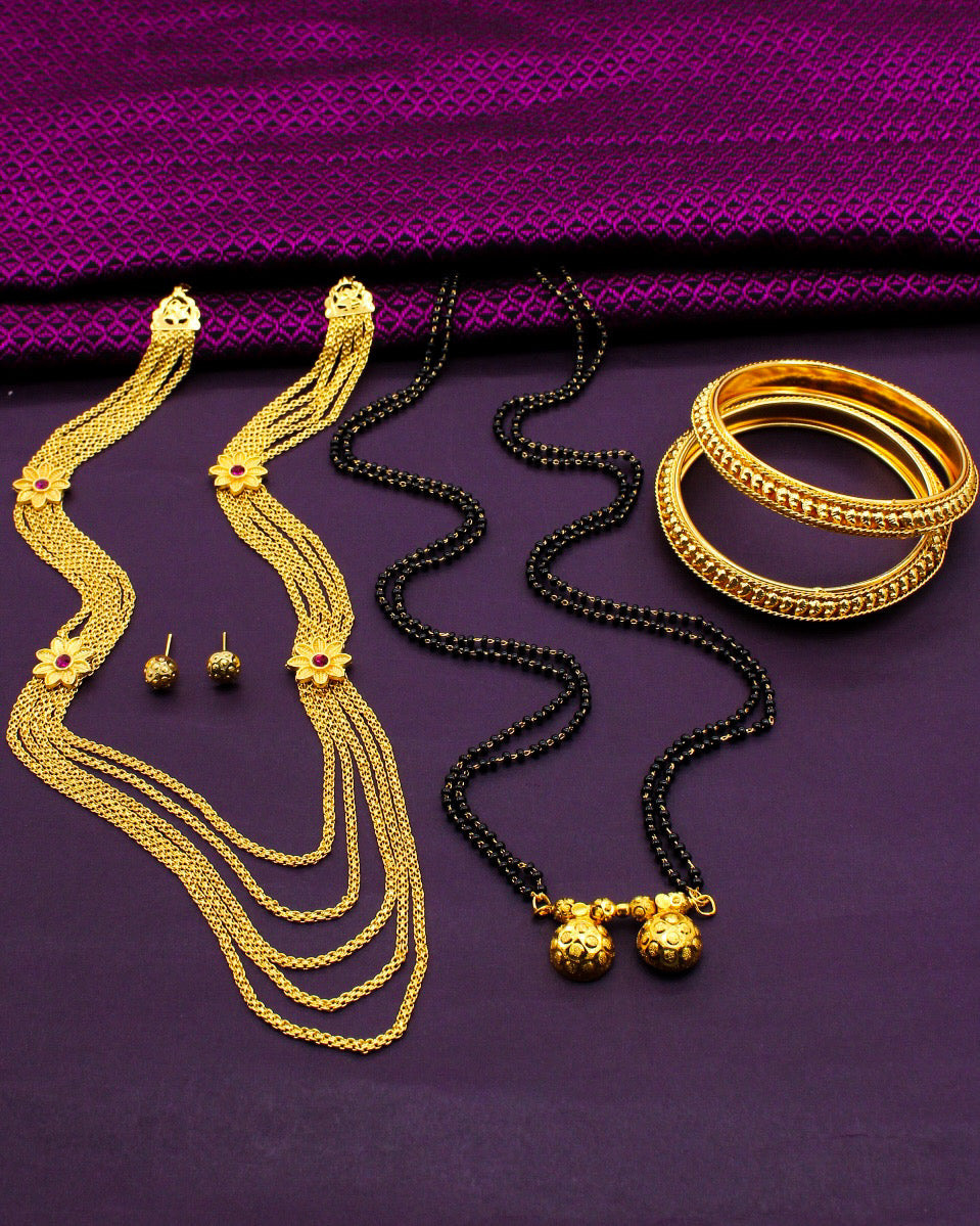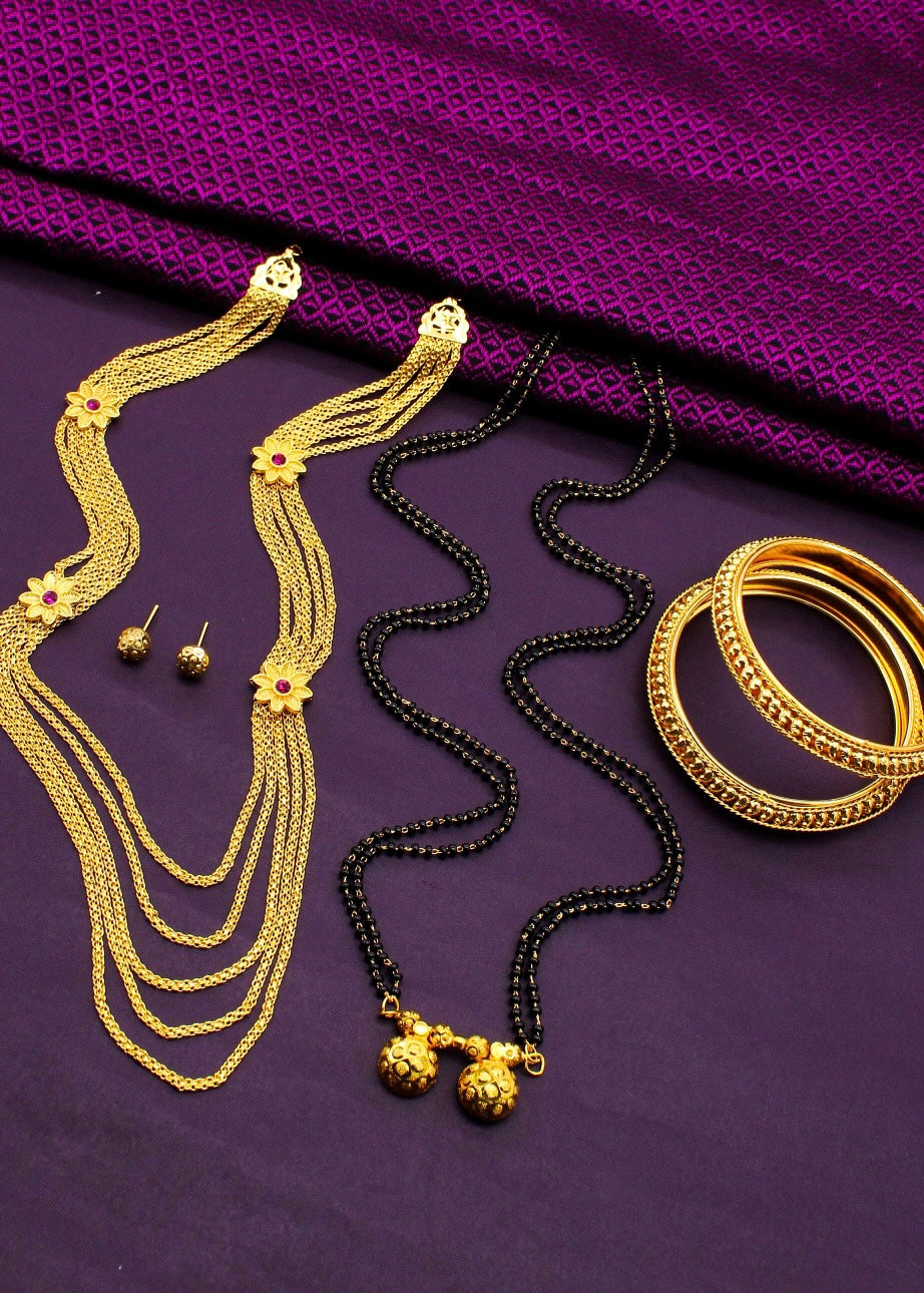 Buy something different for yourself in the form of this adorable malhar combo set from Sonchafa Jewellery. This necklace is studded with pink stone and wonderfully woven with golden, black beads in an unbreakable thread. This adorable necklace is fashioned from golden finish metal and ensures high durability.