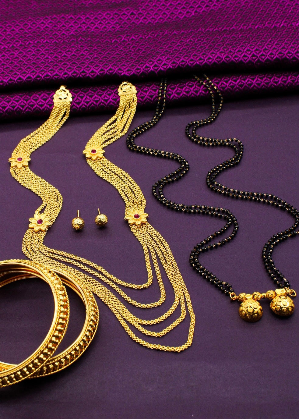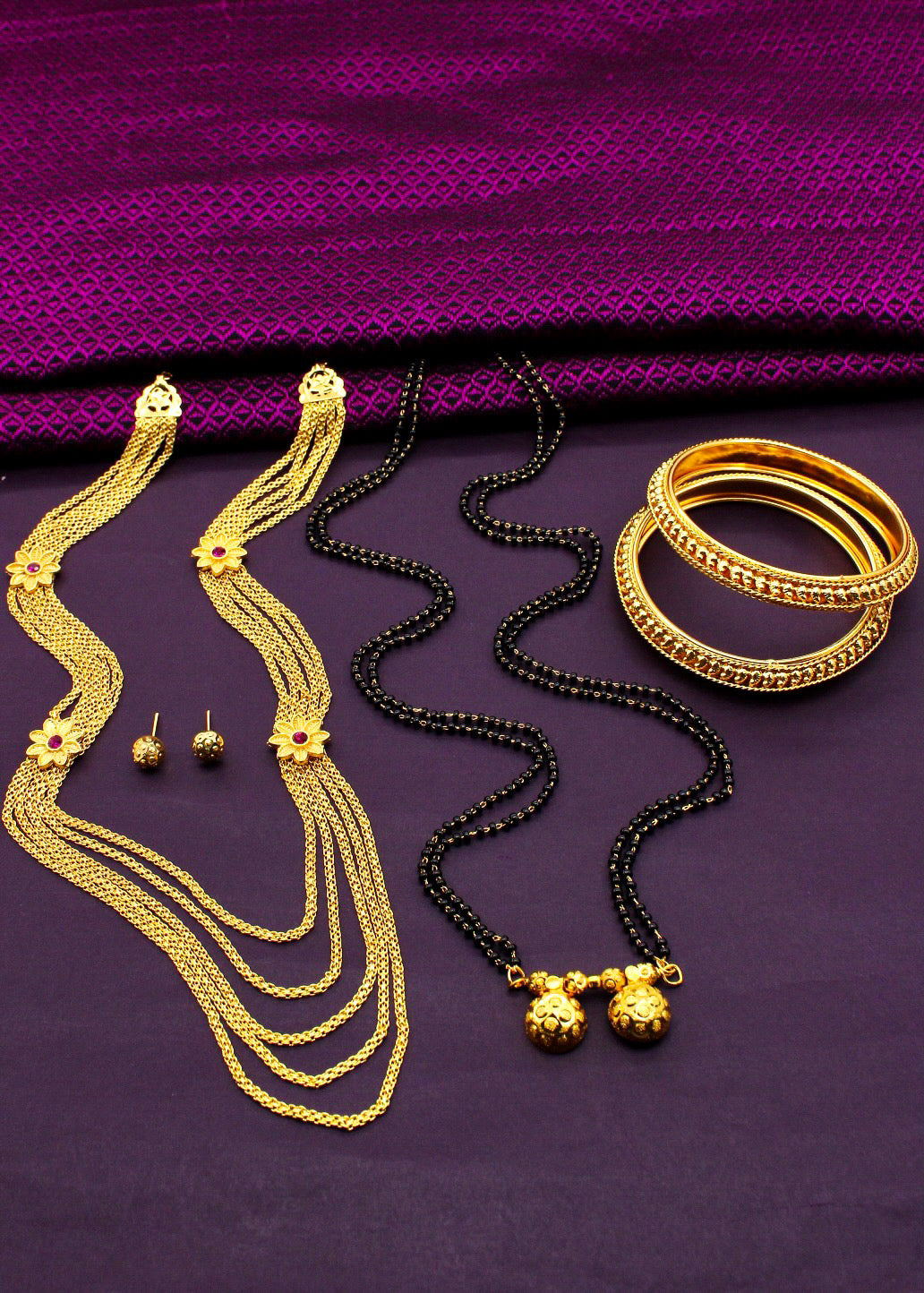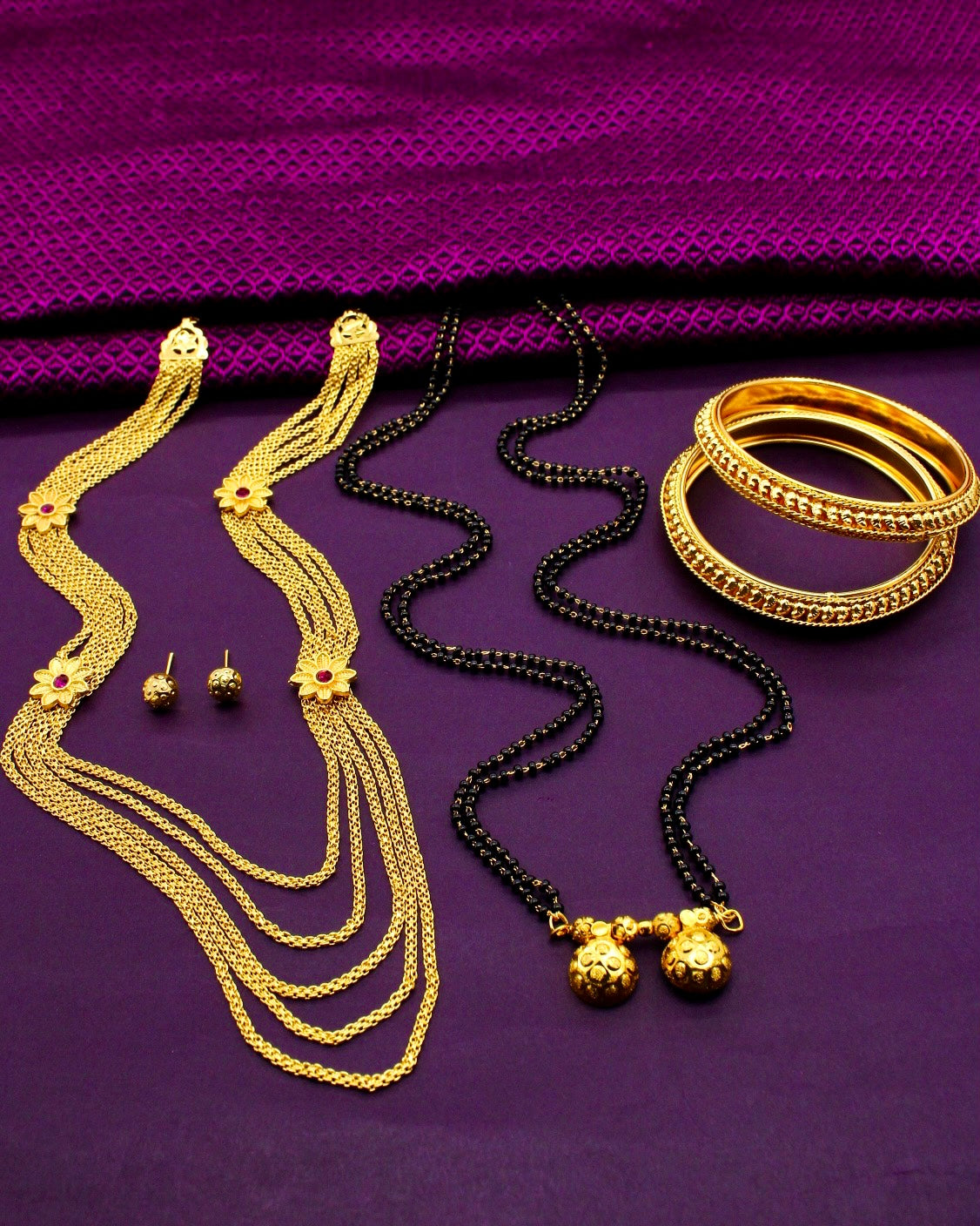 Buy something different for yourself in the form of this adorable malhar combo set from Sonchafa Jewellery. This necklace is studded with pink stone and wonderfully woven with golden, black beads in an unbreakable thread. This adorable necklace is fashioned from golden finish metal and ensures high durability.