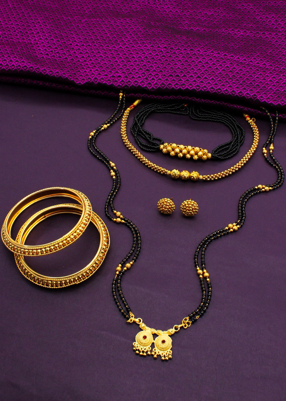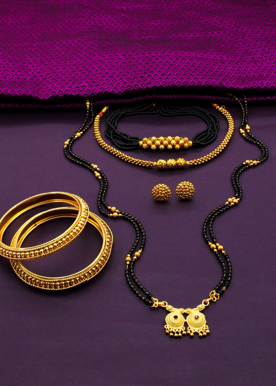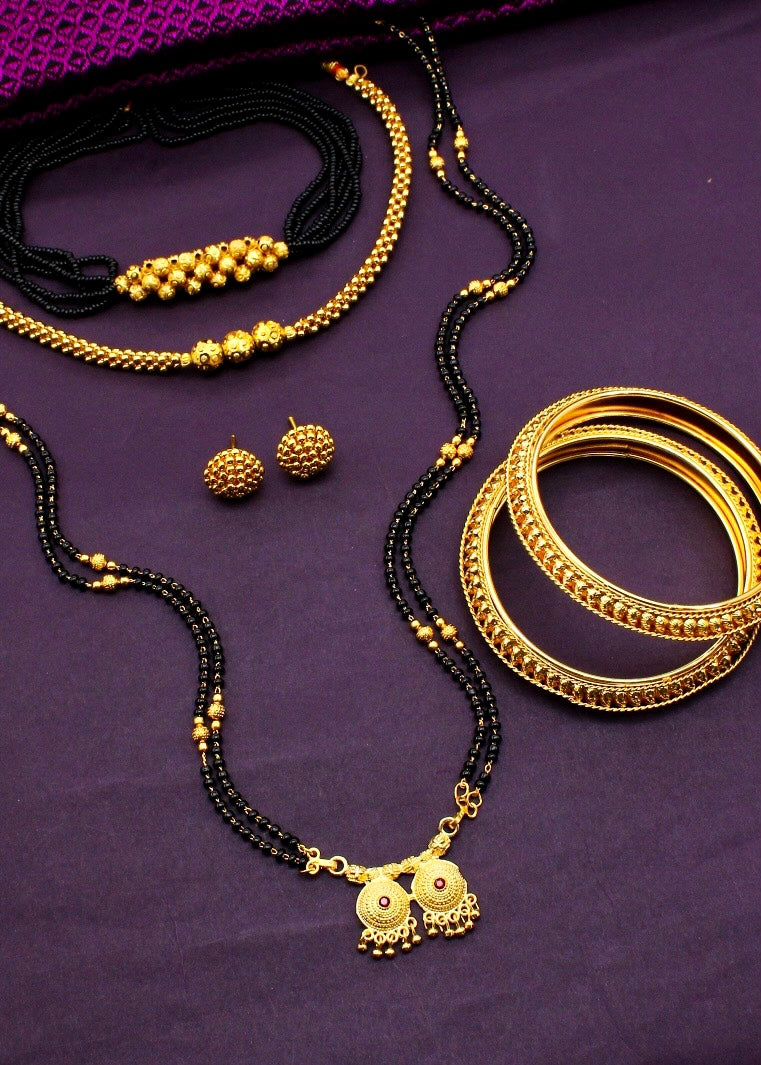 Mangalsutra is must have ornament for married women of today from Sonchafa Jewellery. It is crafted from golden finish metal. It is wonderfully woven with black, golden beads in an unbreakable thread and comes with an adjustable dori, so that you can fit it properly according to your neck.