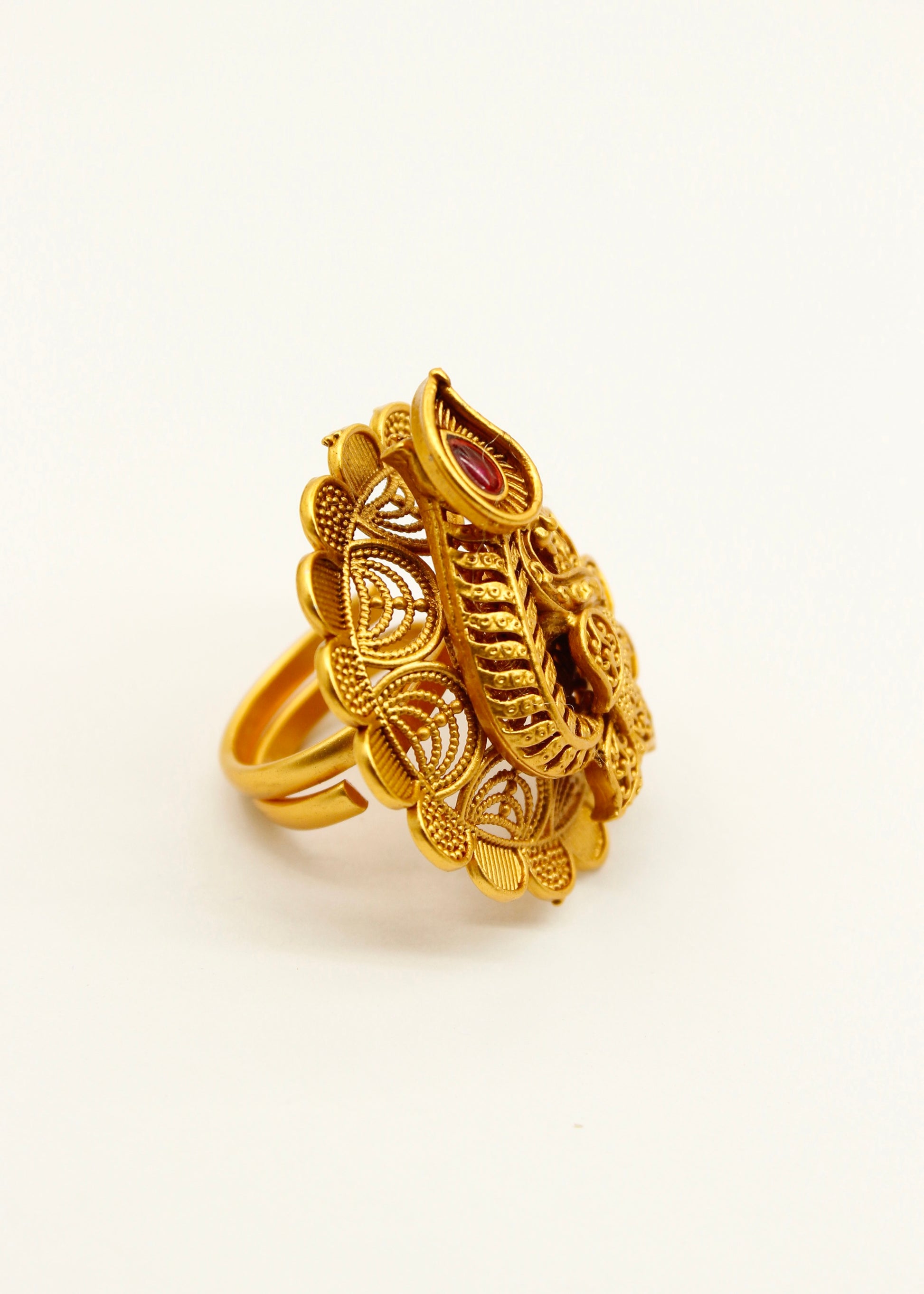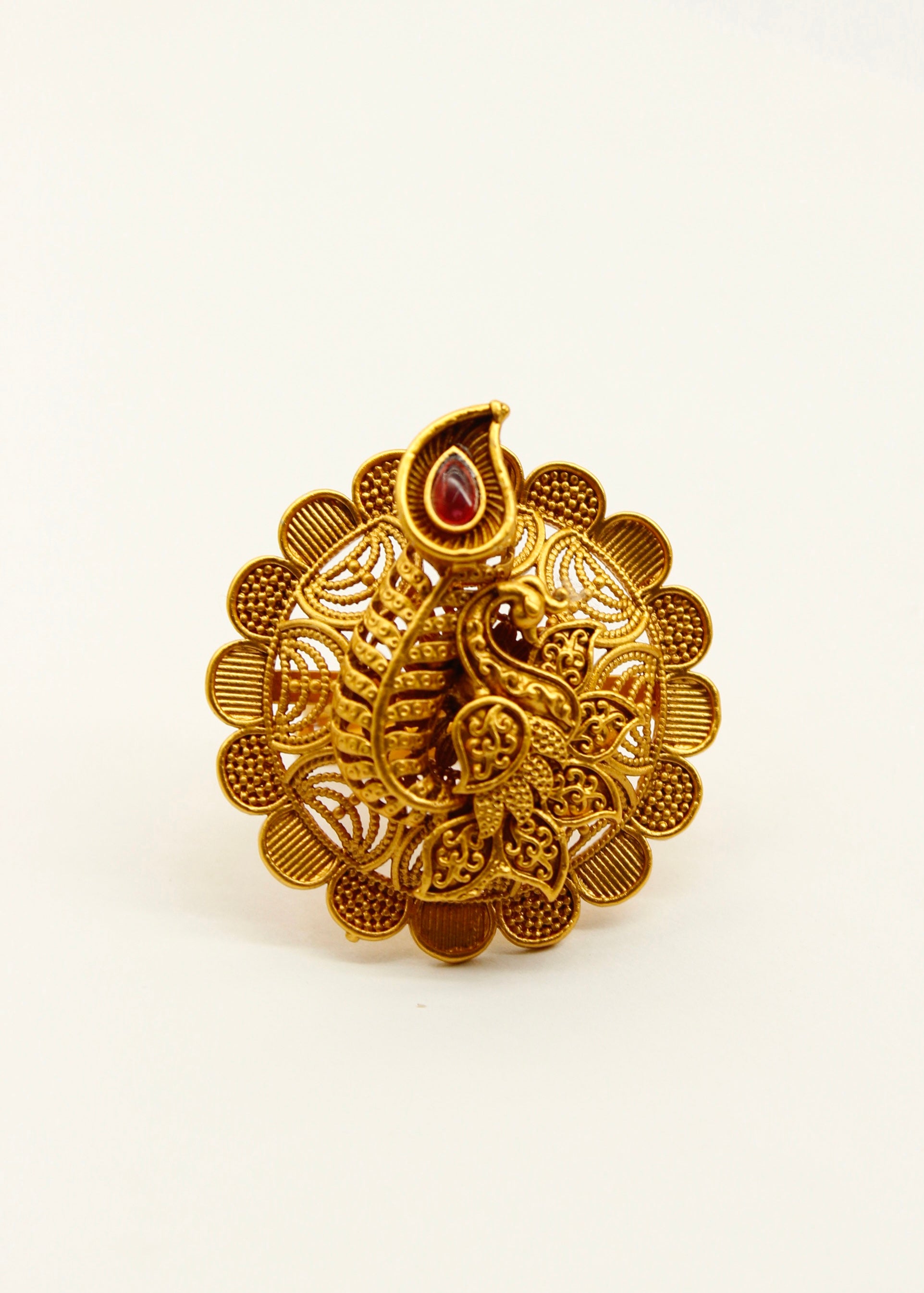 Sonchafa Jewellery offers this Peacock design peshwai finger ring for women who love to adorn stylish accessory. It is studded with pink stone and made from matte gold finish metal. This finger ring is superior in quality and rust-resistant as well. So, grab this ring and make your day special.