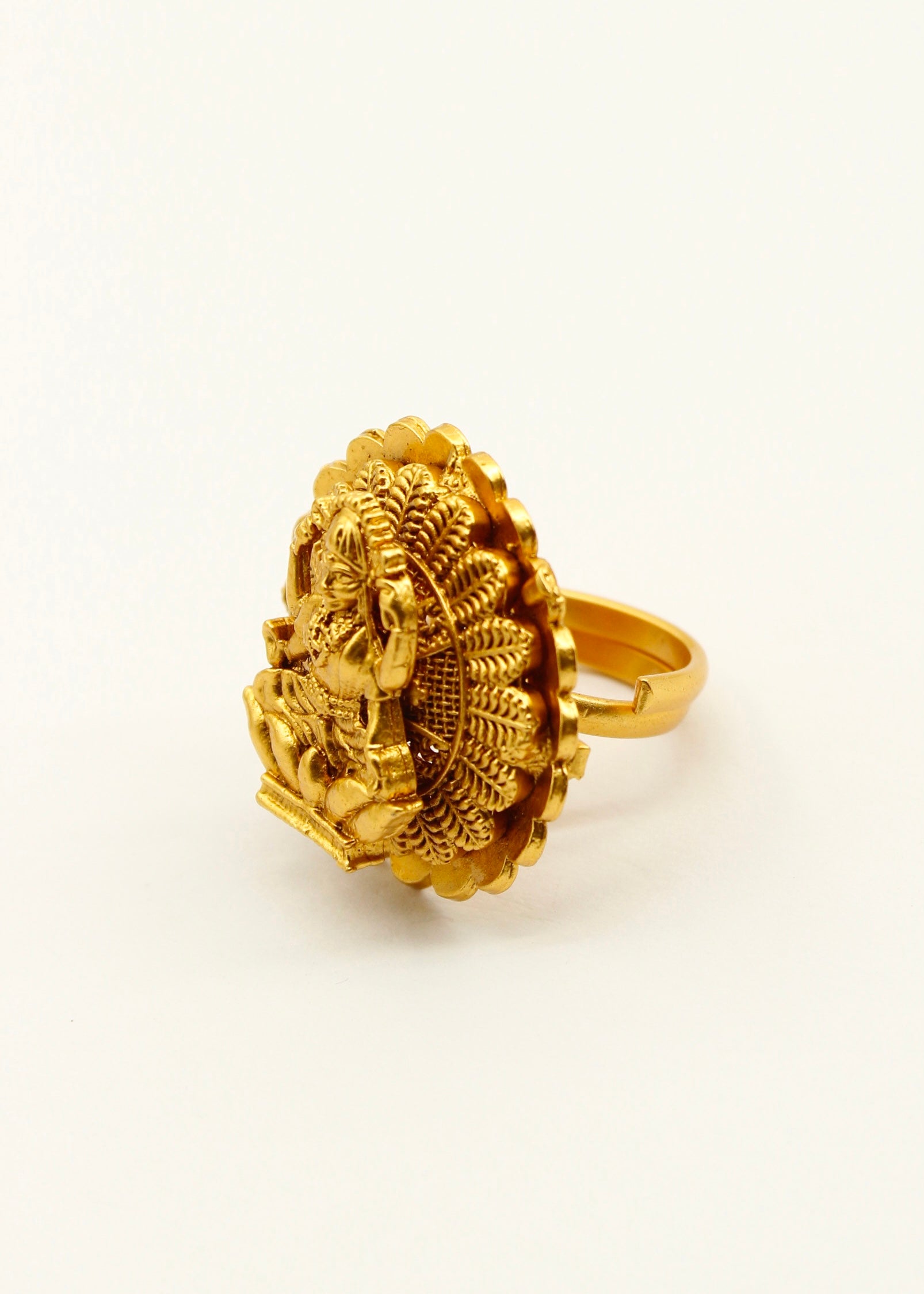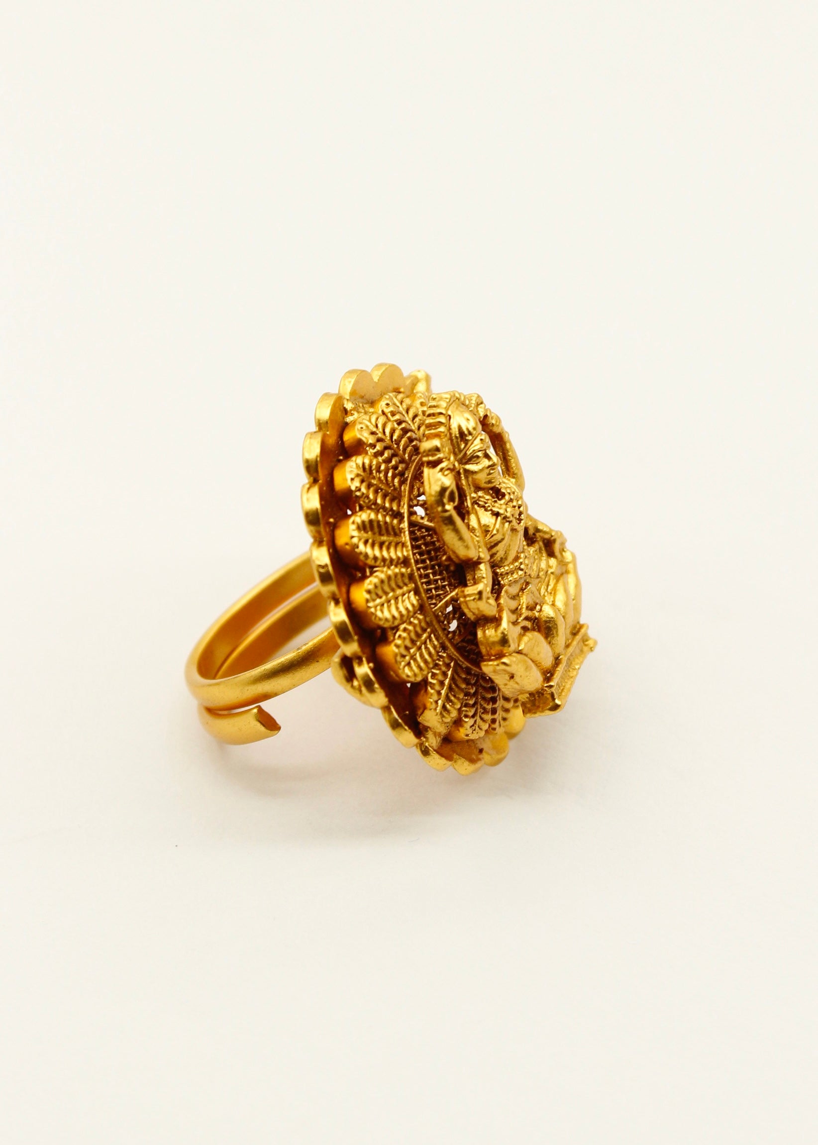 Make a wonderful addition to your jewellery drawer by adding this Temple design finger ring from Sonchafa Jewellery. It is embedded with eye-pleasing Goddess Laxmi design on metal surface. It is wonderfully crafted from highly durable matte gold finish metal.