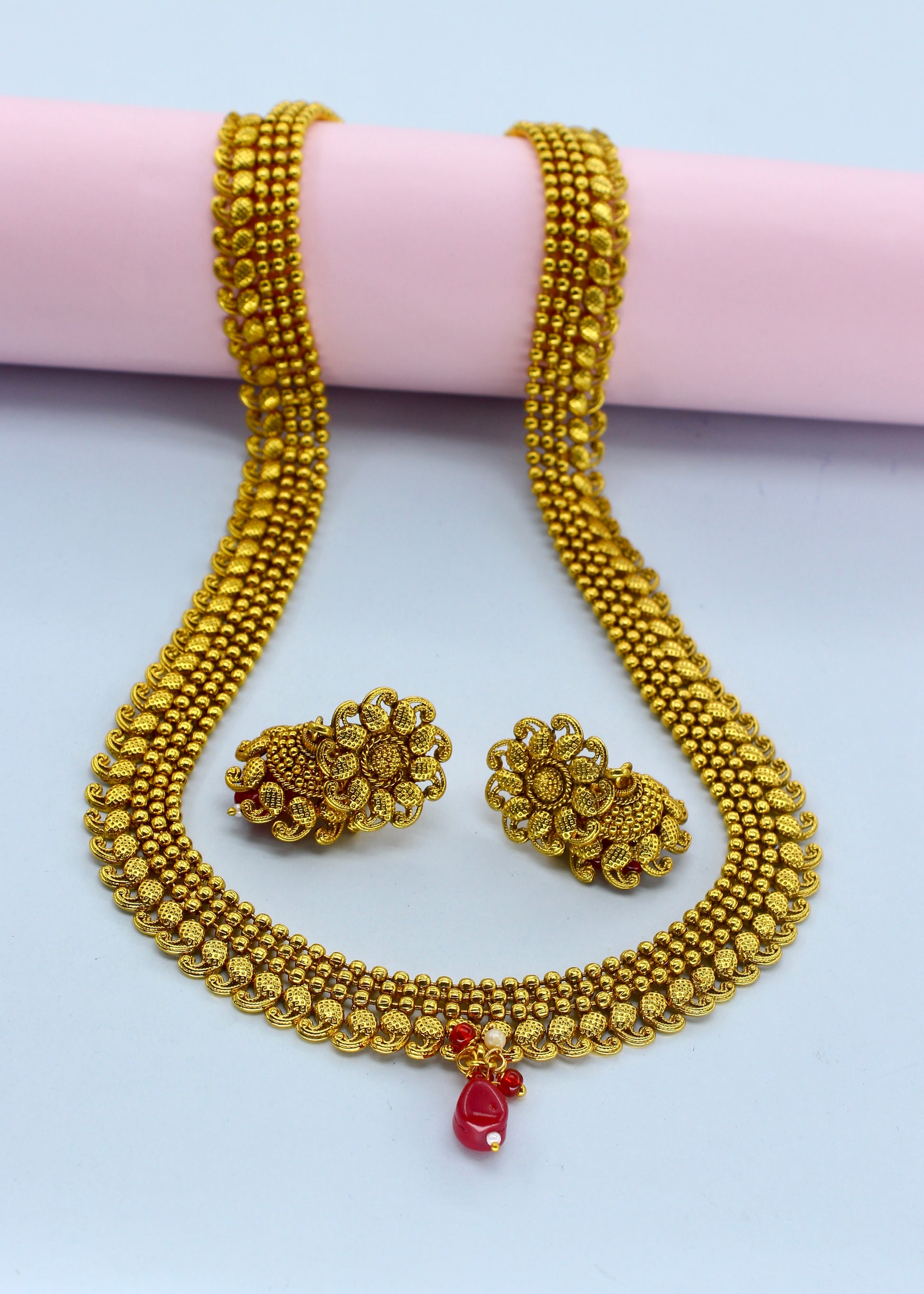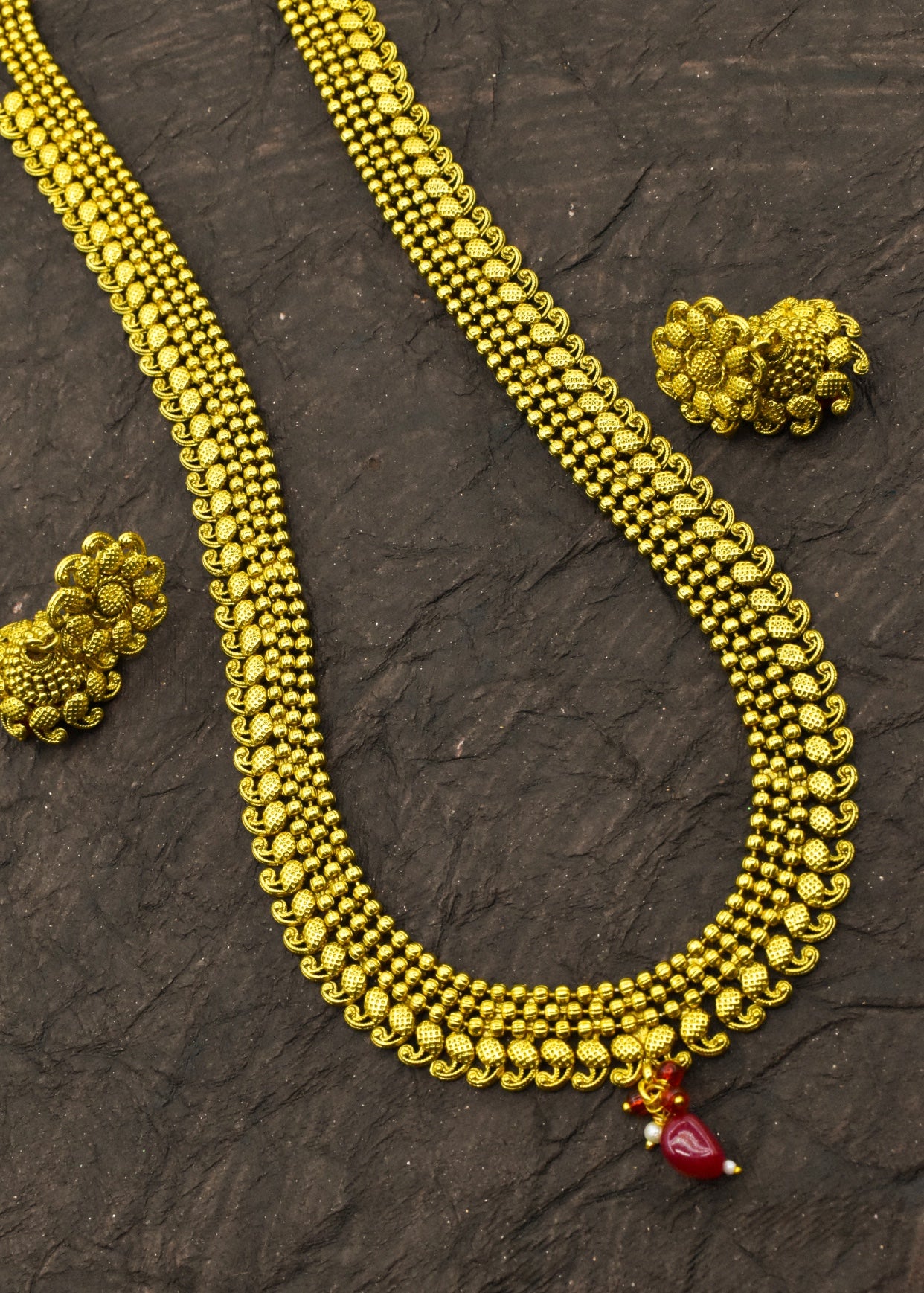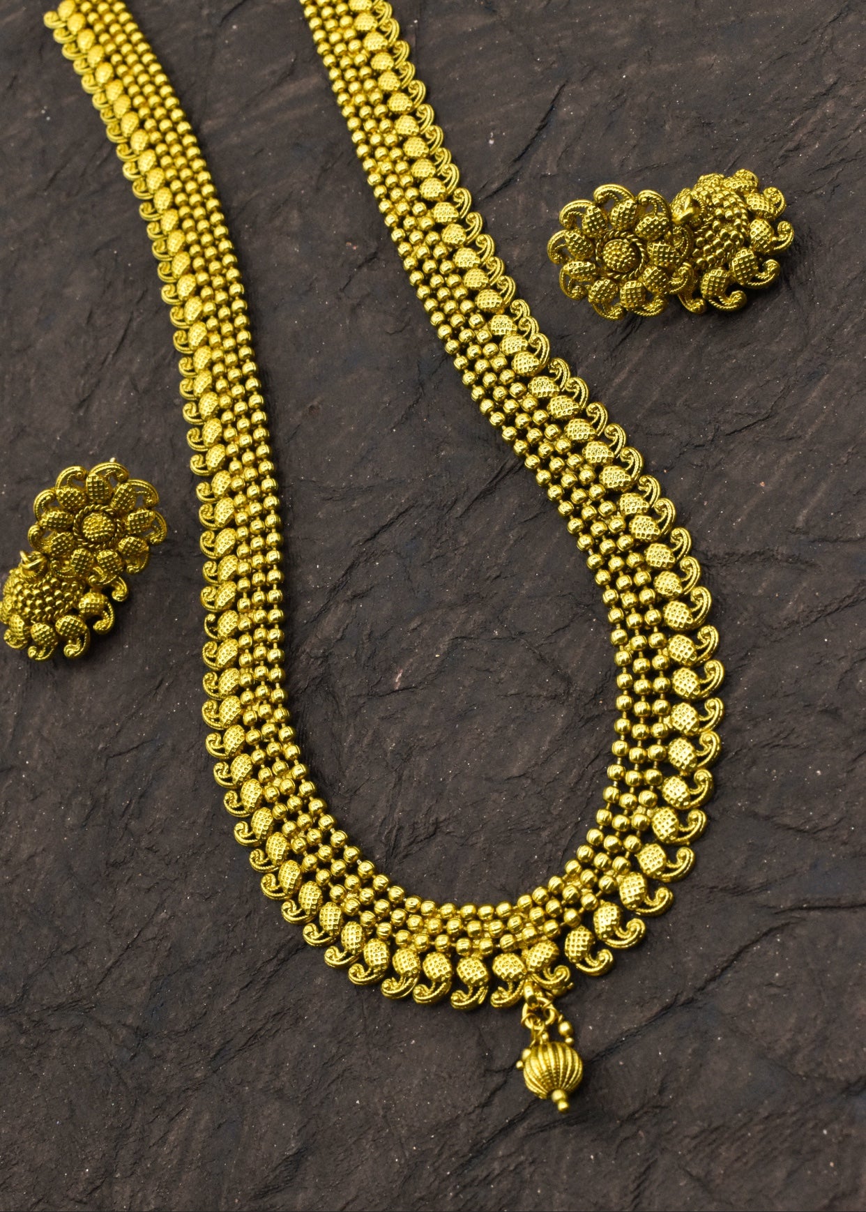 Simple golden finish delicate traditional necklace set from sonchafa Jewellery.This fancy necklace made from golden finish metal along with gold bead.This beautiful necklace easy to wear.