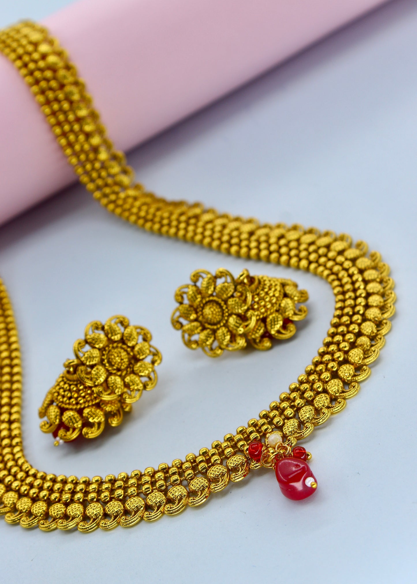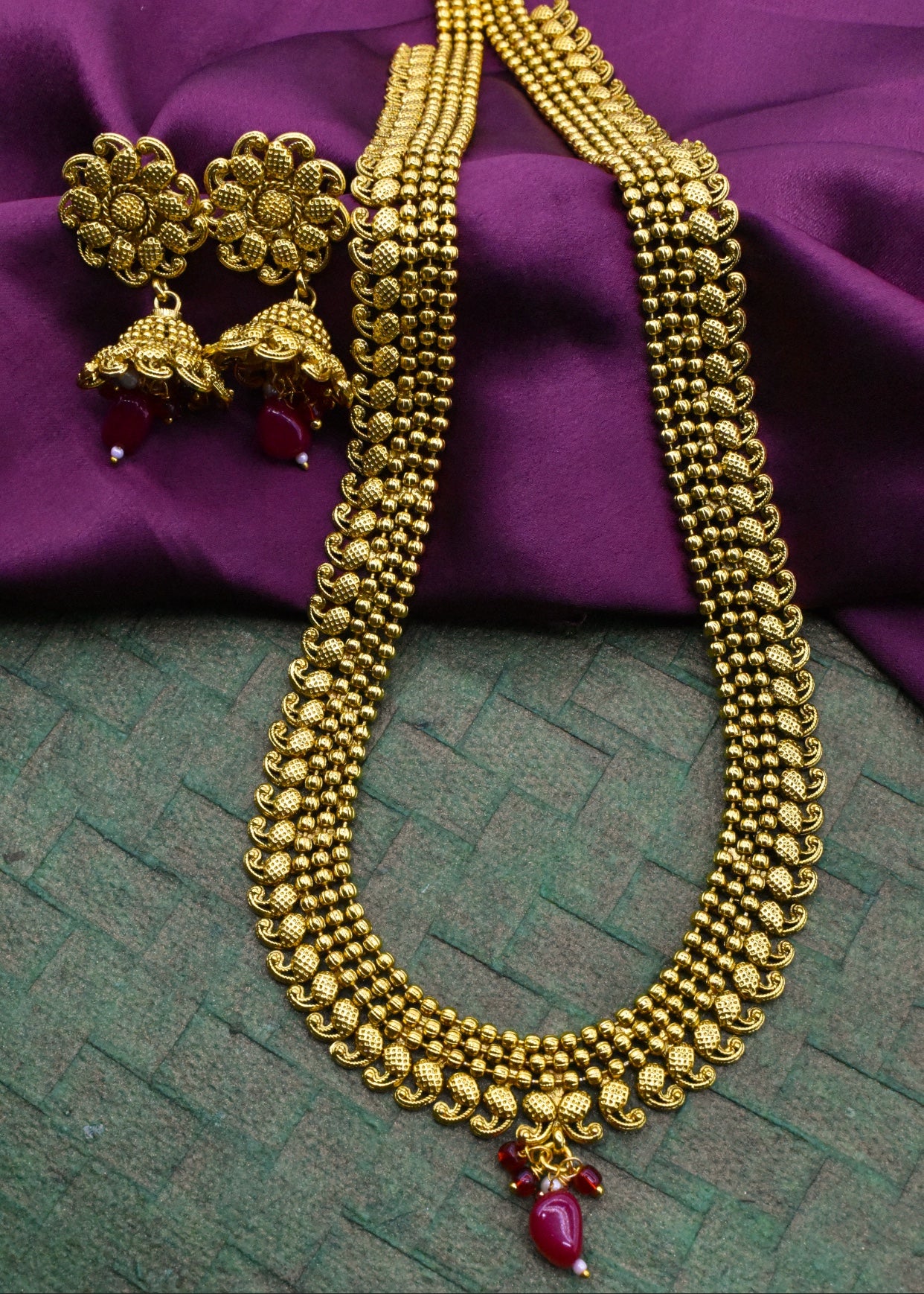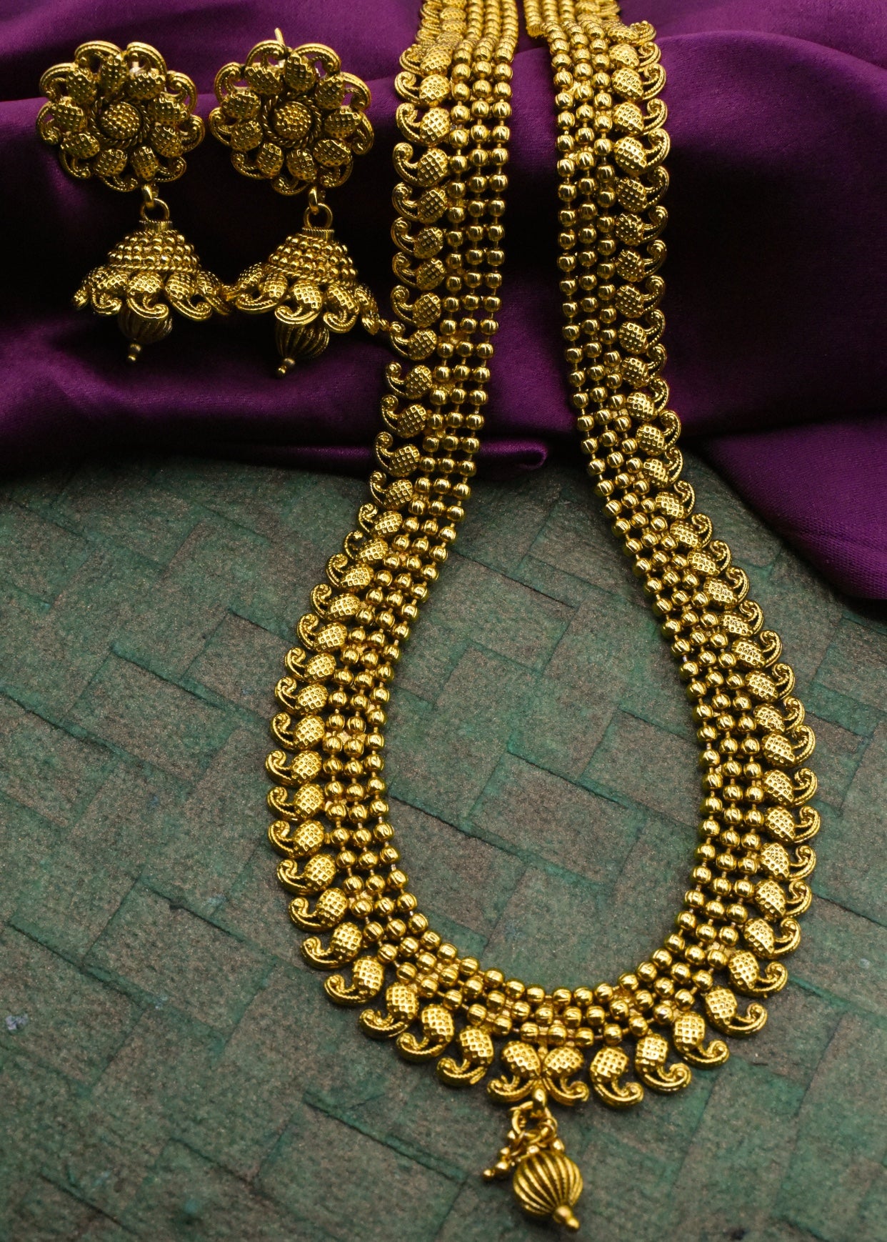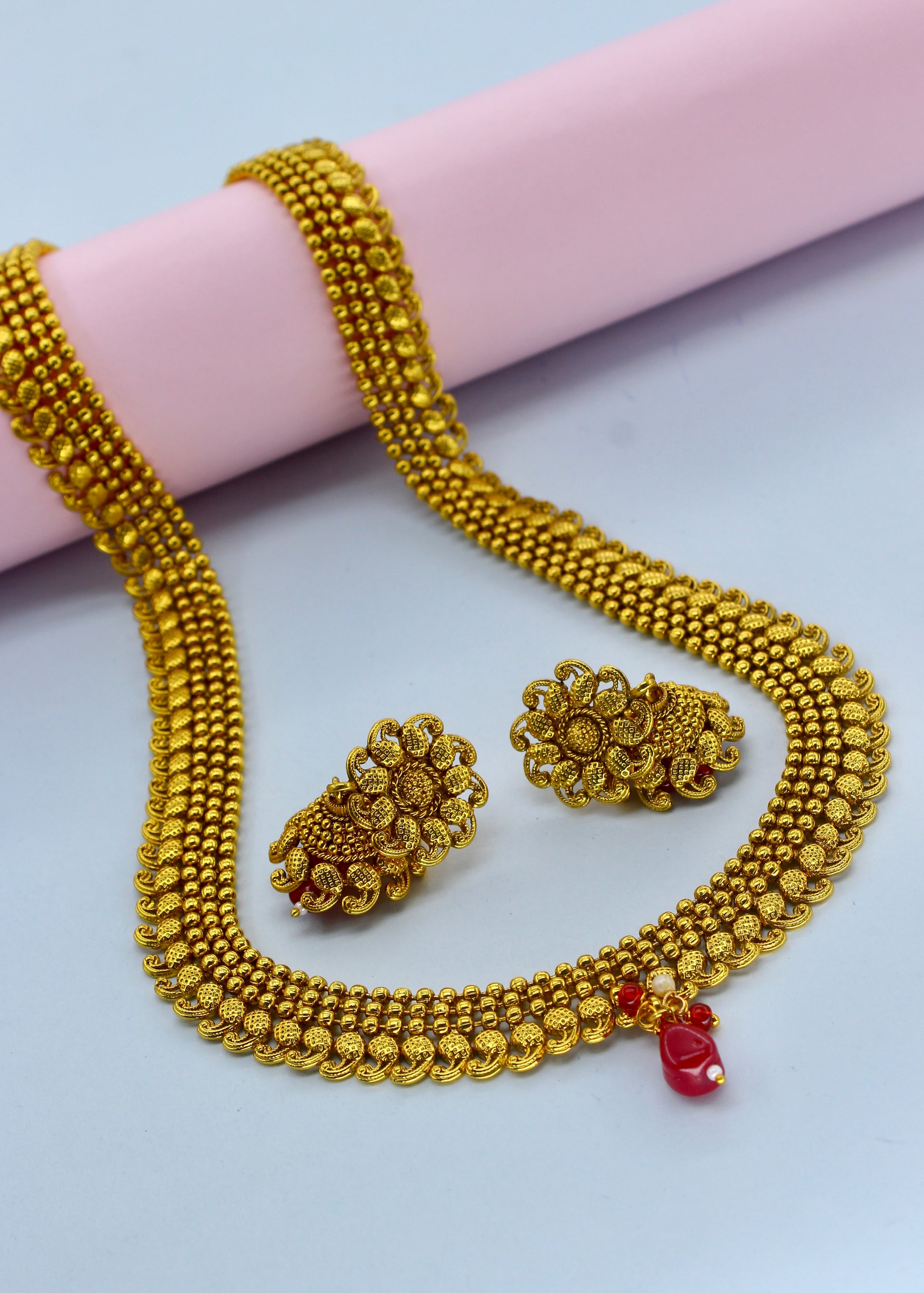 Simple golden finish delicate traditional necklace set from sonchafa Jewellery.This fancy necklace made from golden finish metal along with gold bead.This beautiful necklace easy to wear.