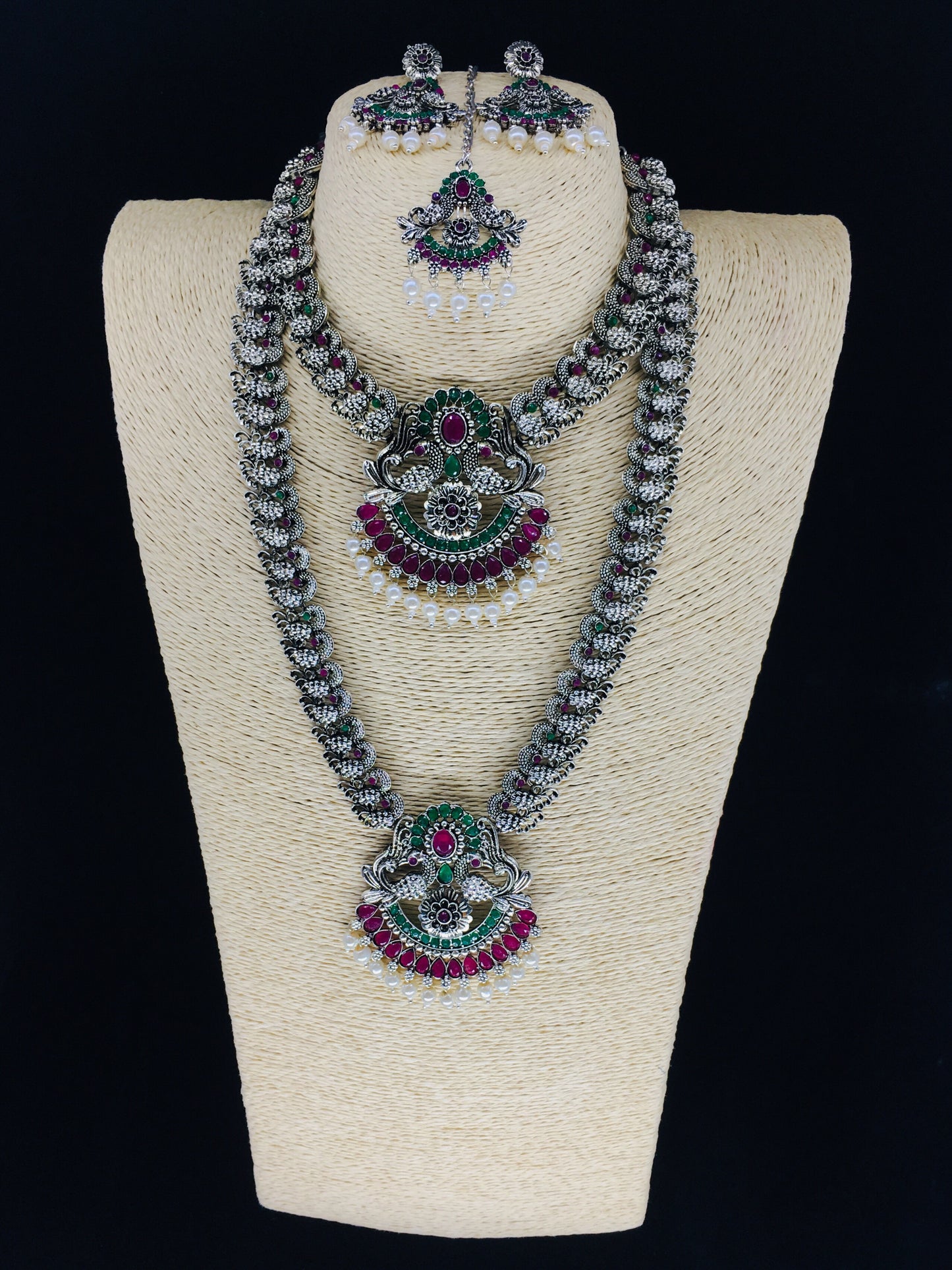 Peacock design oxidised finish long, short Necklace Set, along with Bindi From Sonchafa Jewellery for classy look. Made form Oxidised finish metal. This necklace feature intricate carving of Peacock. This oxidised jewellery will fetch you lots of compliments from onlookers for your amazing choice.