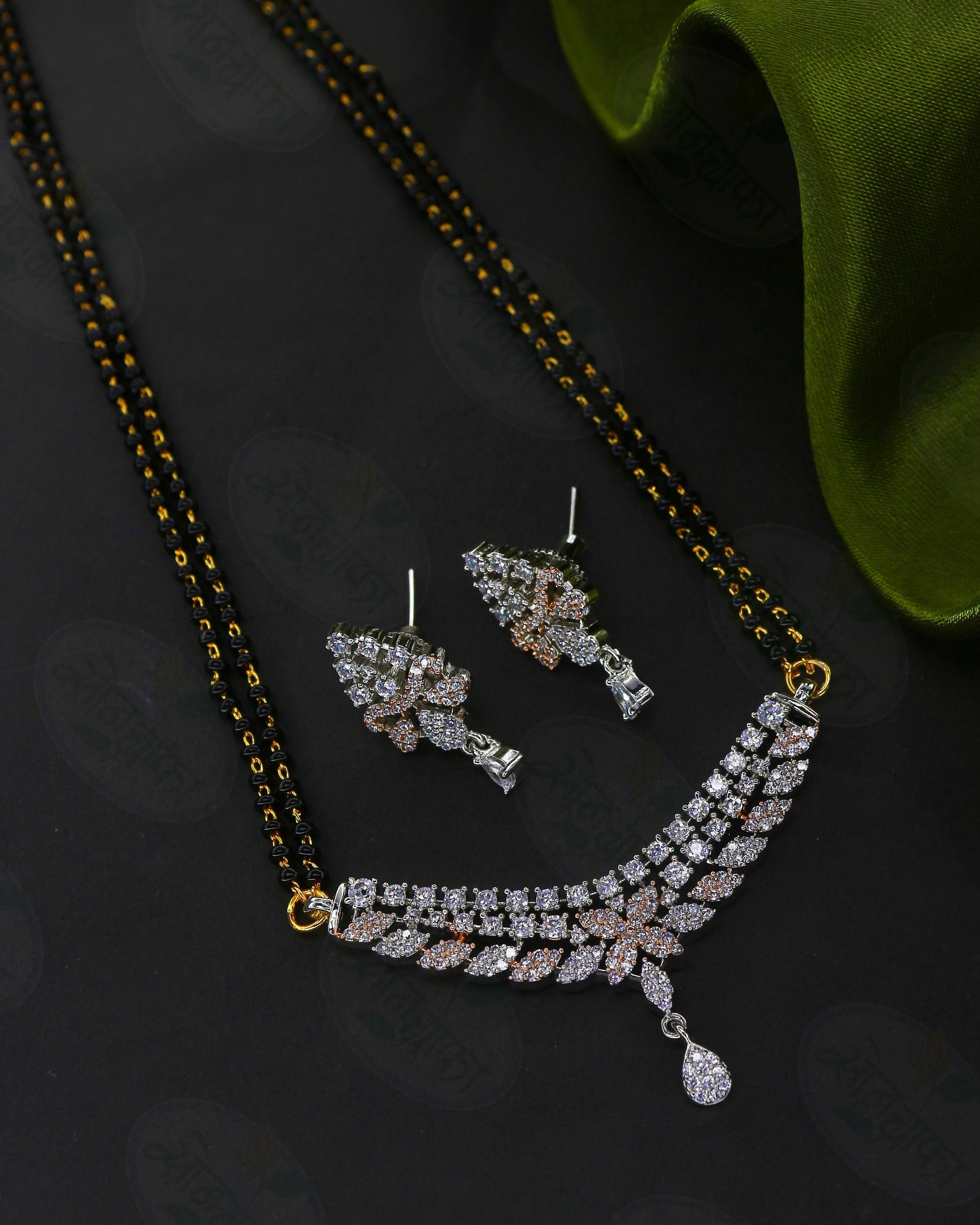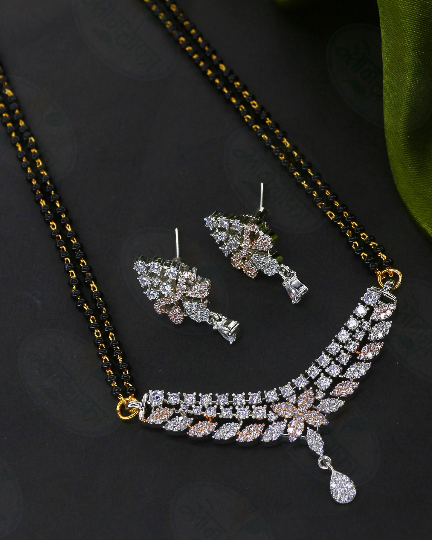Get ready to fetch endless compliments for your amazing choice in accessories. This designer Mangalsutra from Sonchafa Jewellery is styled with sparkling studded Dia diamonds and made from golden finish metal. It is woven with black beads in single layer chain. It is superior in quality and rust-resistant.
