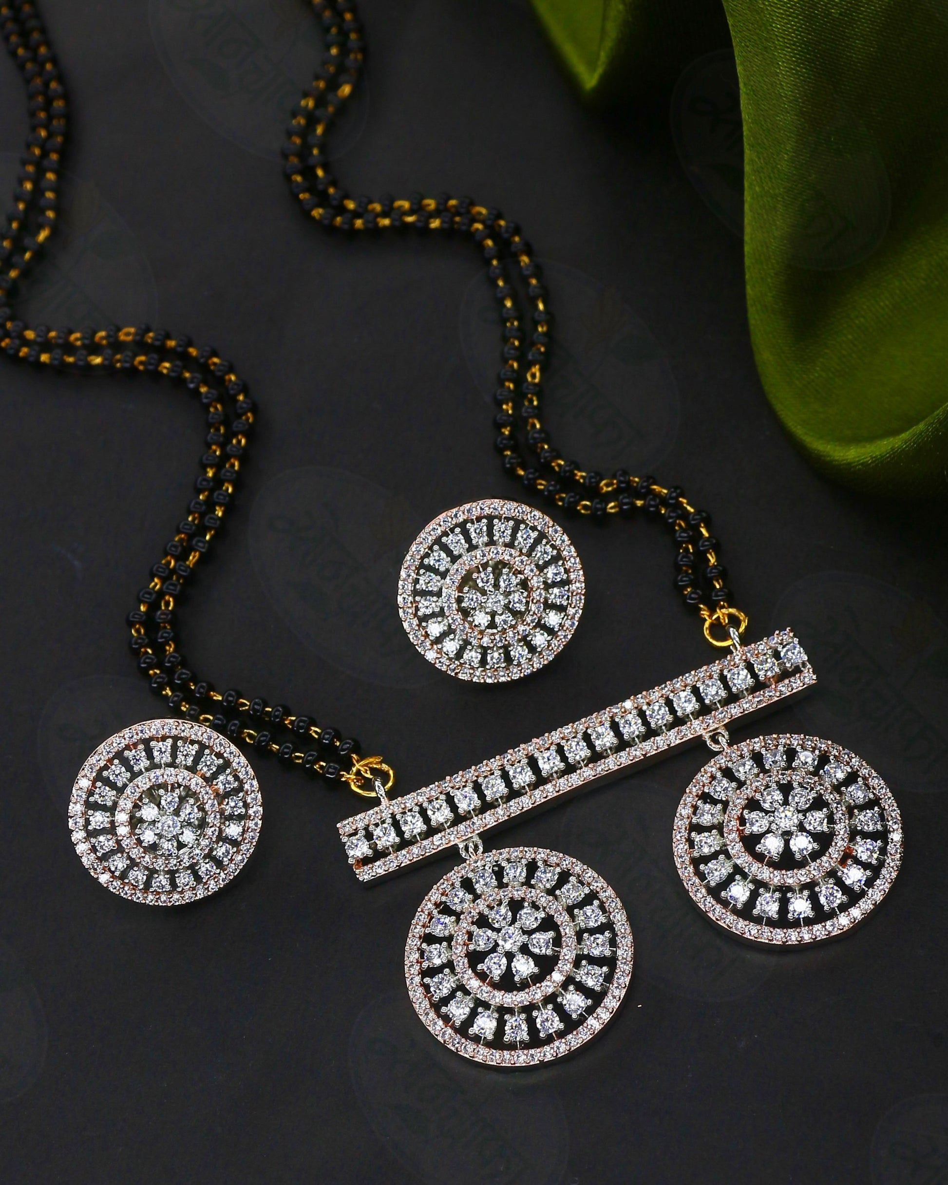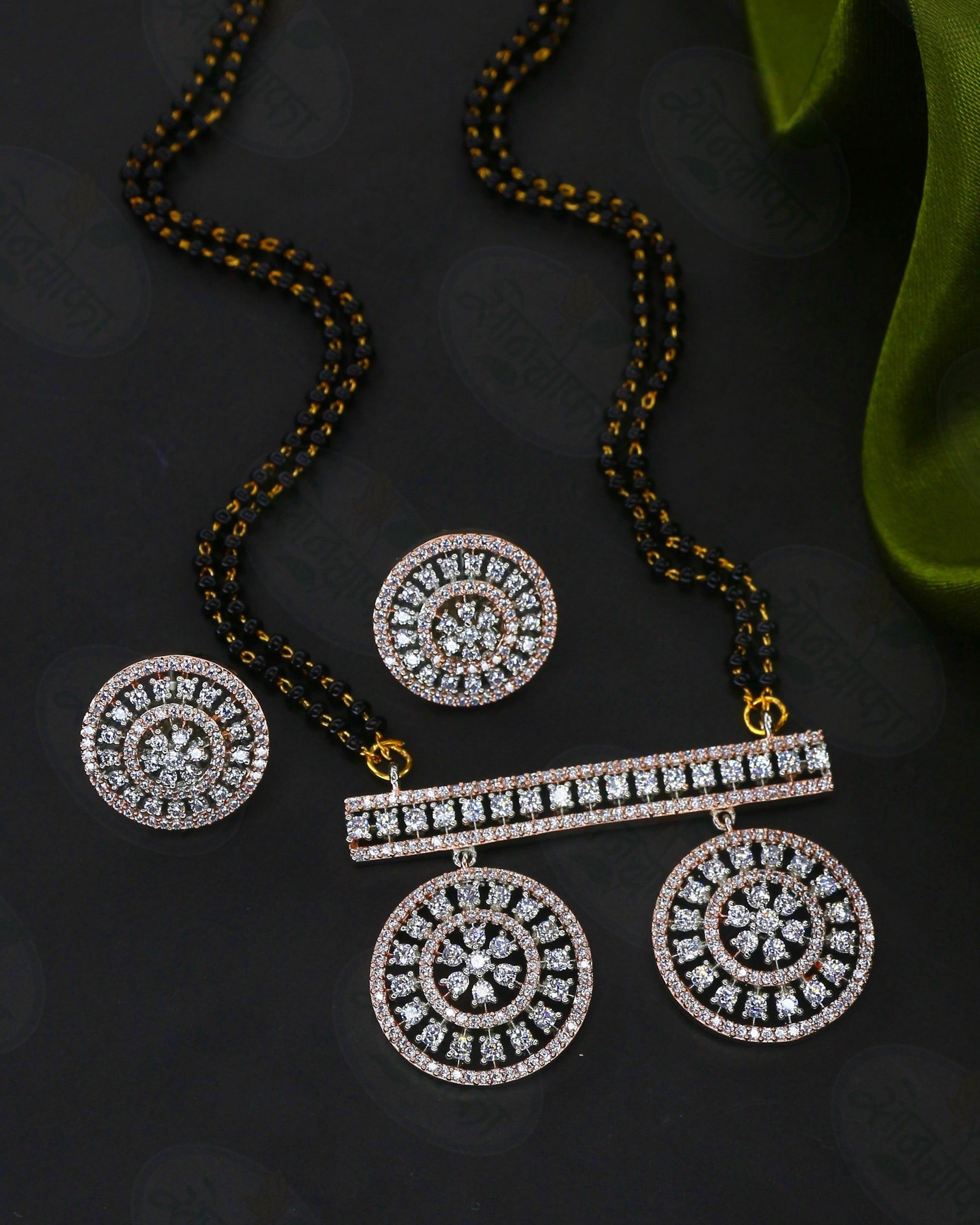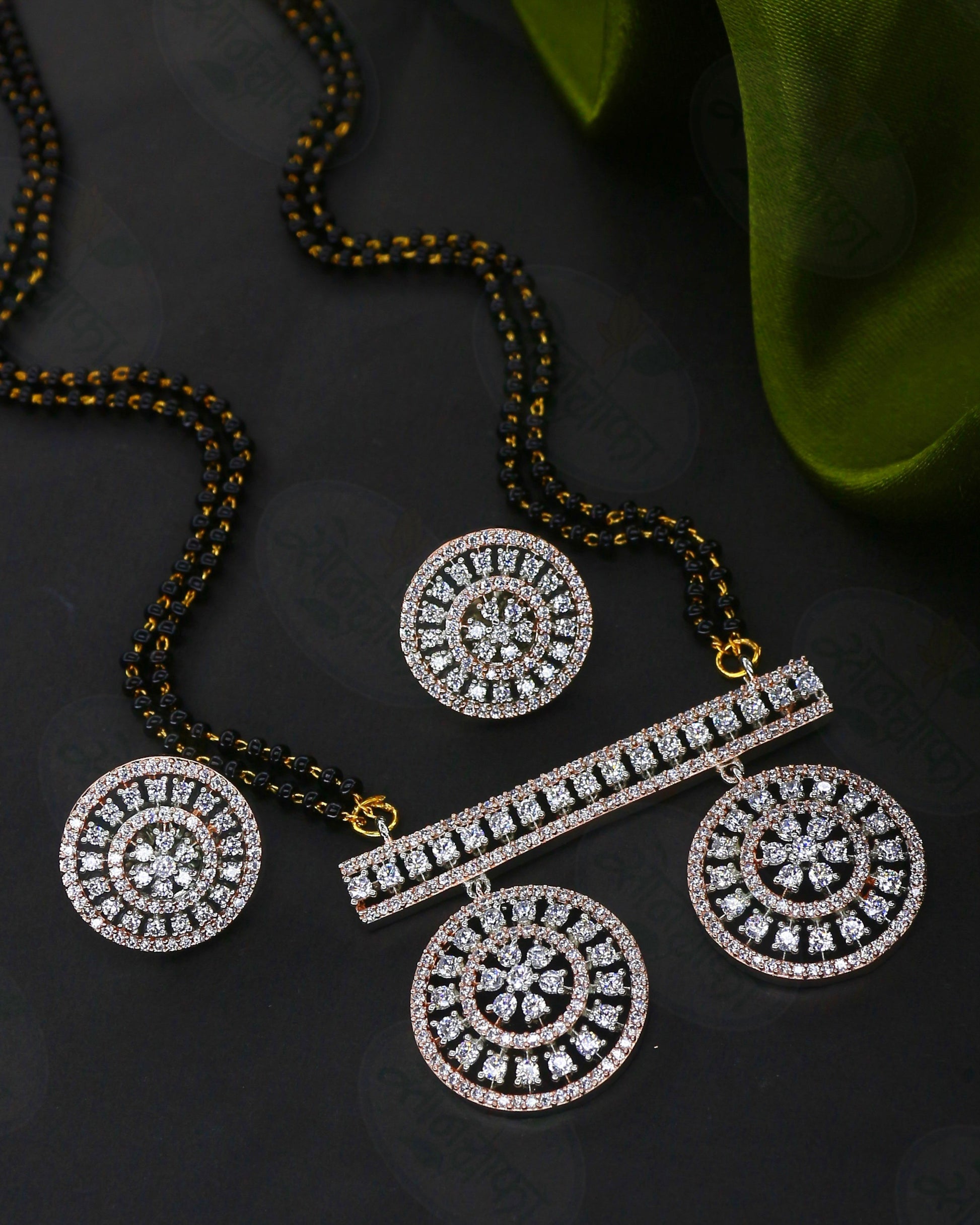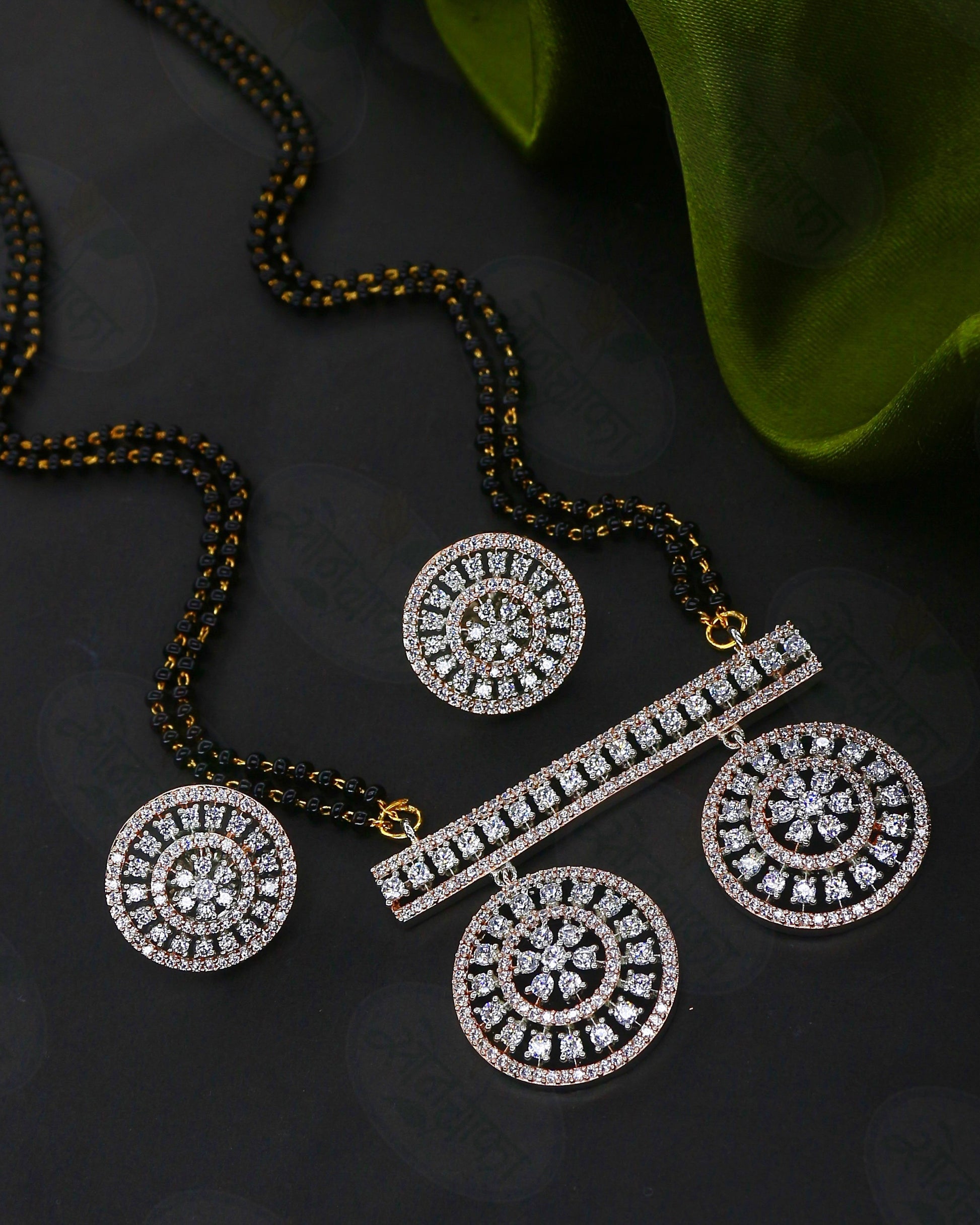 Checkout this beautiful mangalsutra from the sonchafa Jewellery which is truly very elegant and attractive. The pendant feature flawless work. In addition the pendant is attached to two layer beaded chain and it is made from rose gold finish metal.