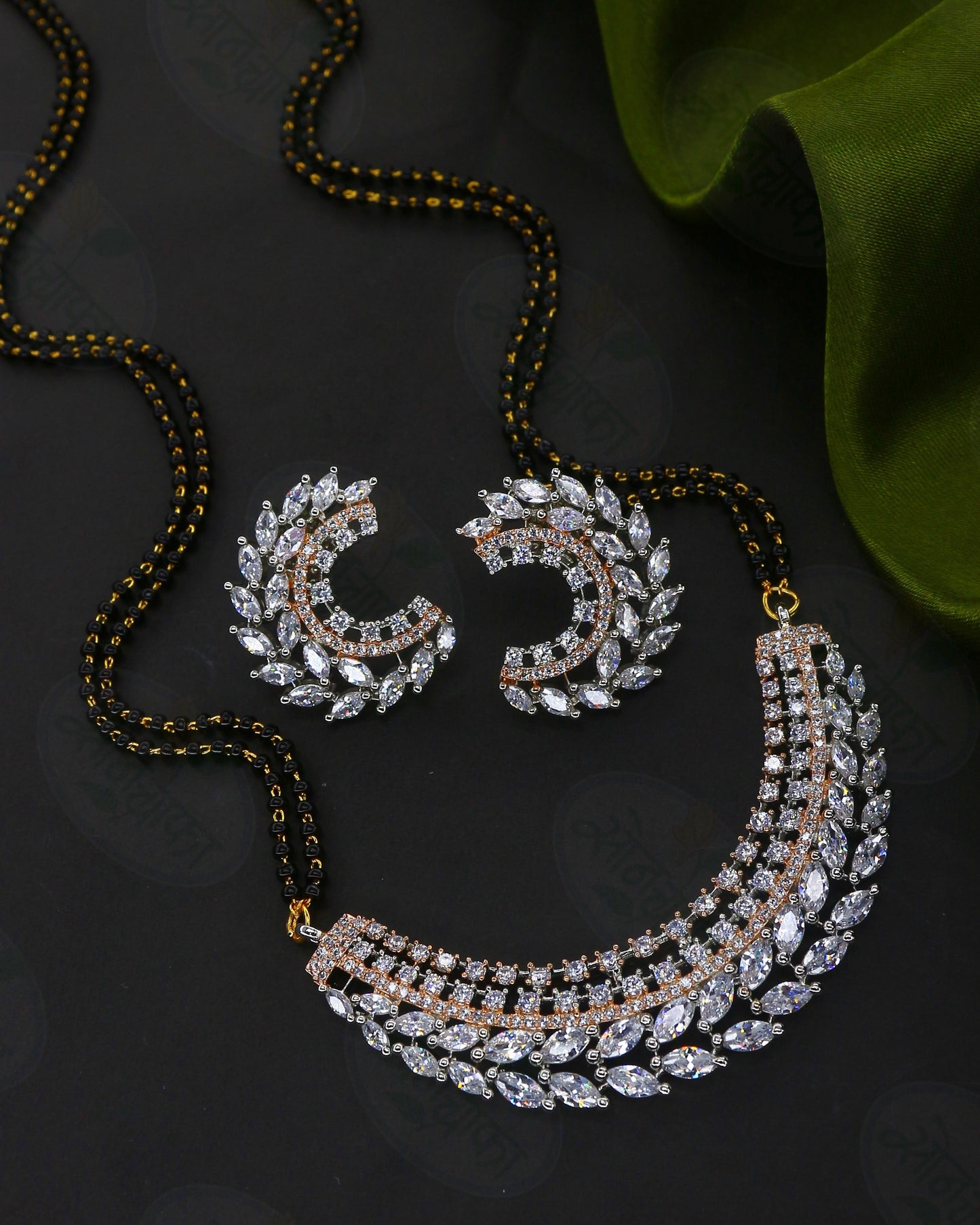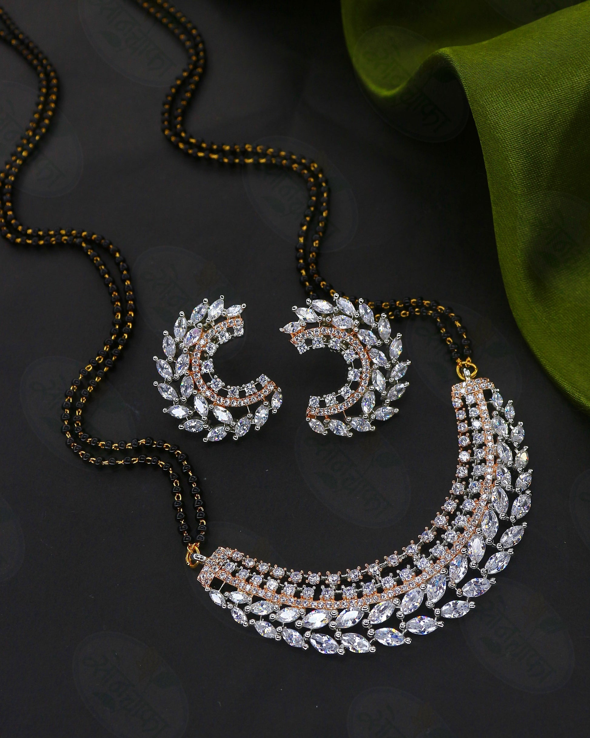 Mangalsutra is must have ornament for married women. Sonchafa Jewellery offers this beautiful mangalsutra for stylish married women. It is studded with sparkling white dia diamond stones and fashioned from golden finish metal. The droplet designer pendant has droplet for more attraction.