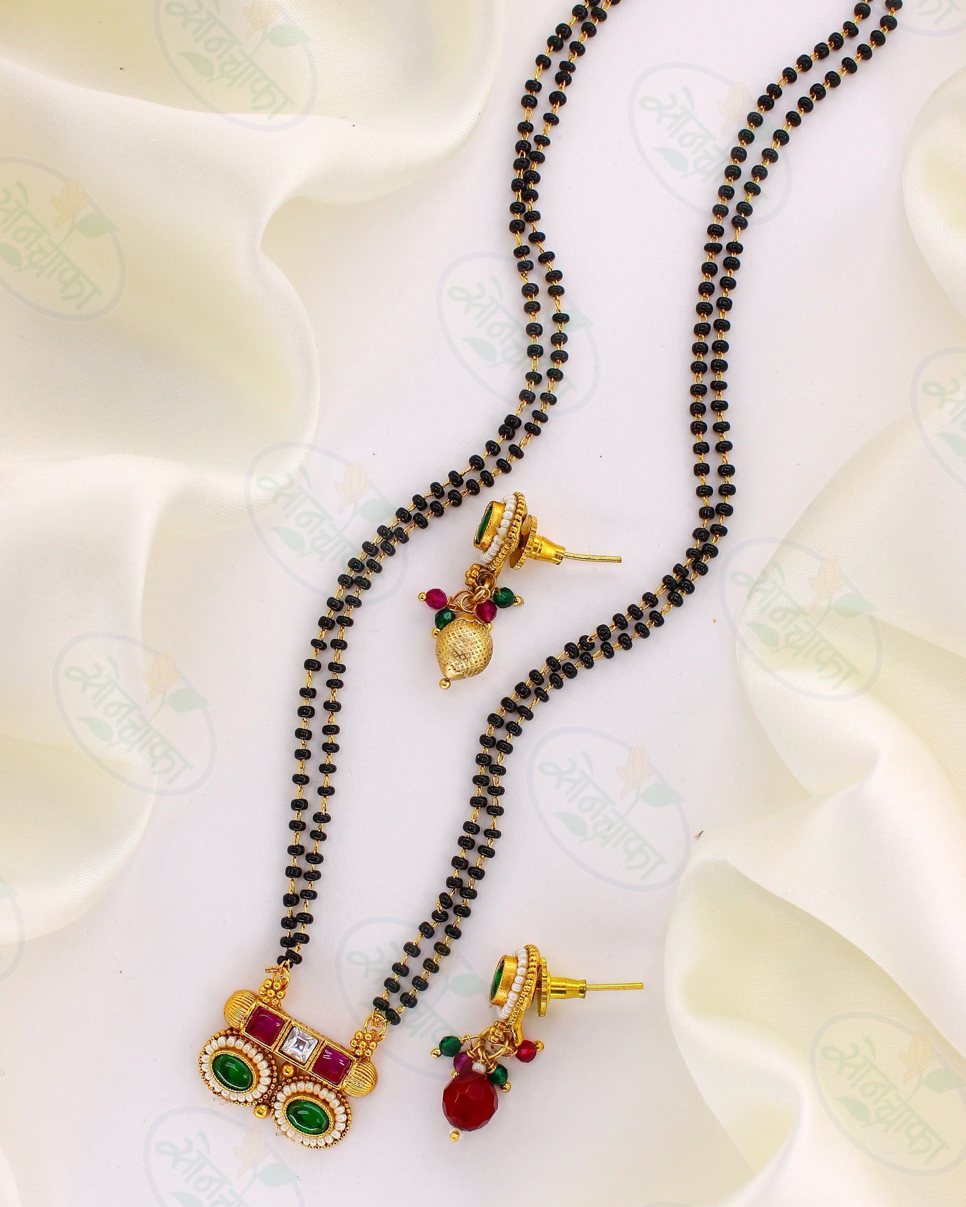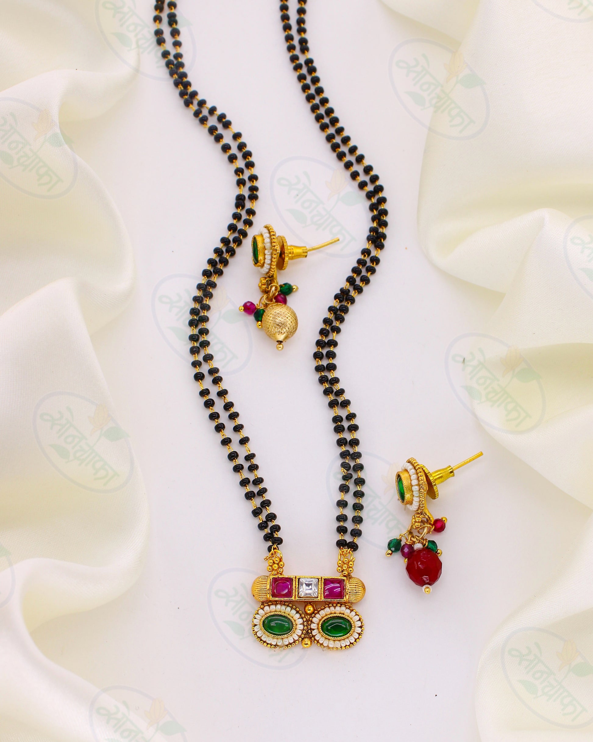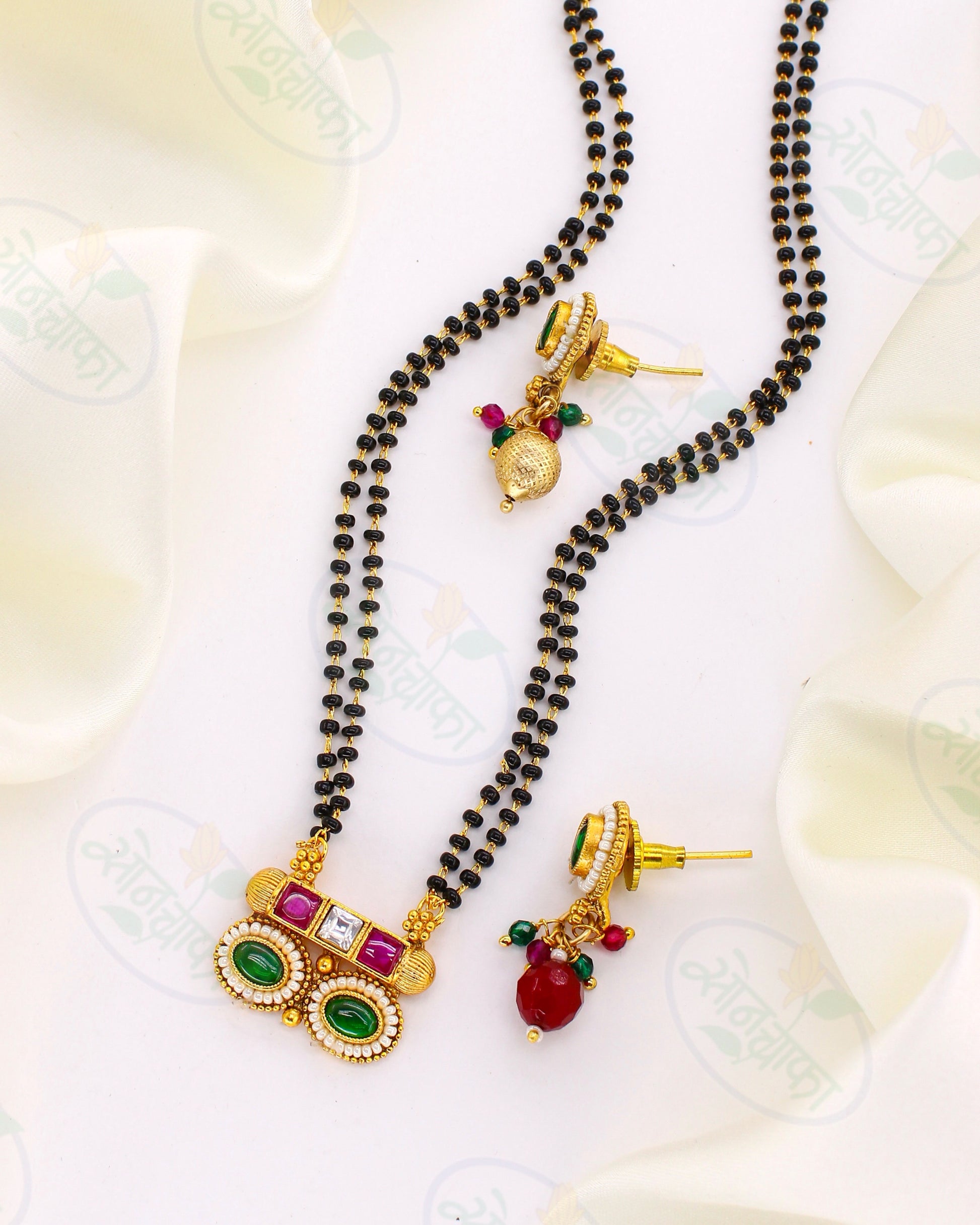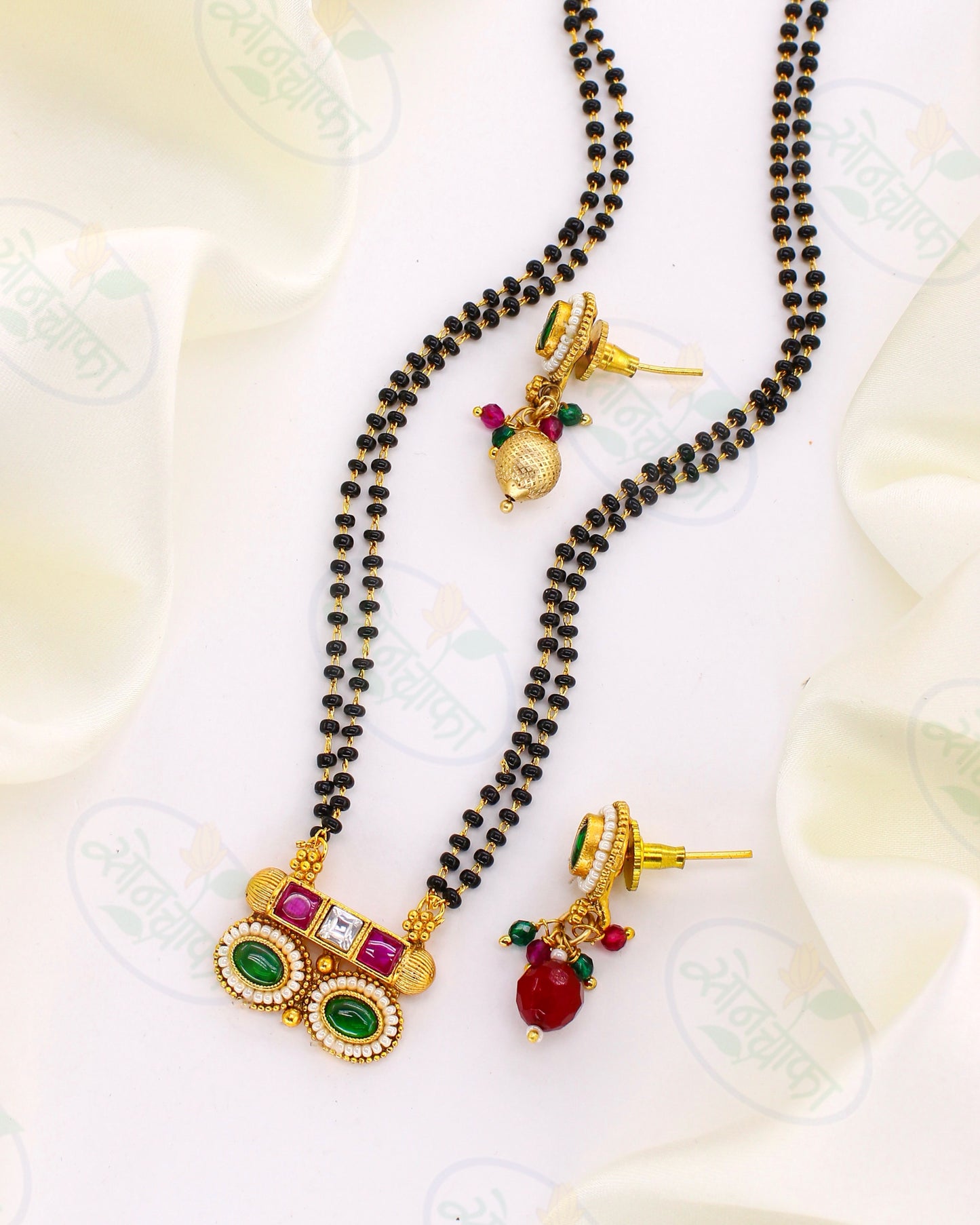 Get that different look by clubbing this antique gold finish adorable mangalsutra from Sonchafa Jewellery. It is style with floral designer pendant attached with single layer black beaded chain along with studded pink, white, green stone. It is decorated with dangled golden beads for added attraction.