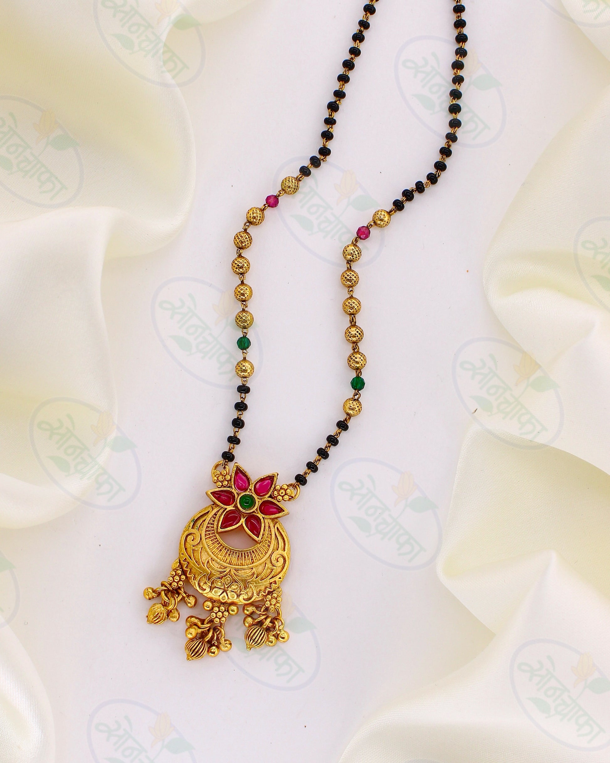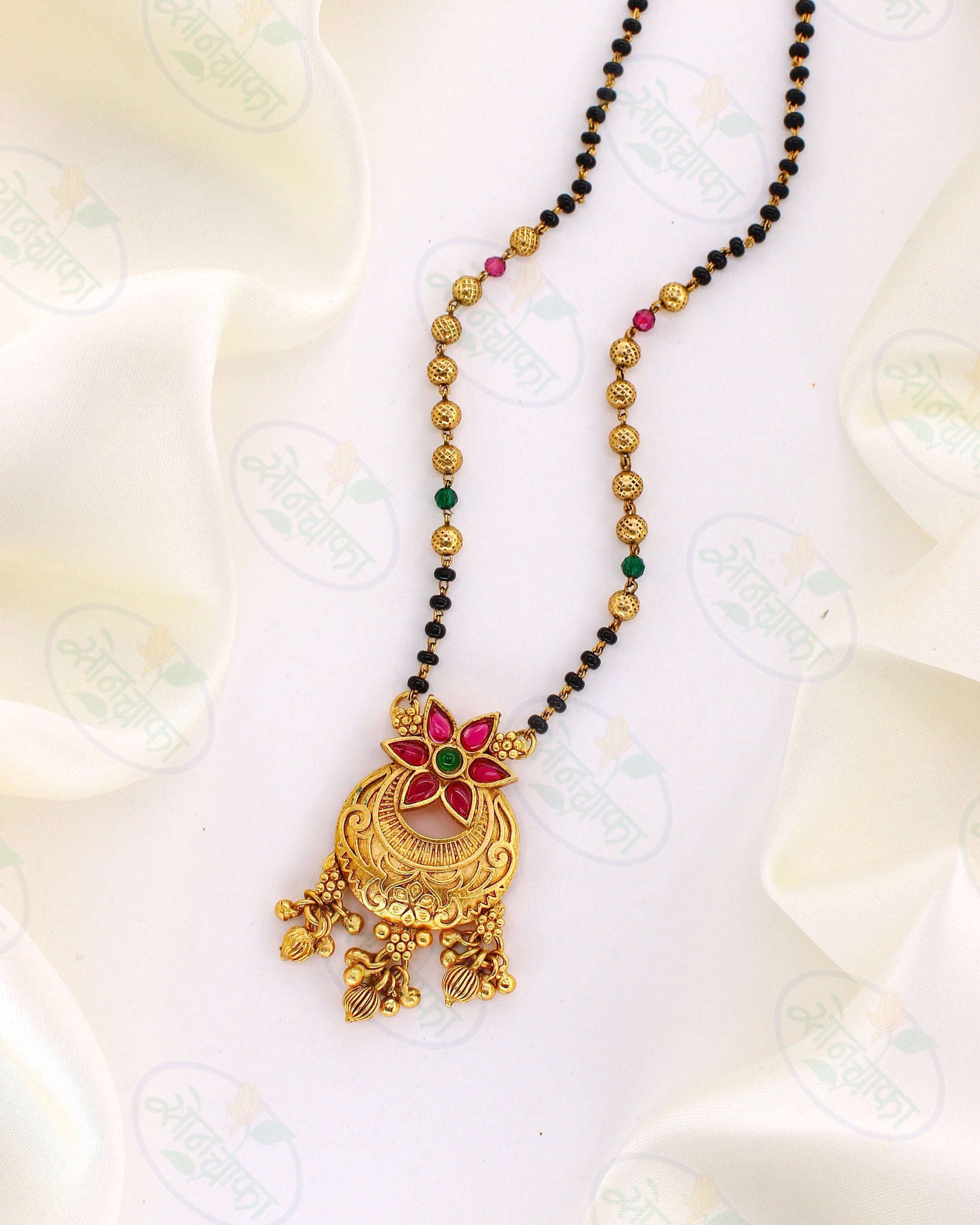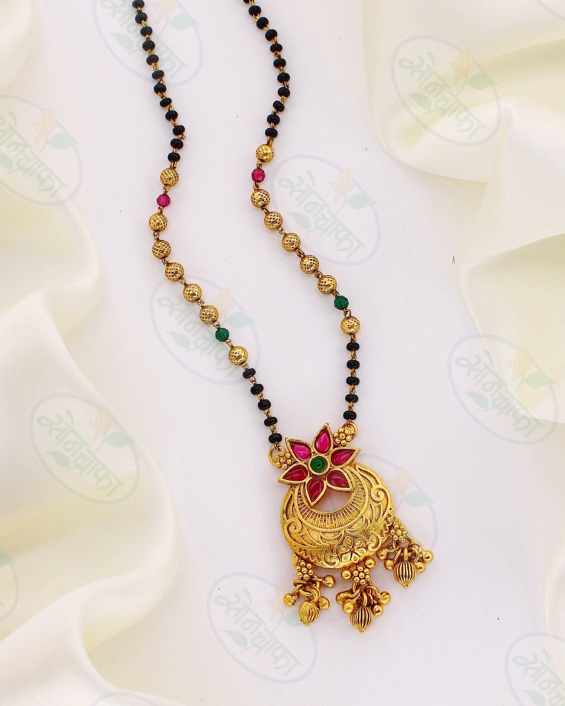 Married women will surely love to wear this antique gold finish beautiful mangalsutra set. The pendant is embedded with sparkling pink-green stones and feature eye-pleasing intricate carving design. It is crafted from gold finish metal and ensures high durability.