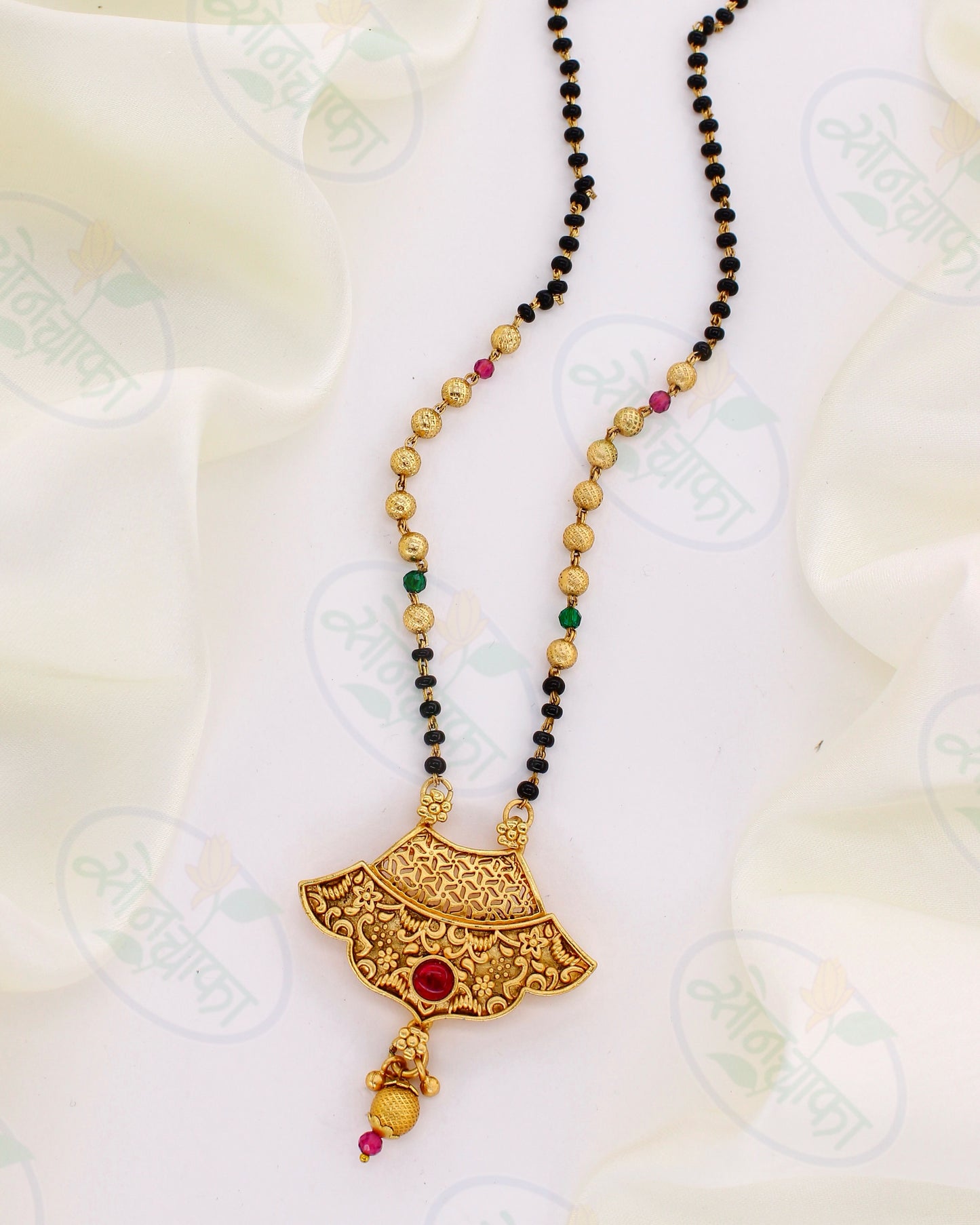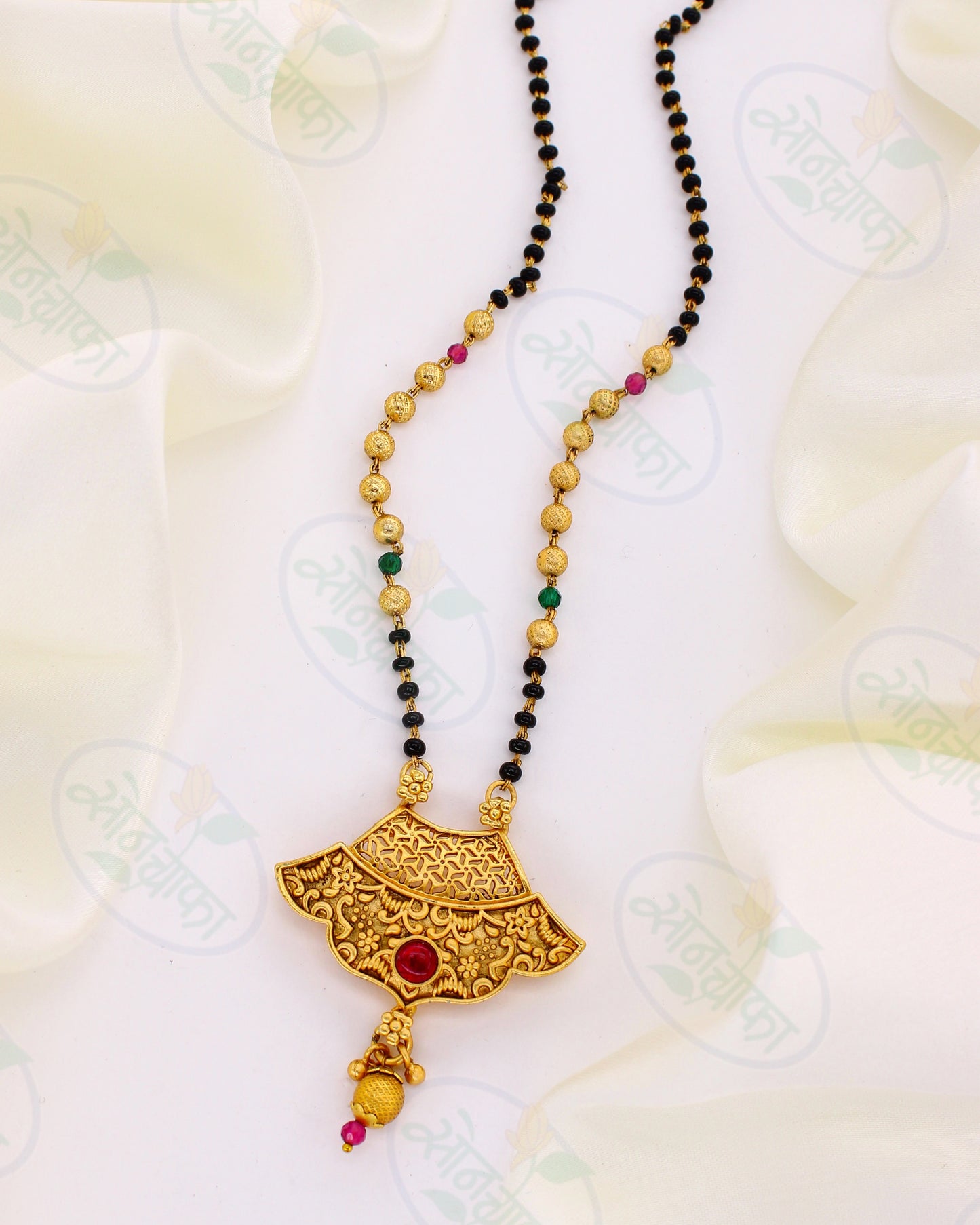 If you are married then you must pick this floral unique designer pendant wonderful mangalsutra from the house of Sonchafa Jewellery. It is studded with sparkling pink stone and made from antique gold finish metal. The pendant is attached to single layer of golden, black colour beads. It ensures high durability and rust-resistant as well.