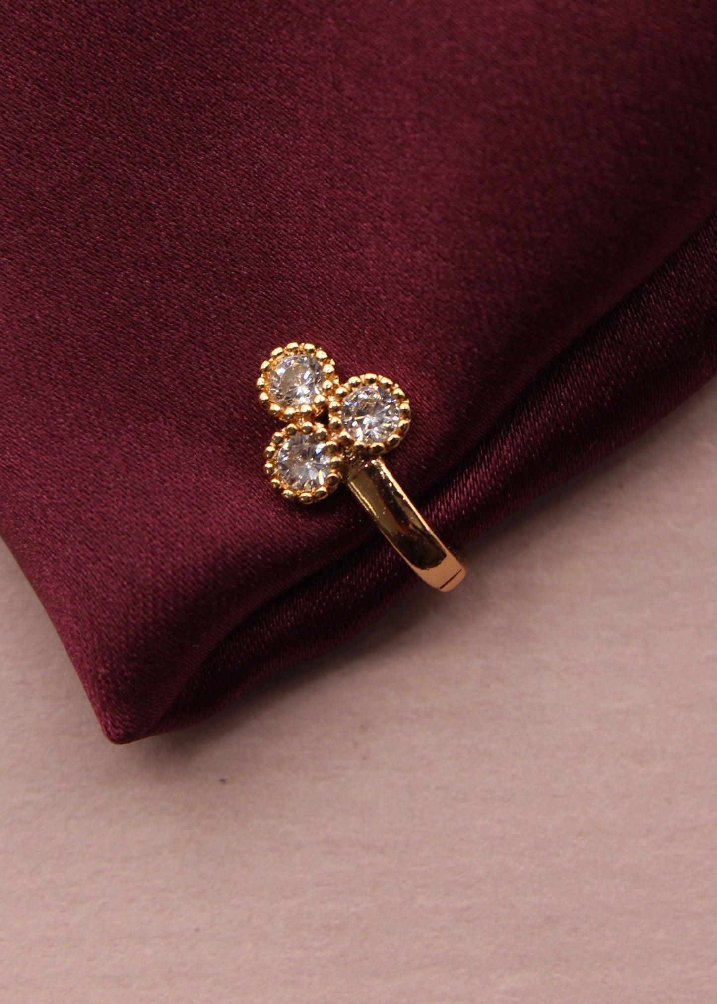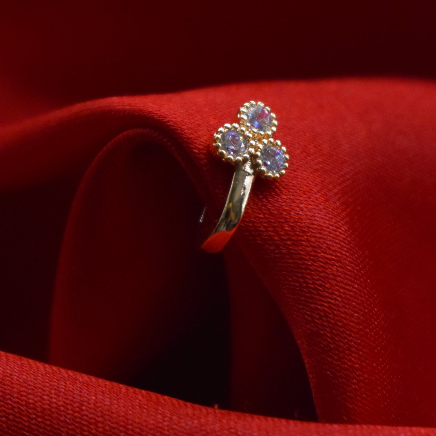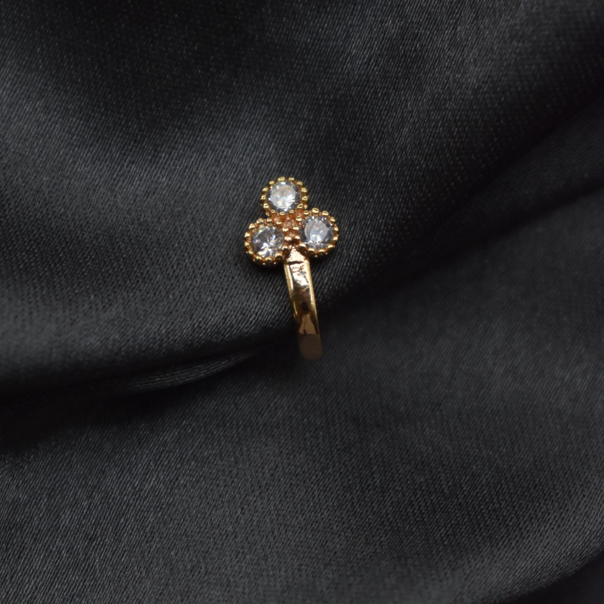 Classy adorable gold finish nose pin in trendy look from sonchafa jewellery. It is styled with golden finish nose pin features intricate stone design and has enamel work on it which gives appealing look. You can adorn this nose pin easily use it is press on