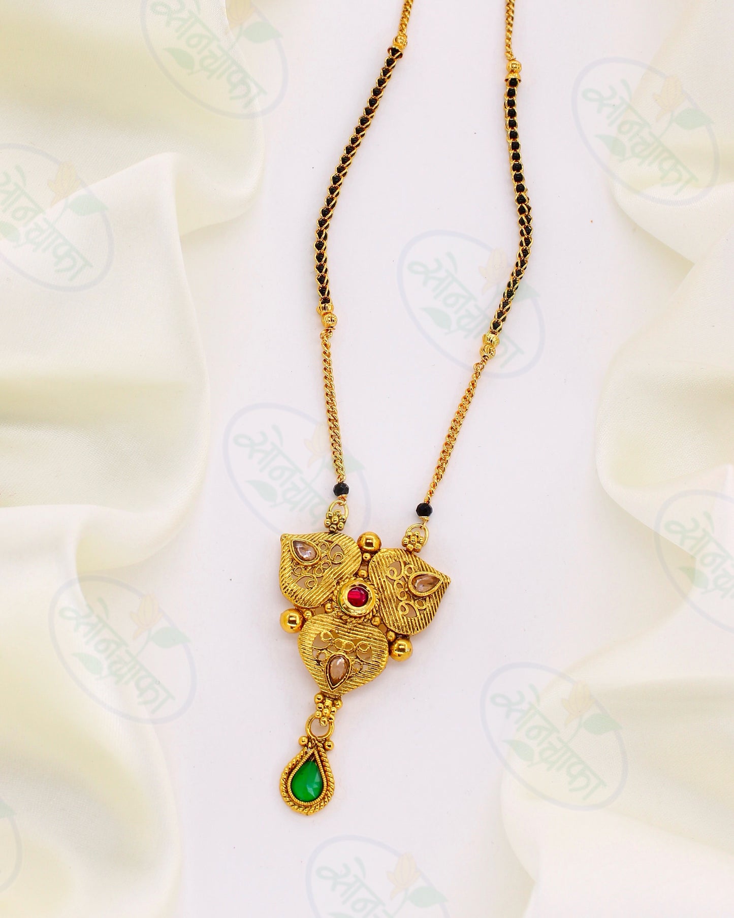 Style up this designer mangalsutra with your casual outfits and see your looks getting transformed. This mangalsutra intricates leaf with floral design with small adorable golden ball that brilliantly grab attention of onlookers very easily. It is studded with pink, green stone and made from antique gold finish metal. This piece of jewellery will surely be your fashion companion and go with trend for many years.
