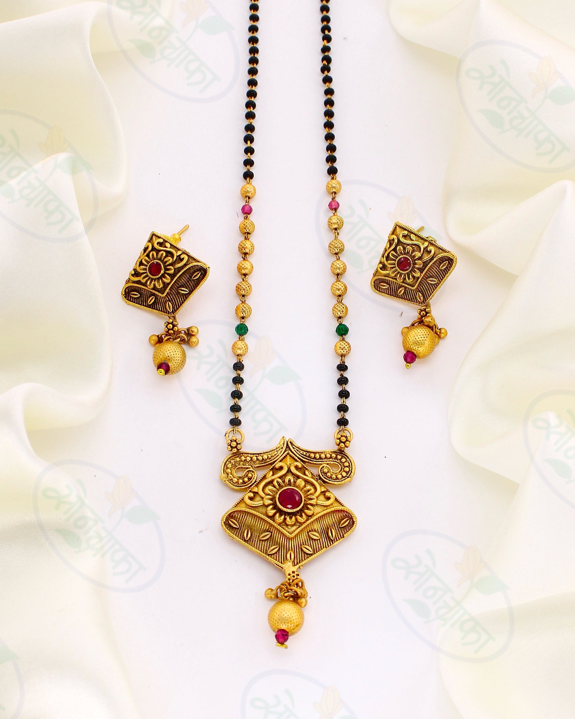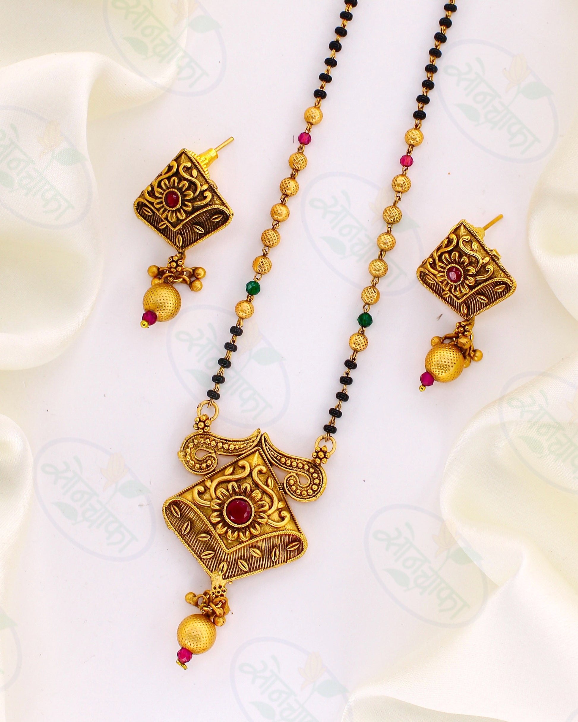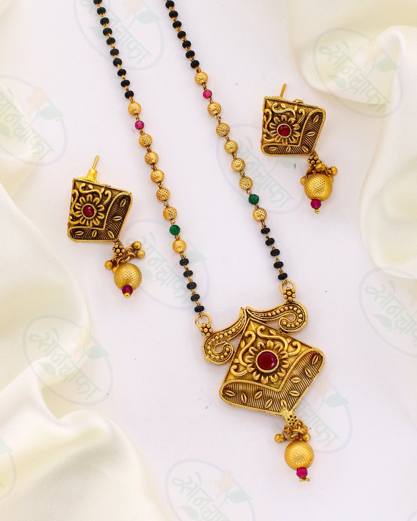 Get that different look by clubbing this antique gold finish adorable mangalsutra from Sonchafa Jewellery. It is style with floral designer pendant attached with single layer black beaded chain along with studded pink stone. It is decorated with dangled golden beads for added attraction.