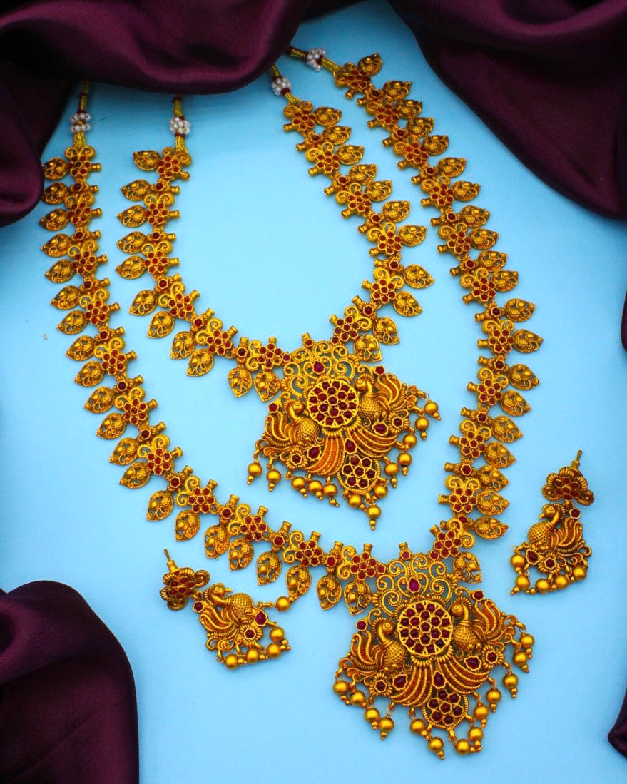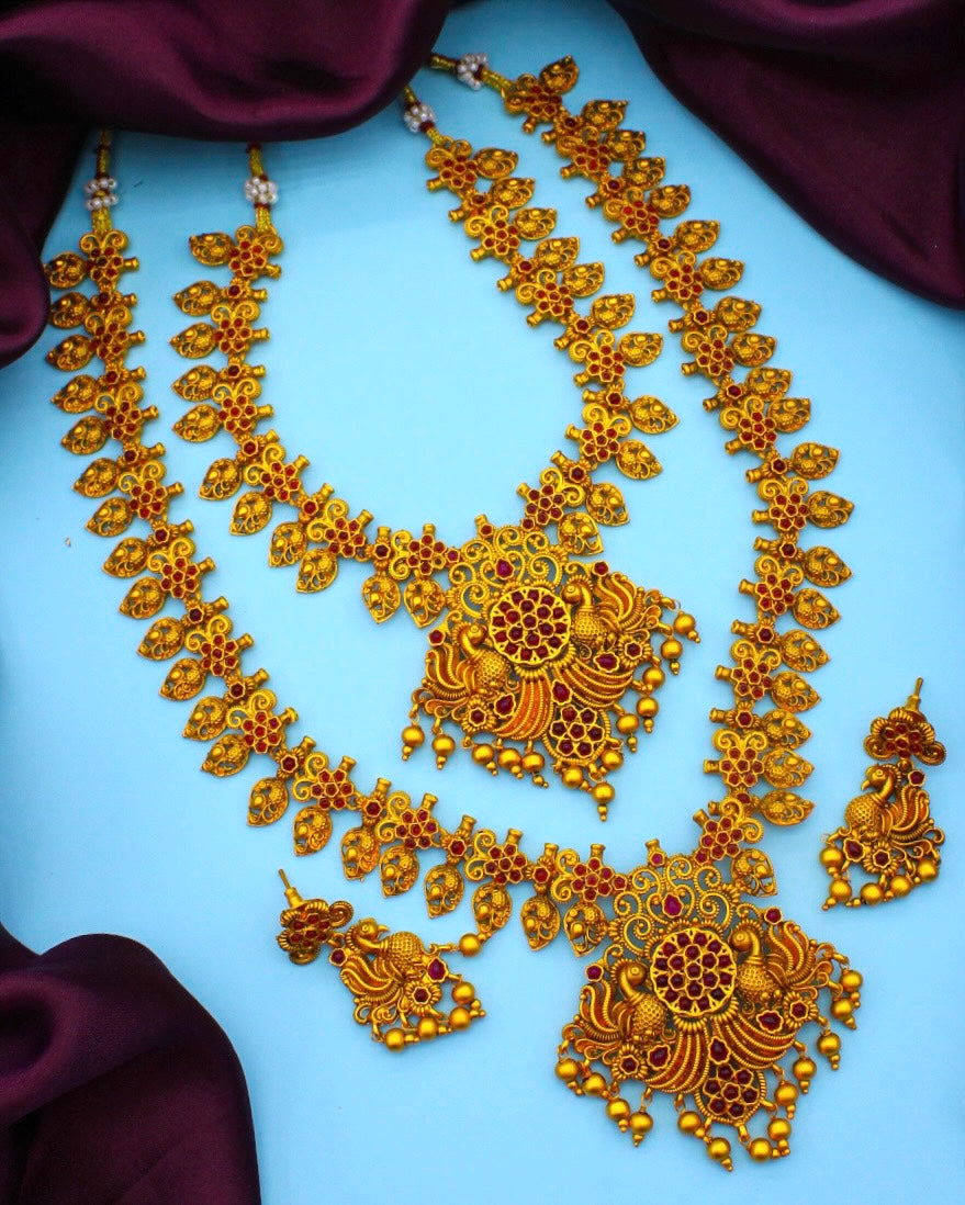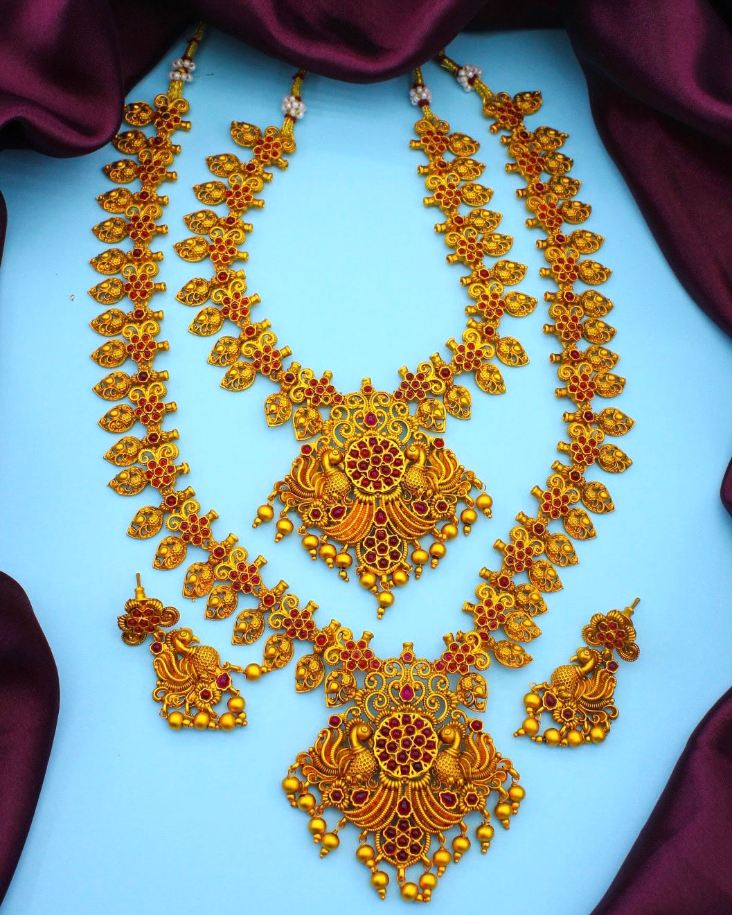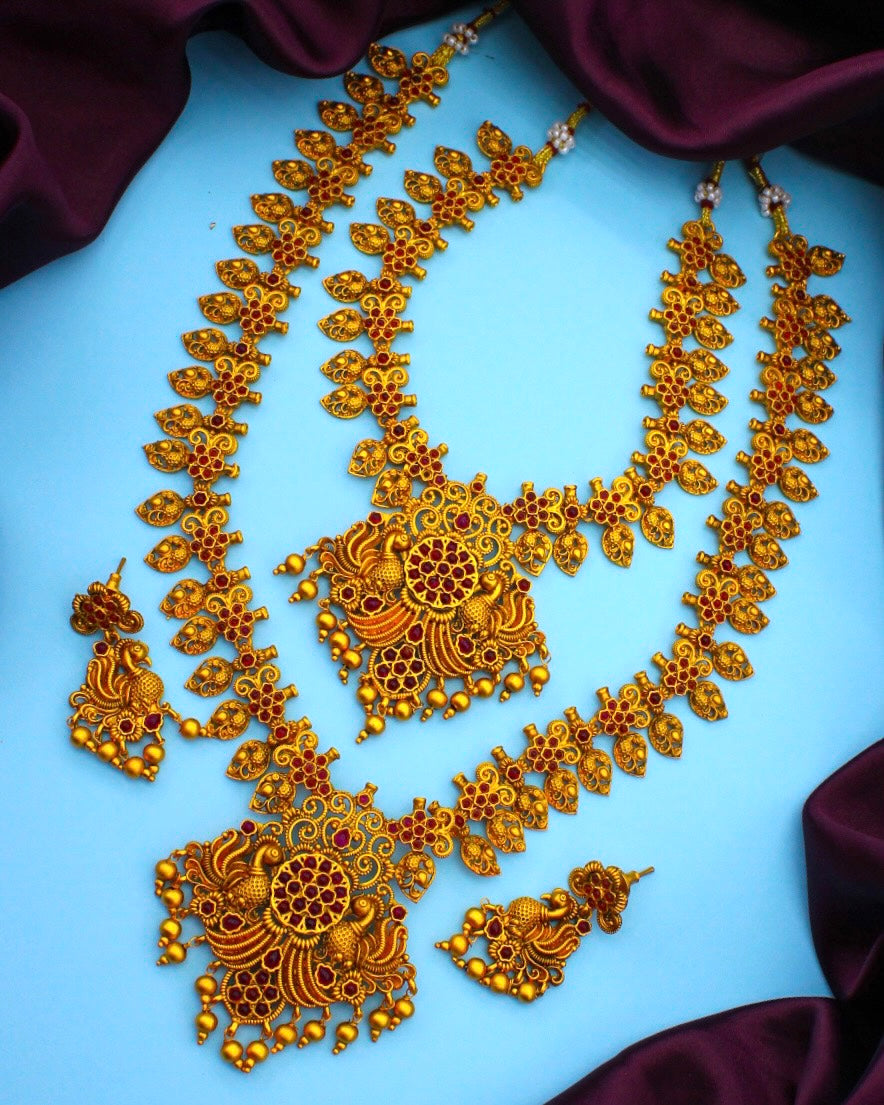 Have a Look special on south indian wedding day by adorning this pink, green, white colour classy jewellery Combo set. The ornaments are encrusted with kemp stones along with matte finish golden beads and made from matte golden finish metal. This combo set is superior in quality and will surely fetch you with lots of compliments from onlookers for your amazing choice.