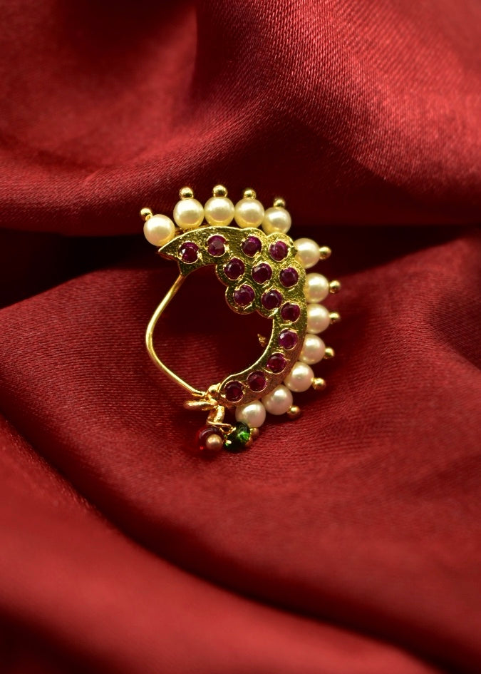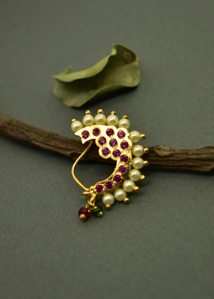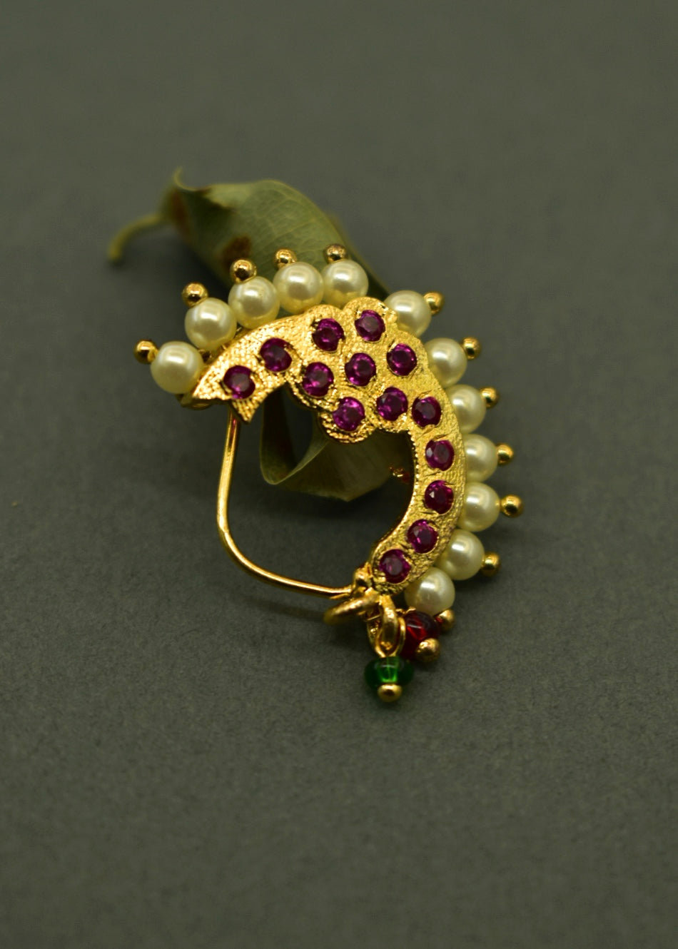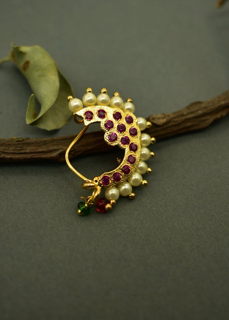 Adorable golden finish pink colored pearl designer nath for women by Sonchafa Jewellery. It is crafted from golden finish metal studded with beautiful pink stones. In addition it has red-green colored droplet beads.