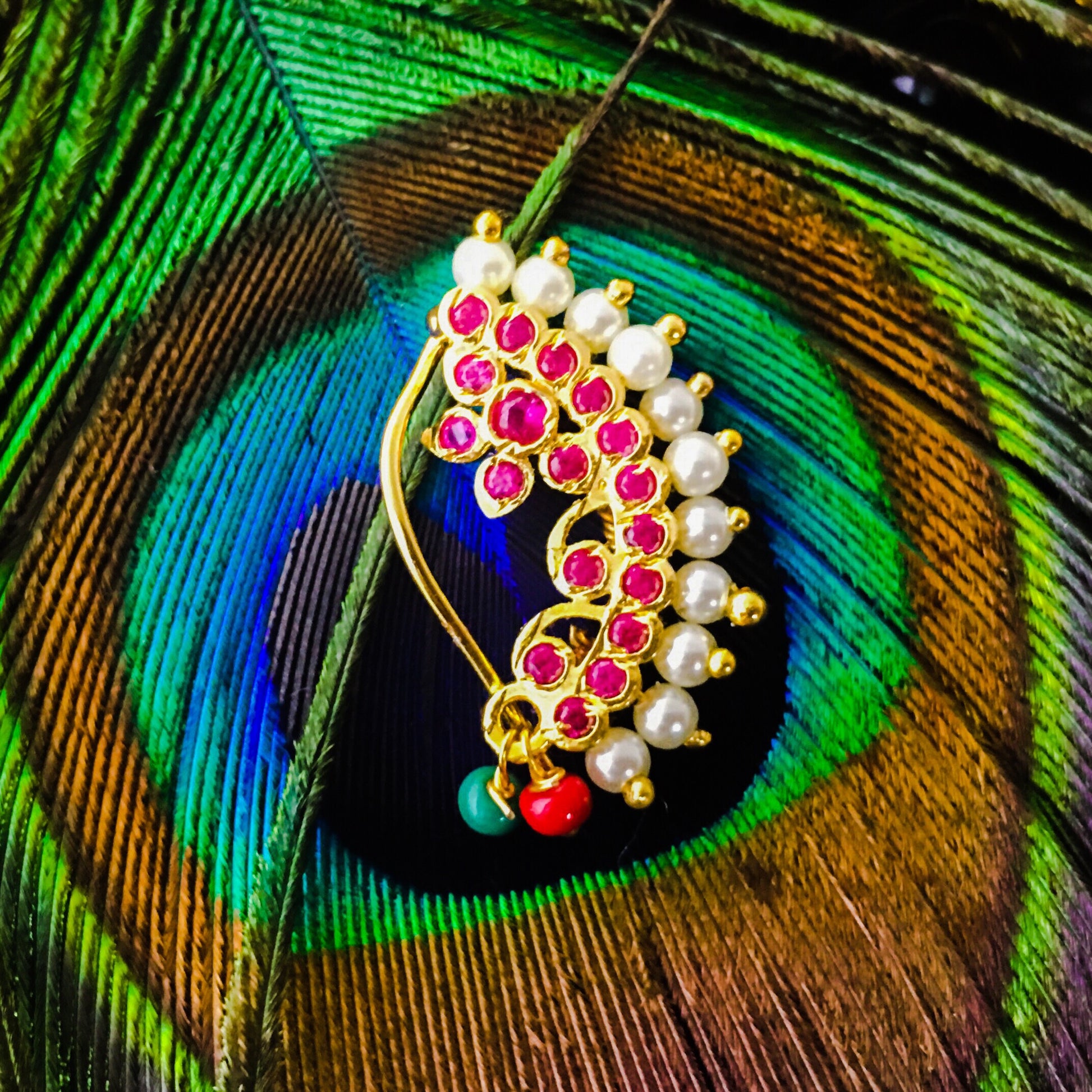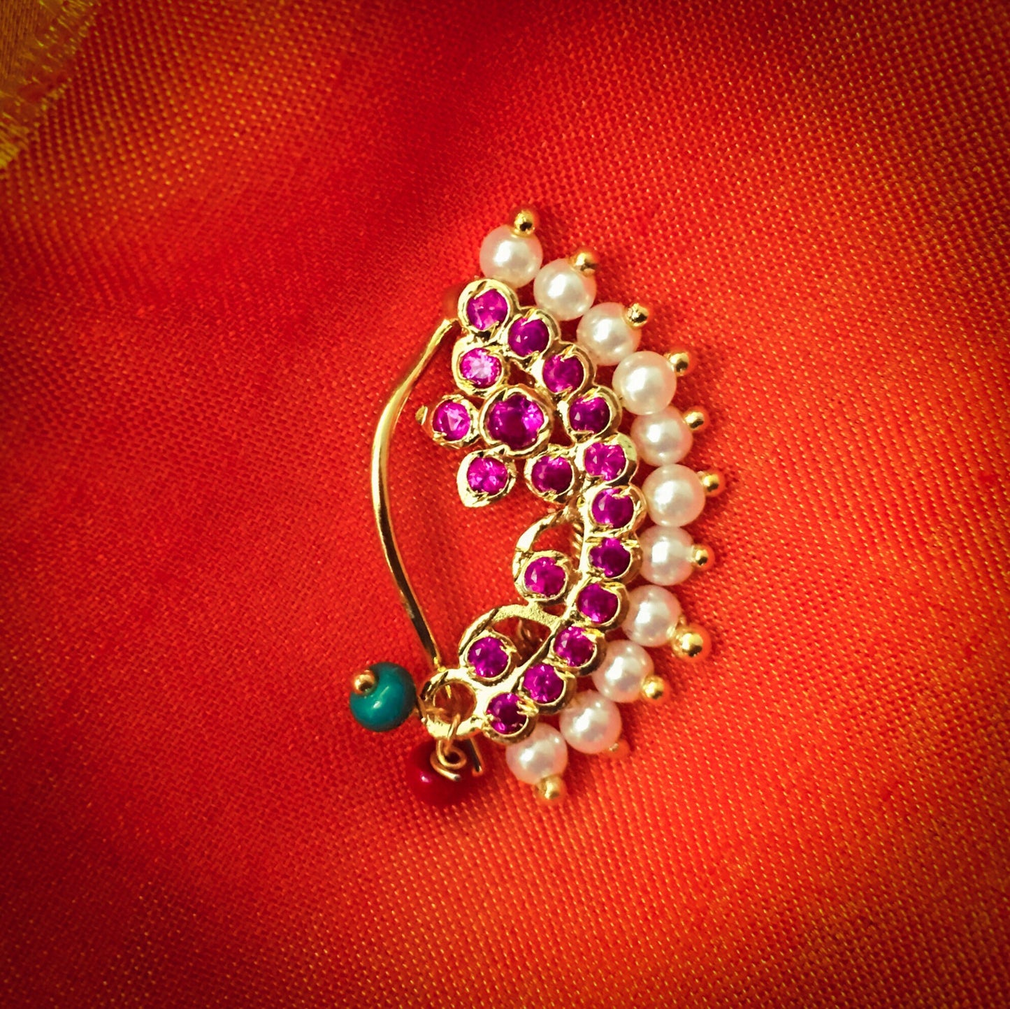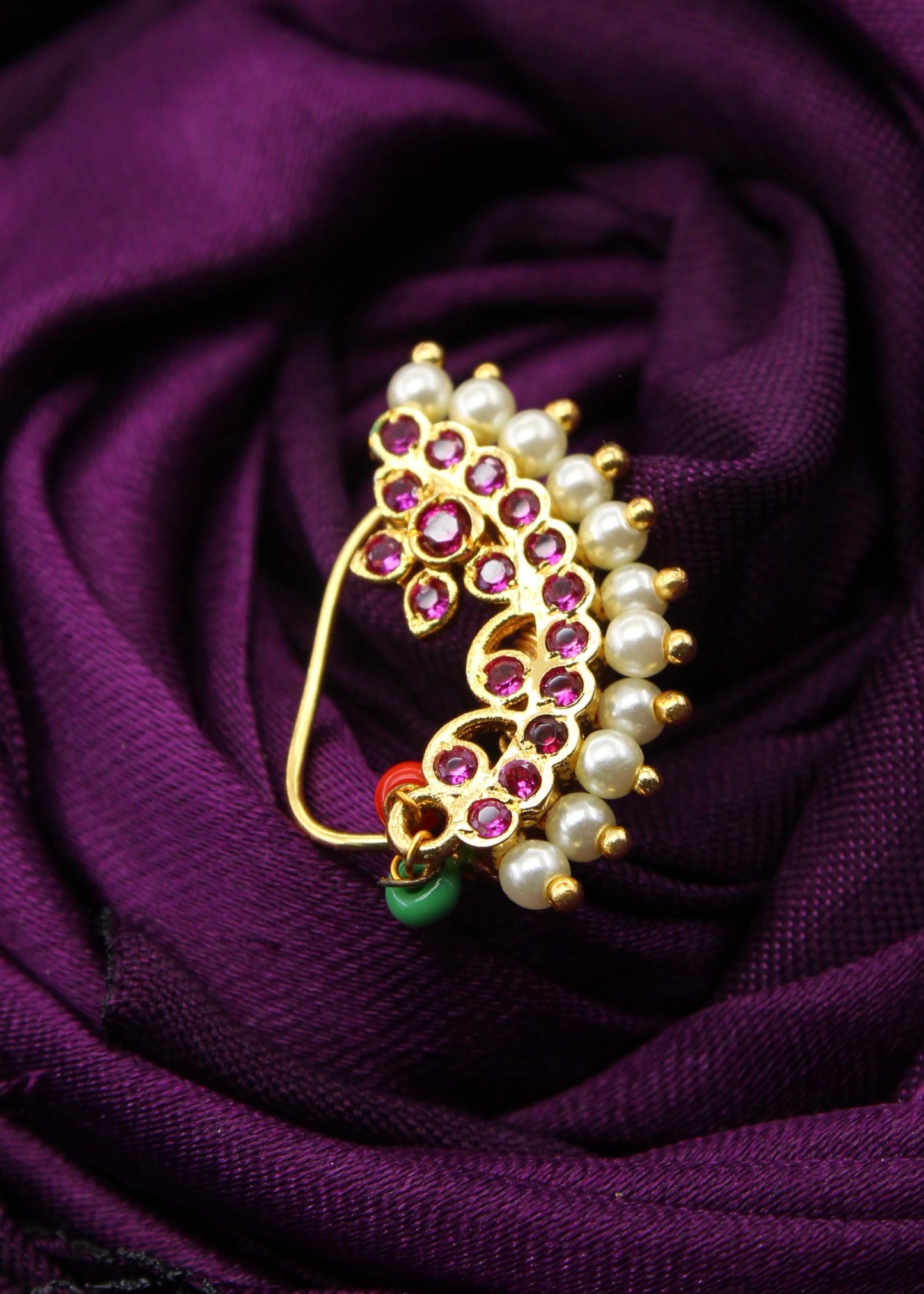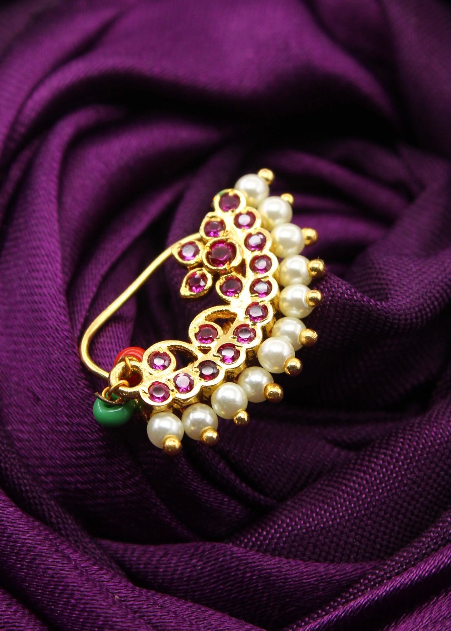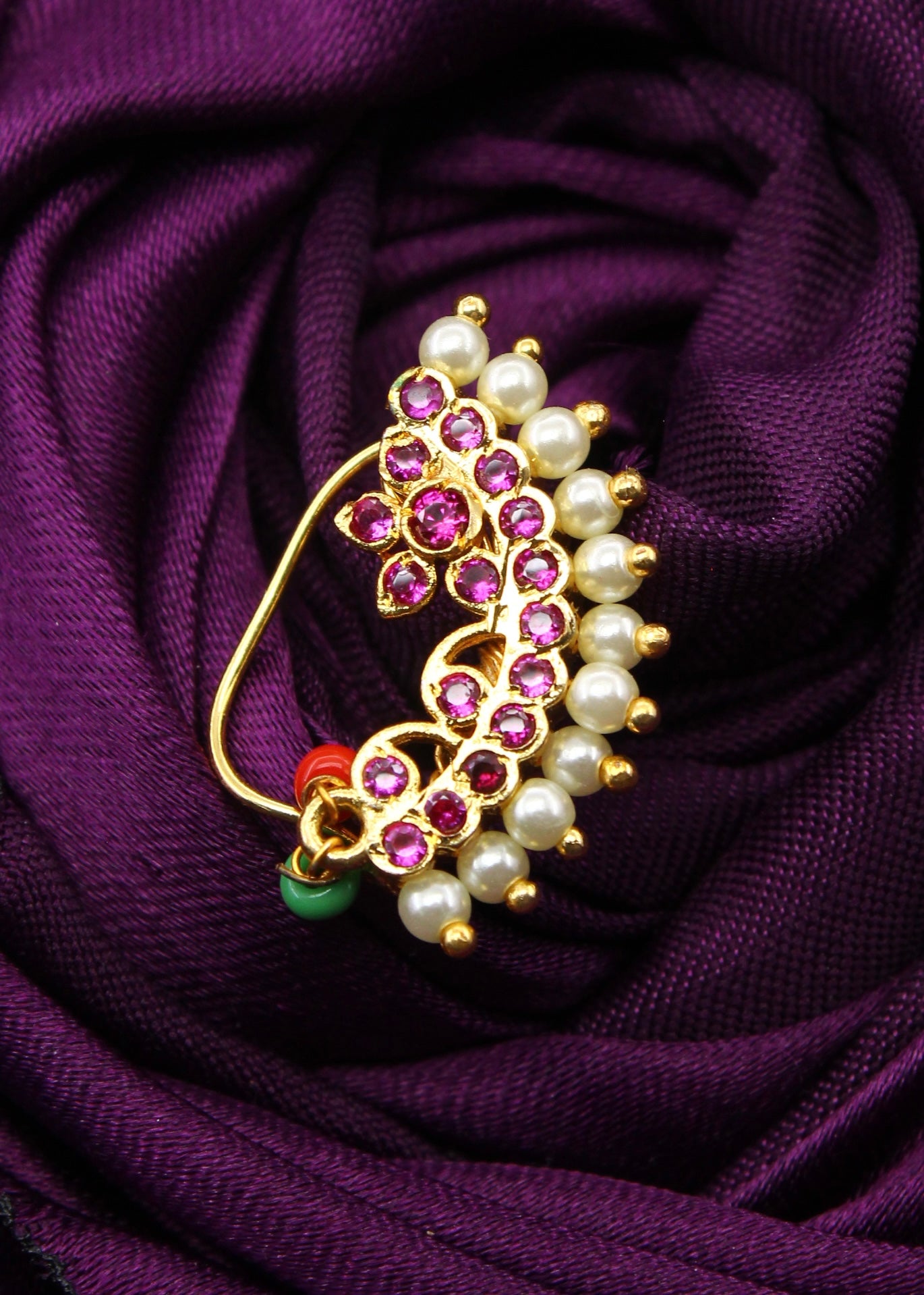 Sonchafa Jewellery brings to you this pink colour adorable Designer Banu nath in classic look. It is embedded with sparkling pink colour and studded with pearl beads. This nath is made from golden finish metal and ensure skin-friendliness. It is easy to wear it is clip-on.