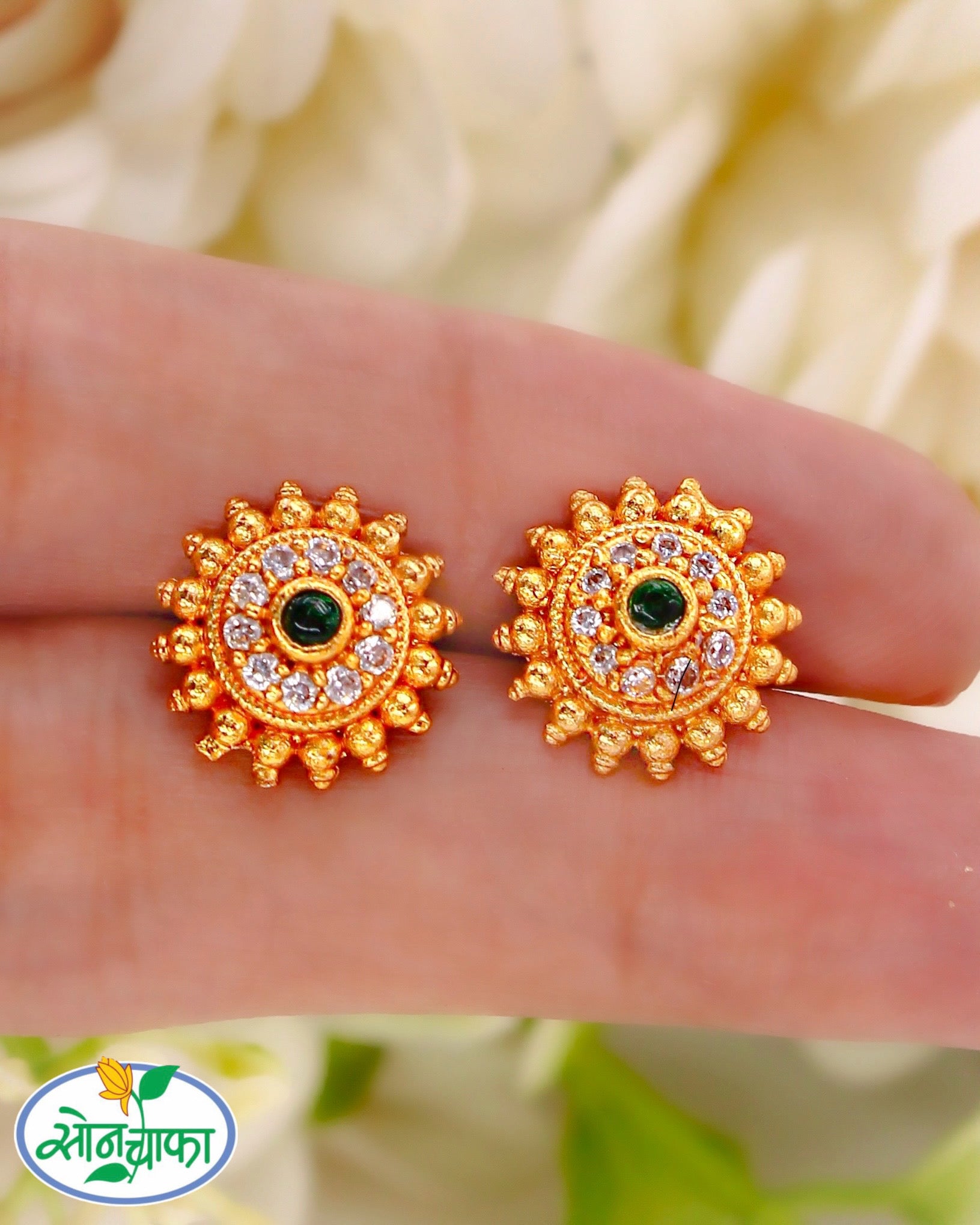 Flower inspired golden finish classy ear studs are best to team with traditional costume.