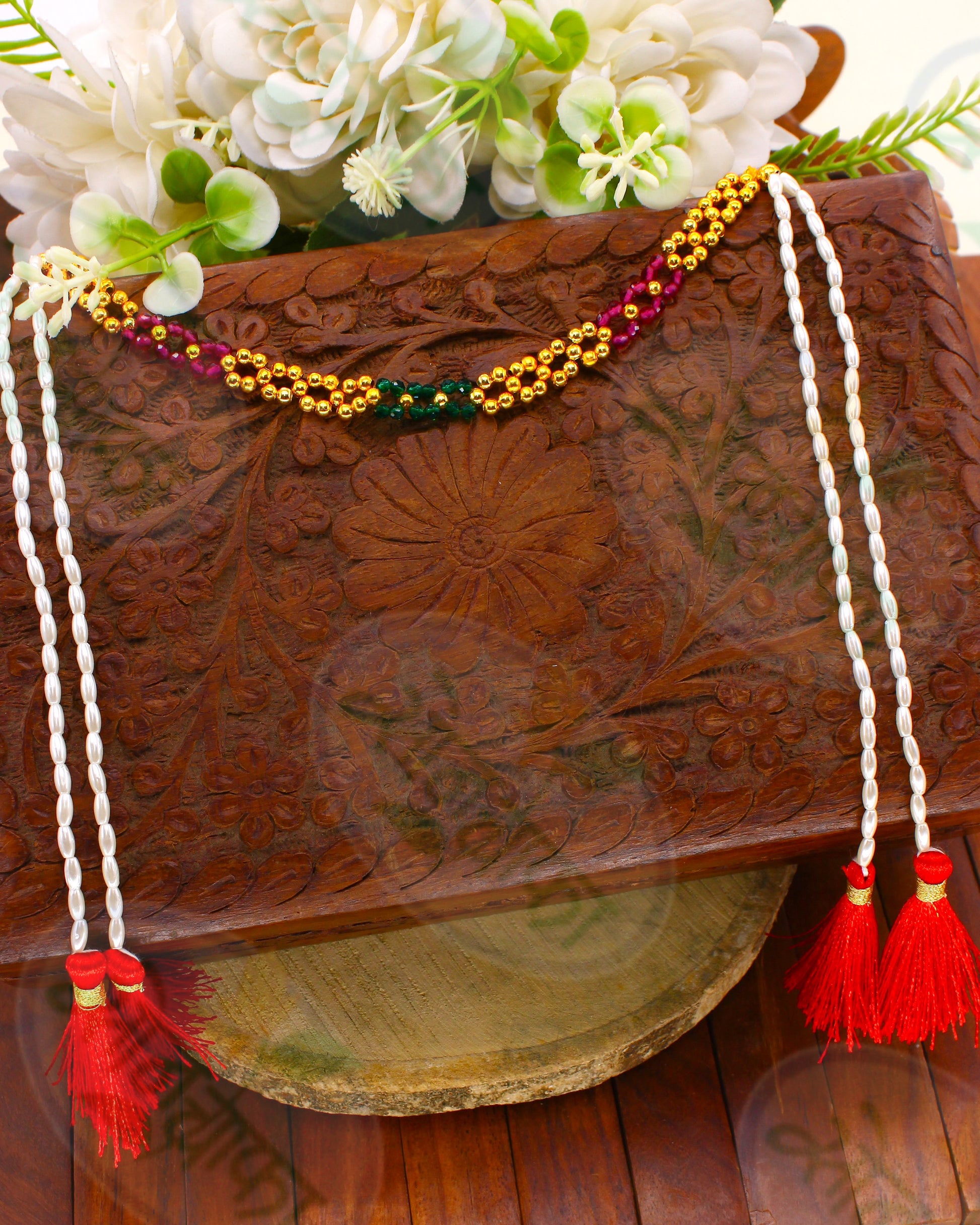 Complete your festive look by clubbing this adorable mudavlya with your occasional costume. It is studded with sparkling pink, green, golden beads along with pearl beads and made from golden finish metal. this beautiful is unique and worth-noticing.