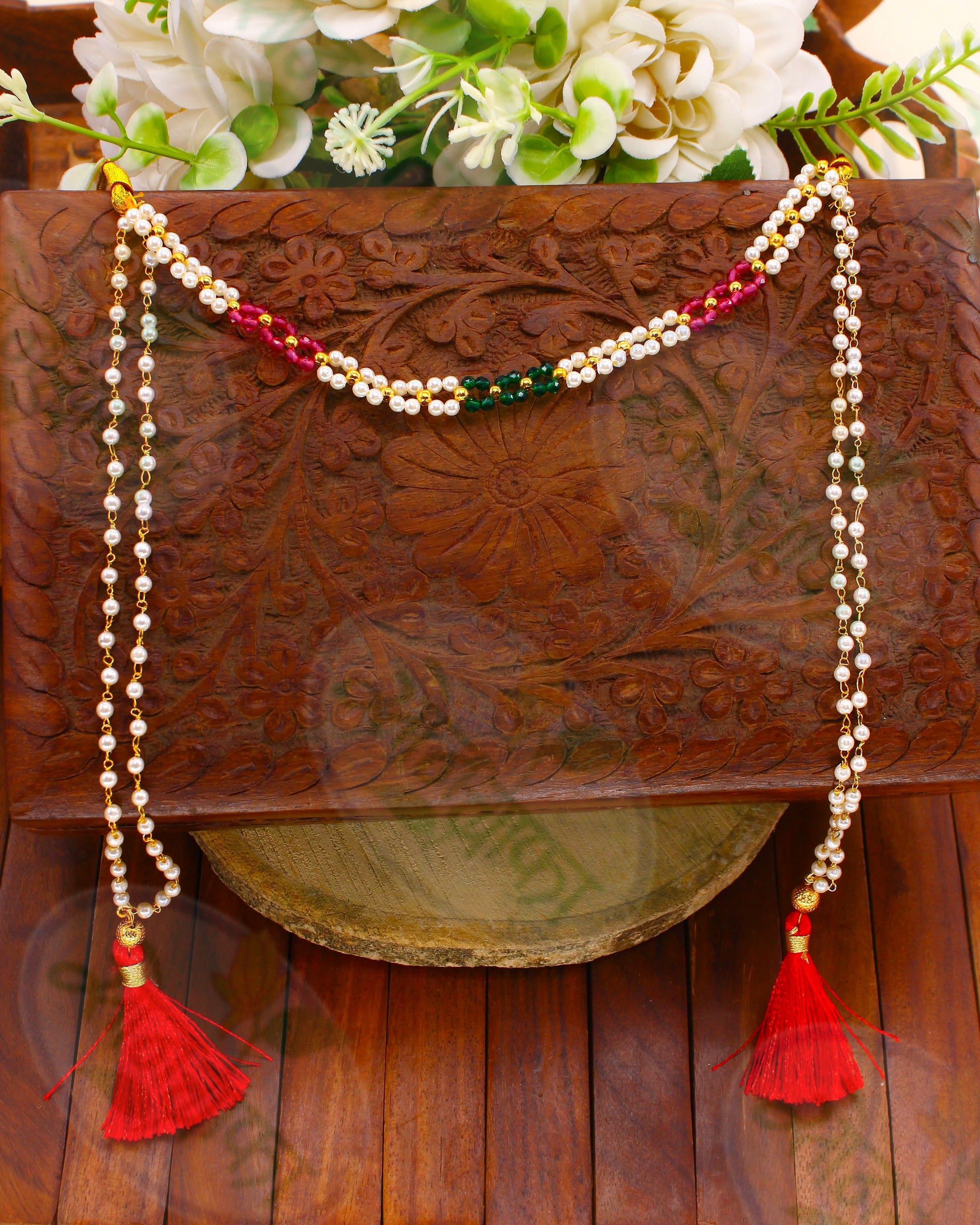 Complete your festive look by clubbing this adorable mudavlya with your occasional costume. It is studded with sparkling pink, green, golden beads along with pearl beads and made from golden finish metal. this beautiful is unique and worth-noticing.