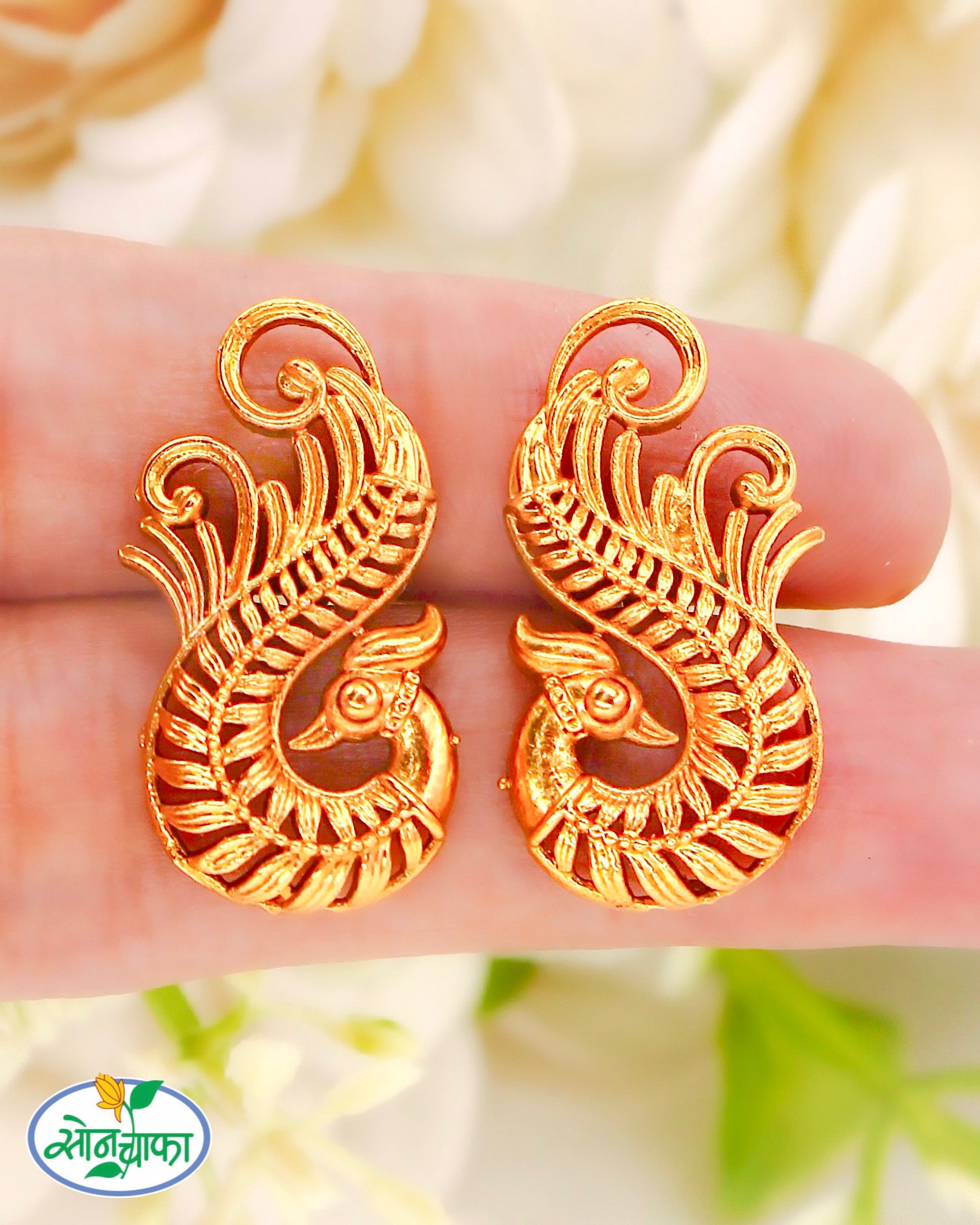 Flower inspired golden finish classy ear studs are best to team with traditional costume.