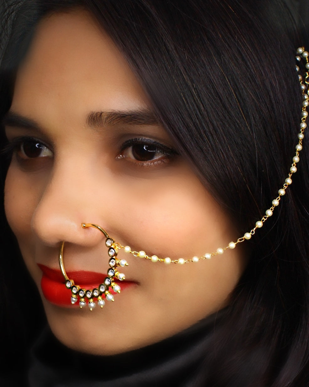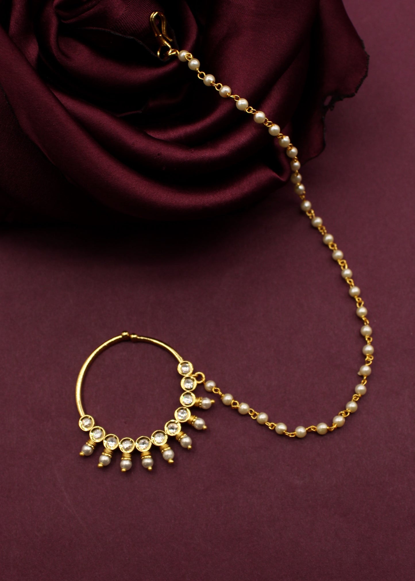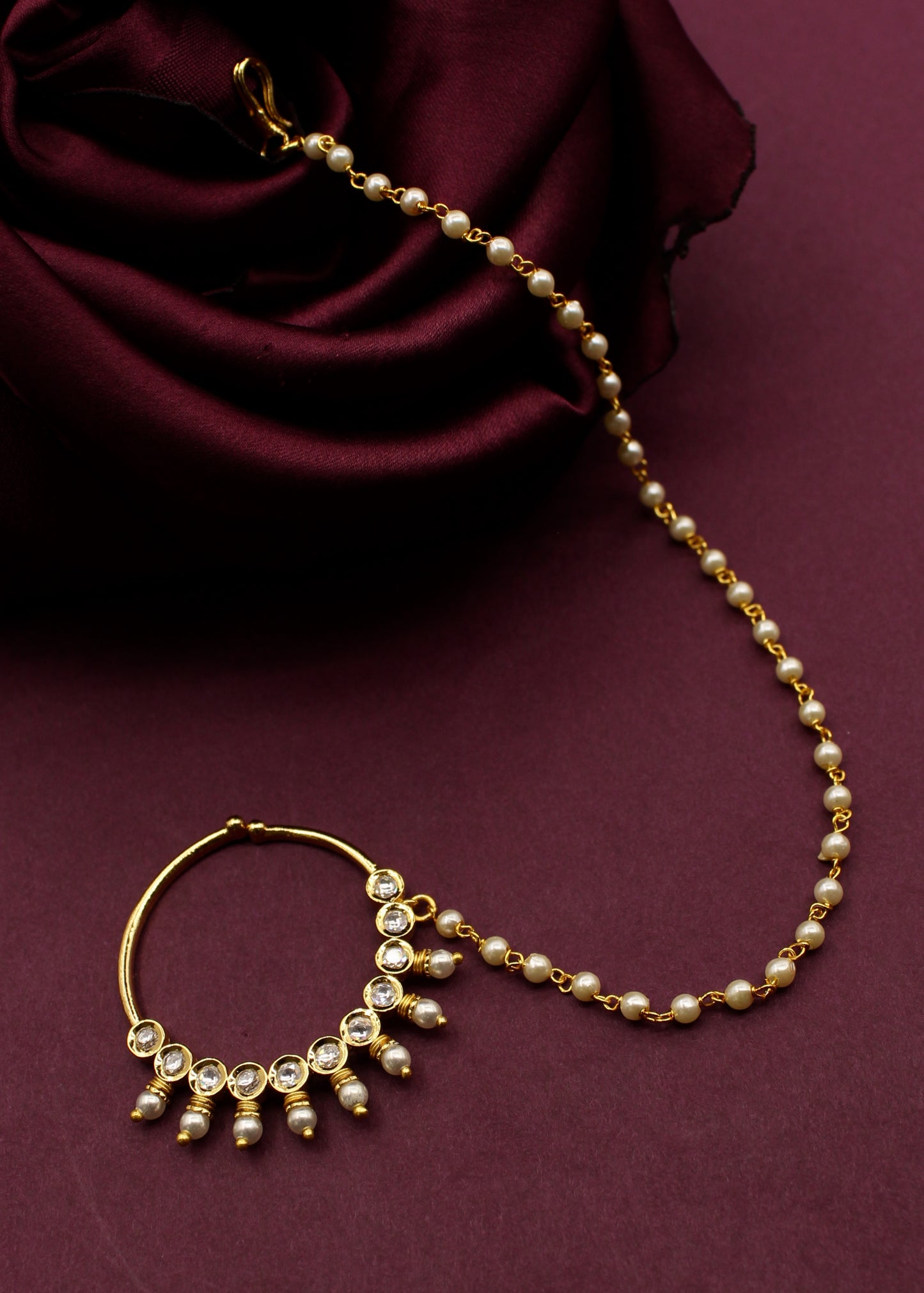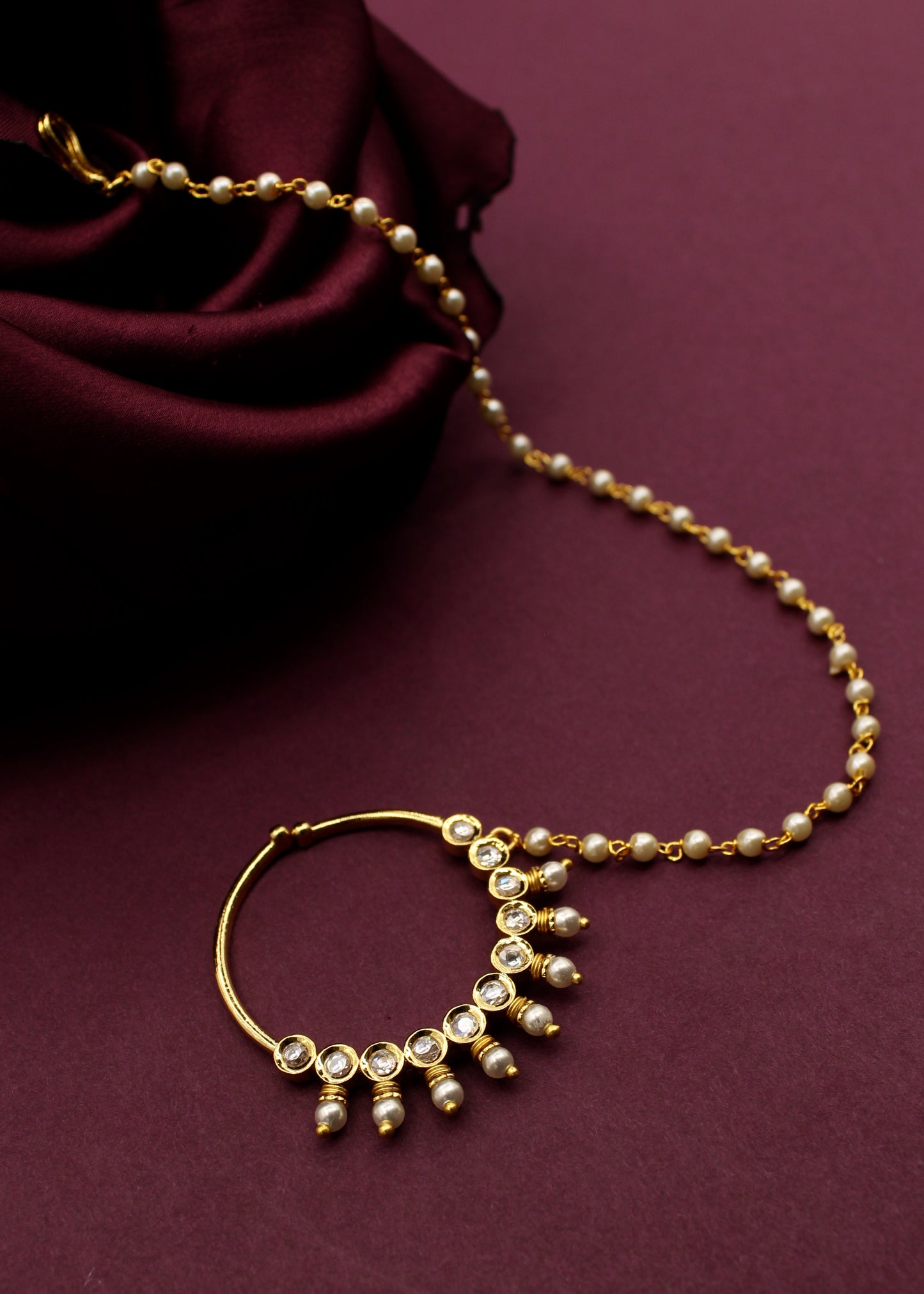 Add extra style and elegance to your appearance by adorning this golden finish appealing nose ring. It is encrusted with white kundan and has pearl bead droplet for added attraction. This nath has multiple golden strings. Excellent quality and high durability are the hallmarks.