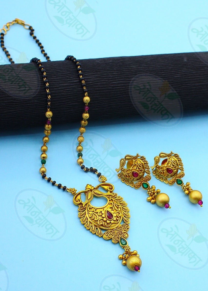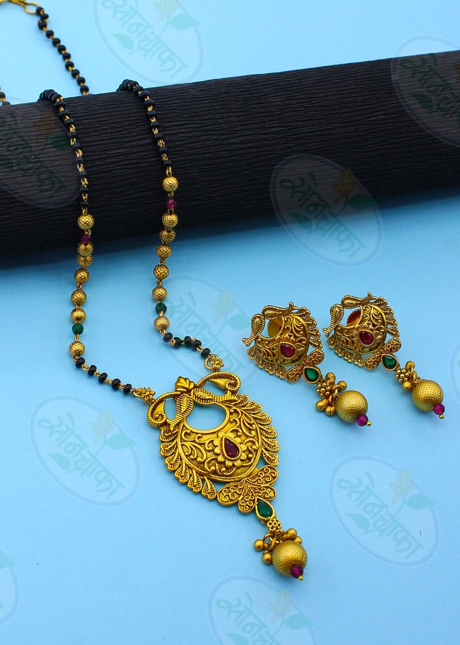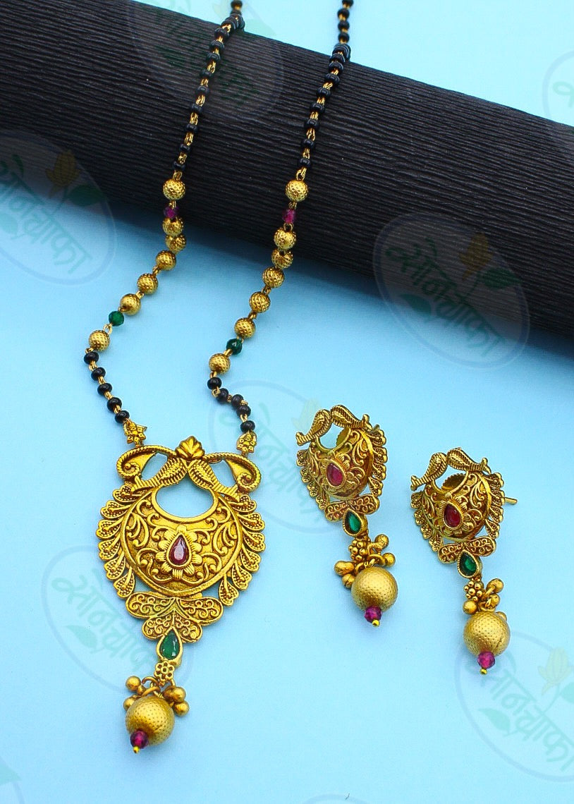 Married women will surely love to wear this antique gold finish beautiful mangalsutra set. The pendant is embedded with sparkling pink-green stones and feature eye-pleasing intricate carving design. It is crafted from gold finish metal and ensures high durability.