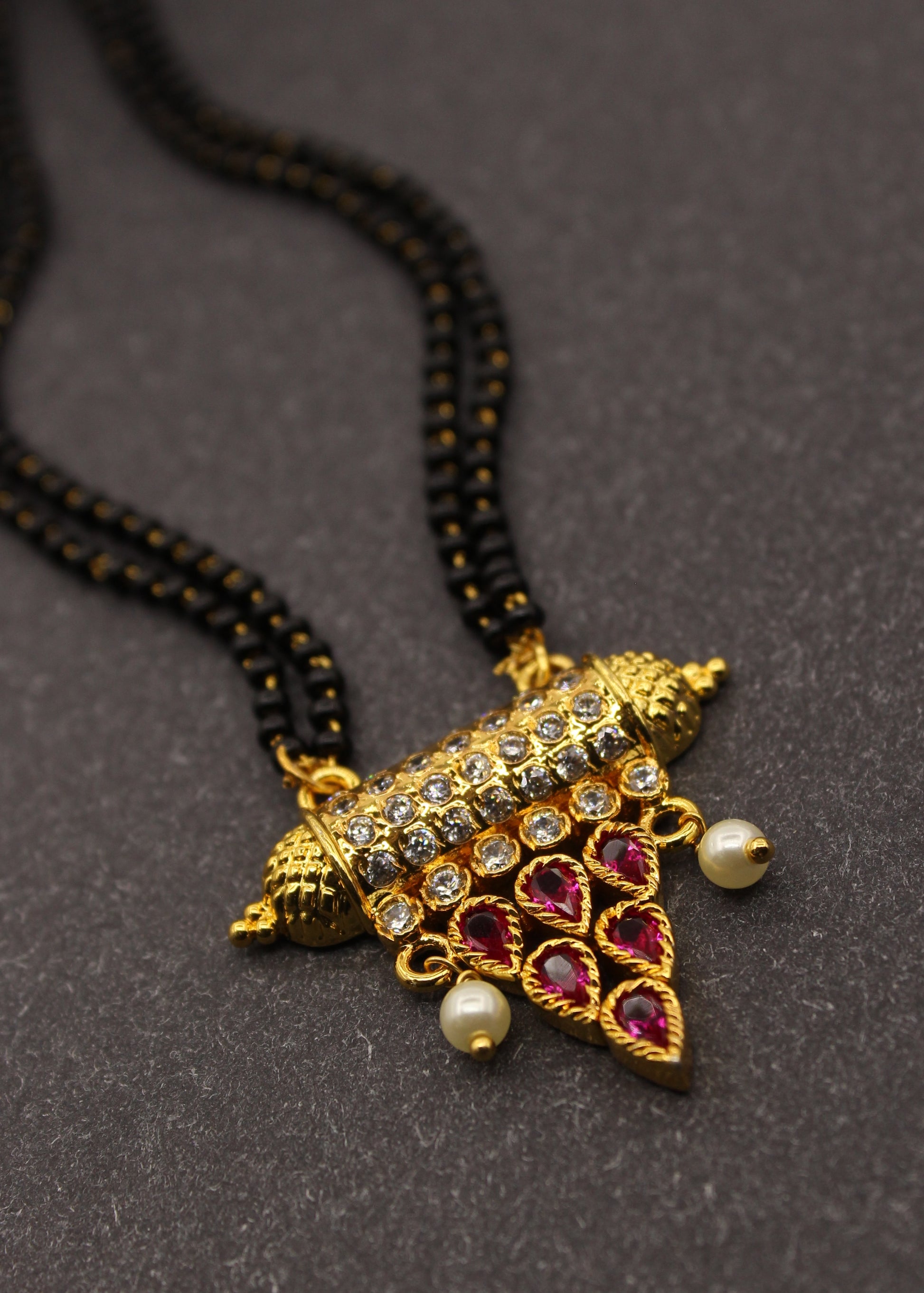 Golden finish adorable Moti mangalsutra from Sonchafa Jewellery is something which will make you look outstanding. This droplet design pendant mangalsutra is made from metal and ensures high durability. In addition it is woven with black colour beads. This delicate mangalsutra is easy to wear and light in weight as well.