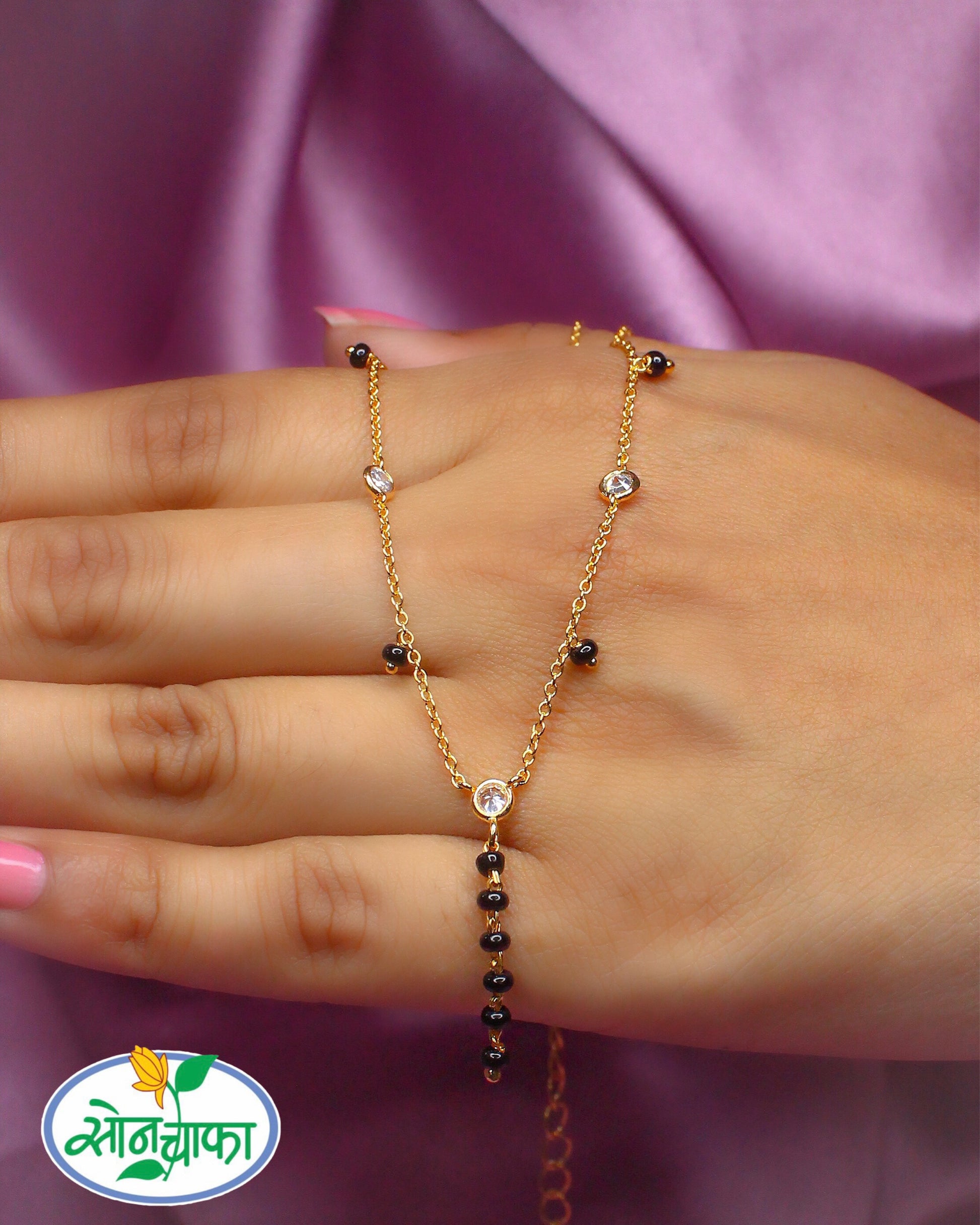 Married women must hold this adorable floral mangalsutra from Sonchafa Jewellery. It is studded with sparkling white stones and made from golden finish metal. The floral pendant is attached to adorable black beaded single layer chain and ensures high durability.