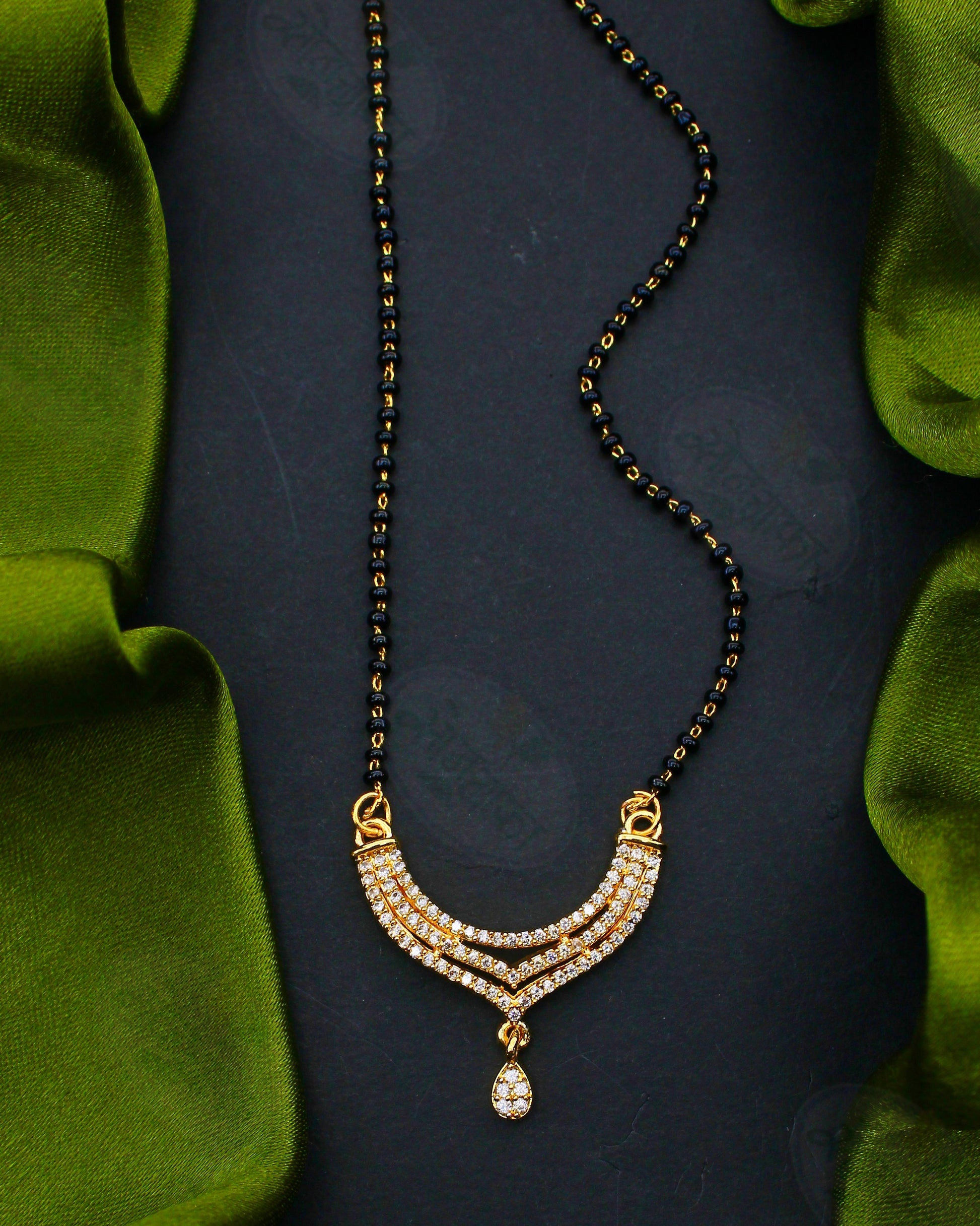 Gold finish designer mangalsutra set from Sonchafa Jewellery will strike you at very first look. This mangalsutra styled with precious dia diamonds stone and made from golden finish metal. It is easy to use and comfortable to hold all day long.