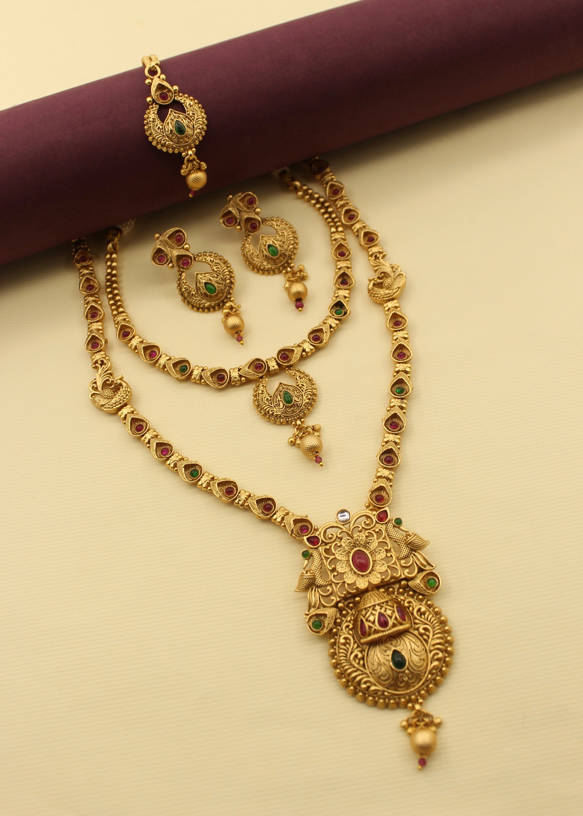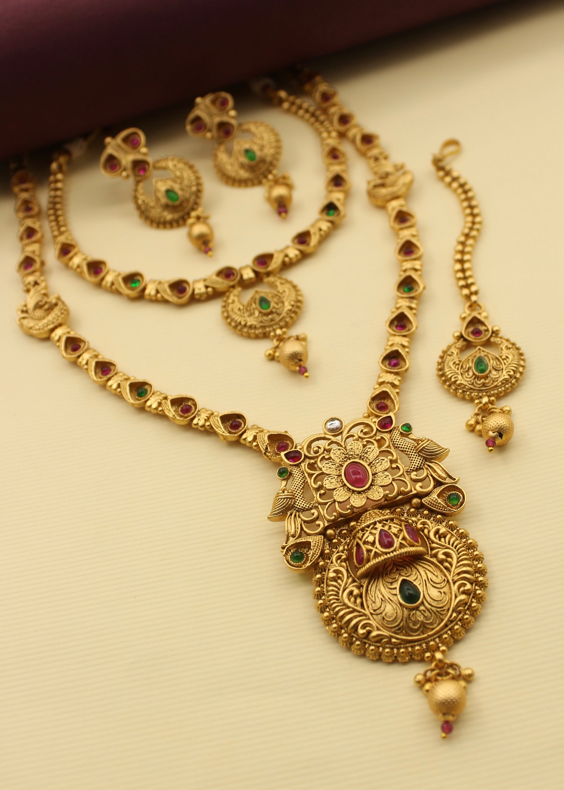 This beautiful peacock with floral designer combo set from Sonchafa Jewellery is best to team with your occasional costumes. This necklace set is studded with pink, white, green stone and made from good quality metal. It has dangled golden beads for more attraction. This necklace set is high in quality and will be your fashion companion for many years