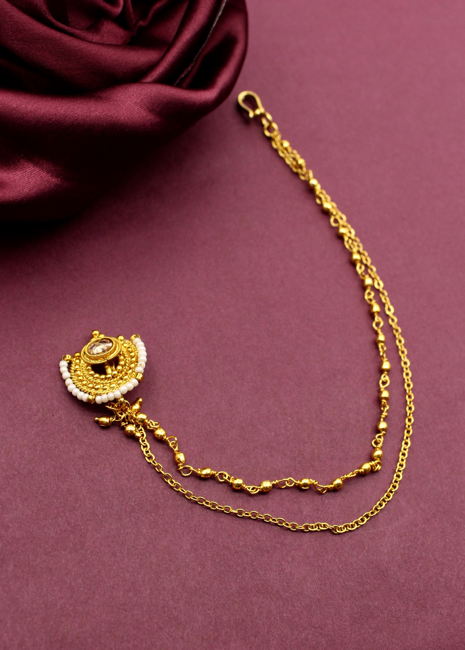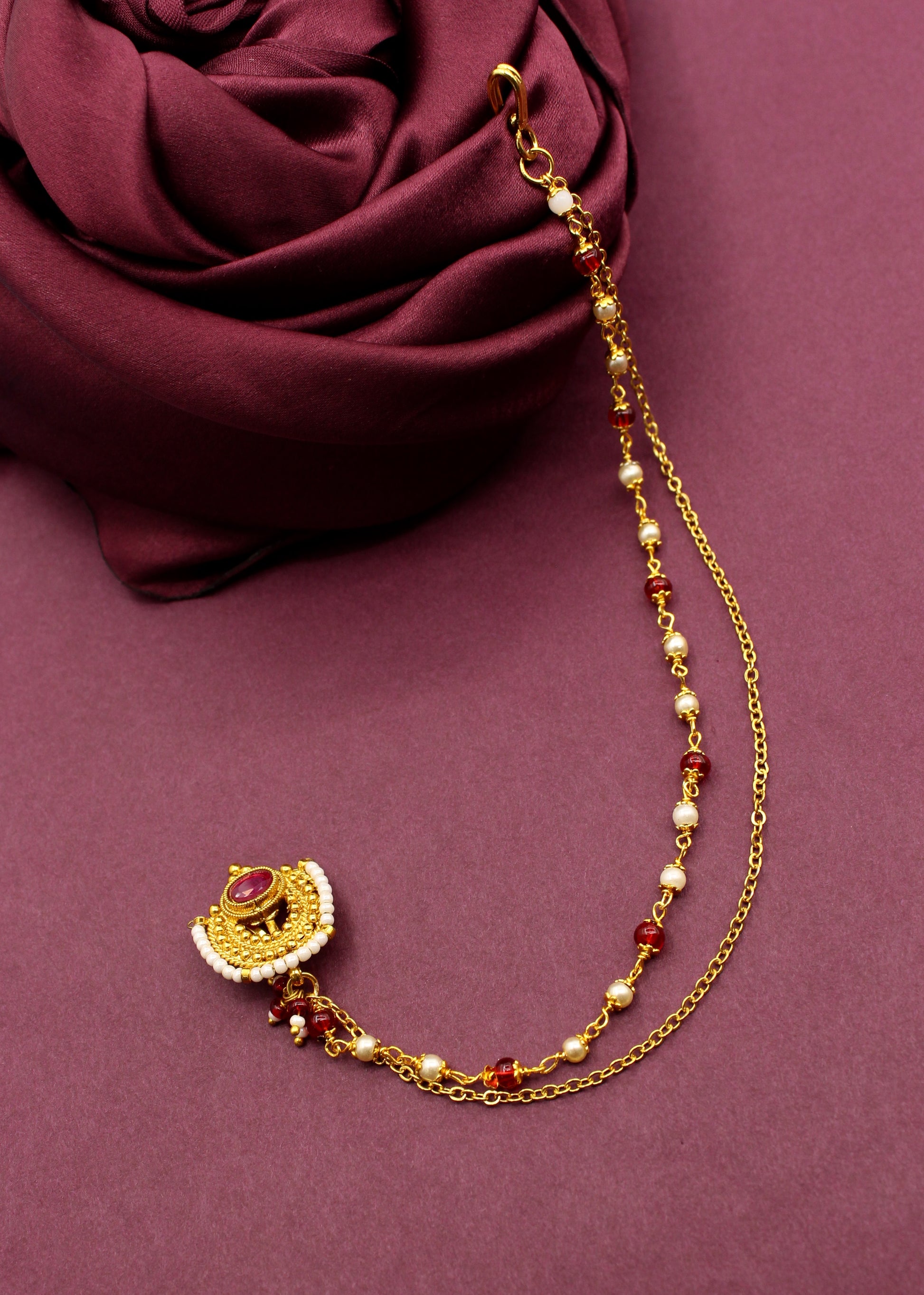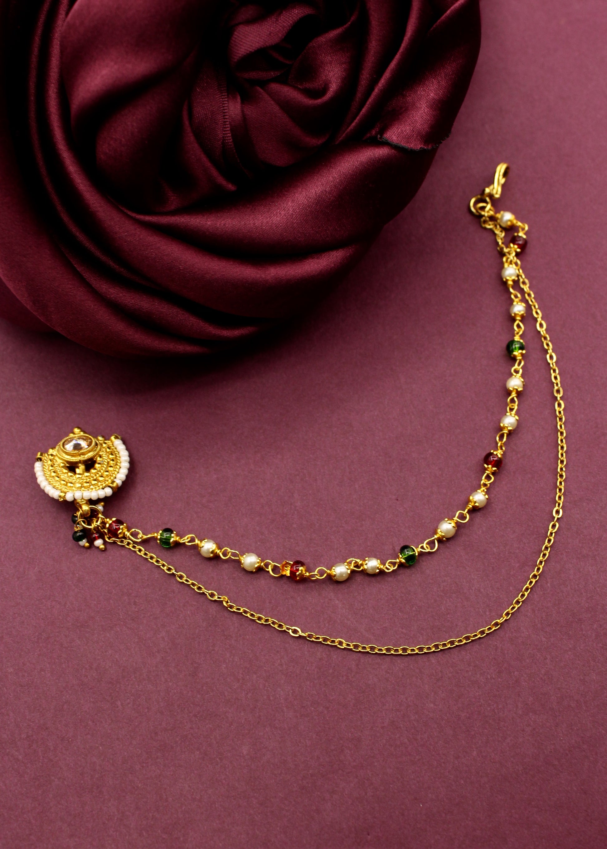 A nath is a classic jewellery piece that looks super elegant with traditional Maharashtrian outfits. Crafted with highly durable golden finish metal, this designer nath is embedded with maroon colour stones. This press on nath is styled with maroon, green beads droplets at the bottom.