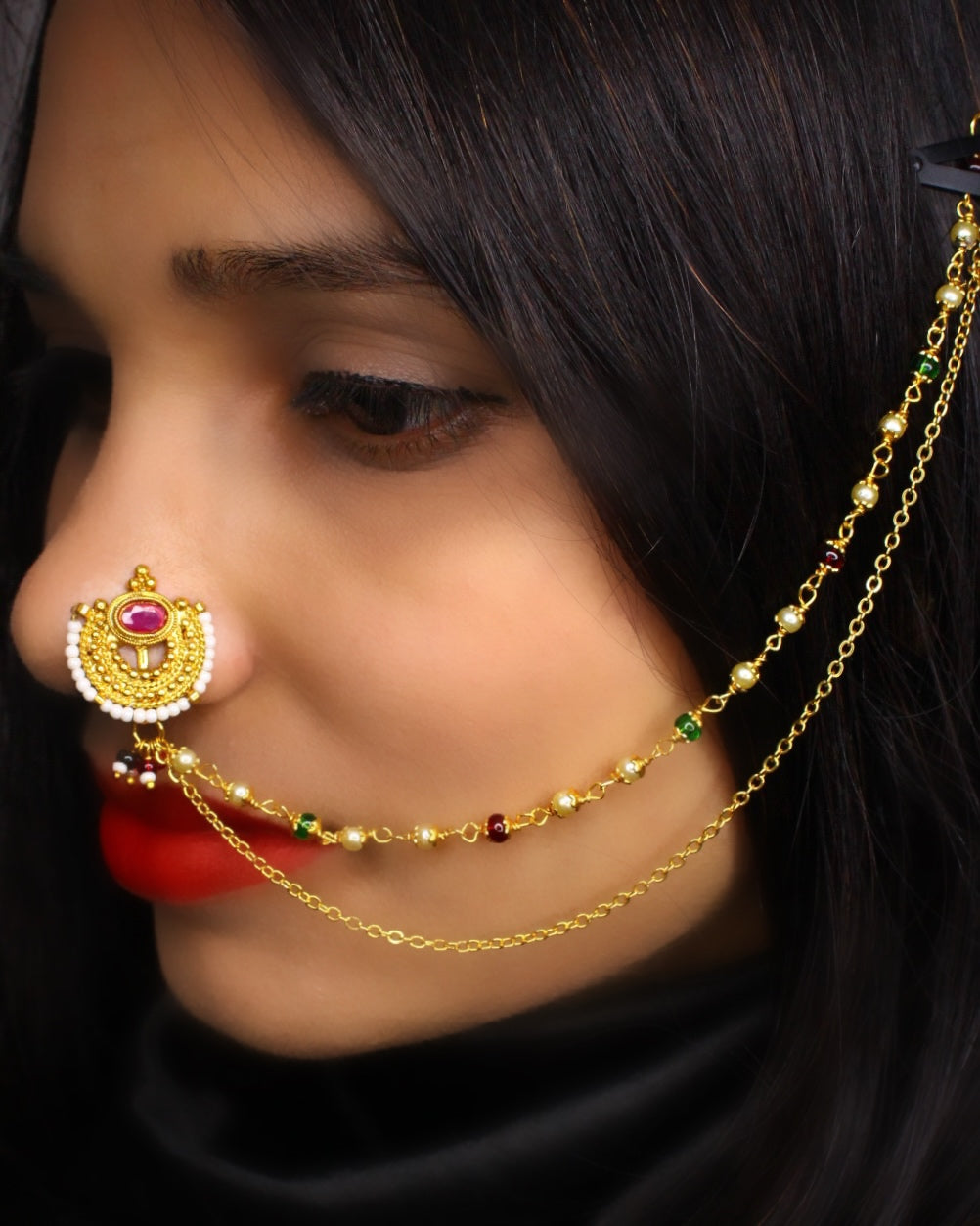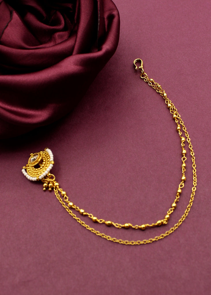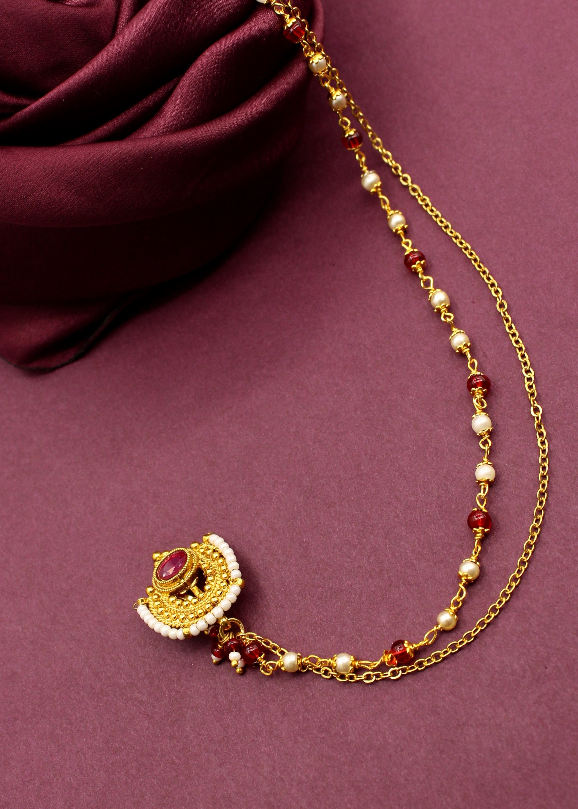 A nath is a classic jewellery piece that looks super elegant with traditional Maharashtrian outfits. Crafted with highly durable golden finish metal, this designer nath is embedded with maroon colour stones. This press on nath is styled with maroon, green beads droplets at the bottom.