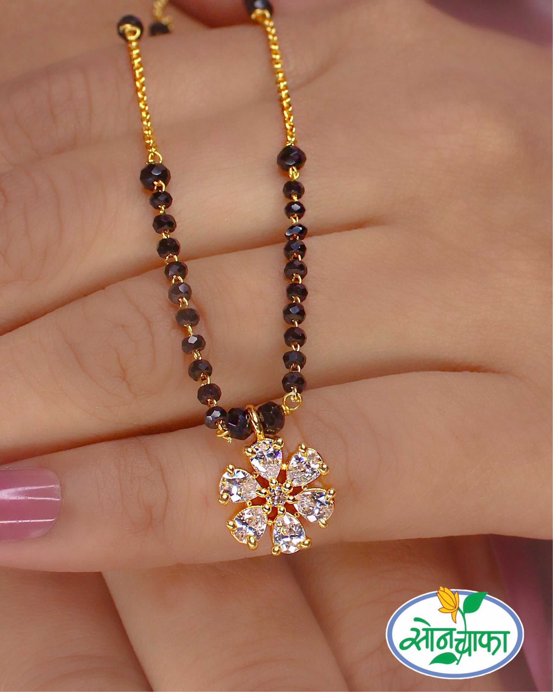 Buy something stylish for yourself in the form of this adorable mangalsutra from Sonchafa Jewellery. It is studded with sparkling stones and feature wonderful design. This mangalsutra is made from metal and ensures high durability. It has attachment of double layers of black beaded chain.