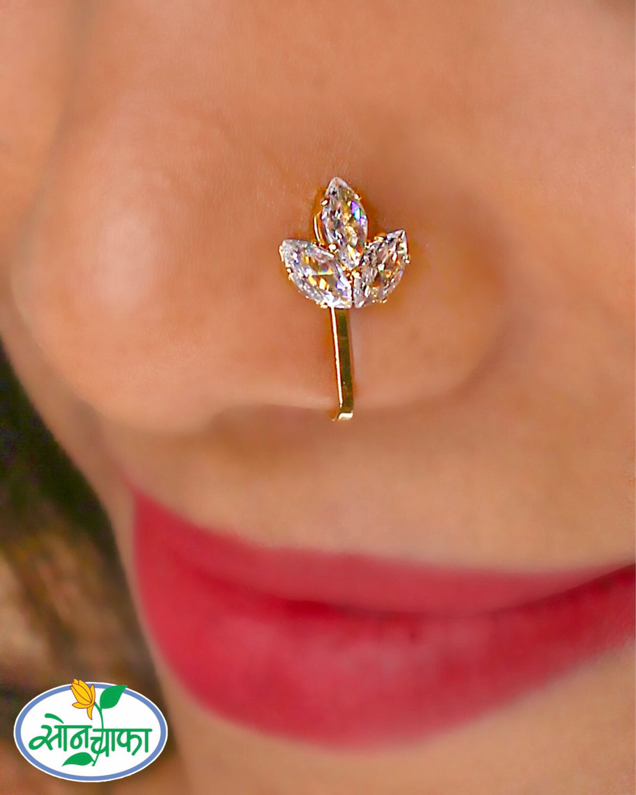 Stylish square designer nose pin form sonchafa Jewellery which is perfectly match our traditional look. It is styled with studded white stone & made from metal and ensures skin-friendliness.